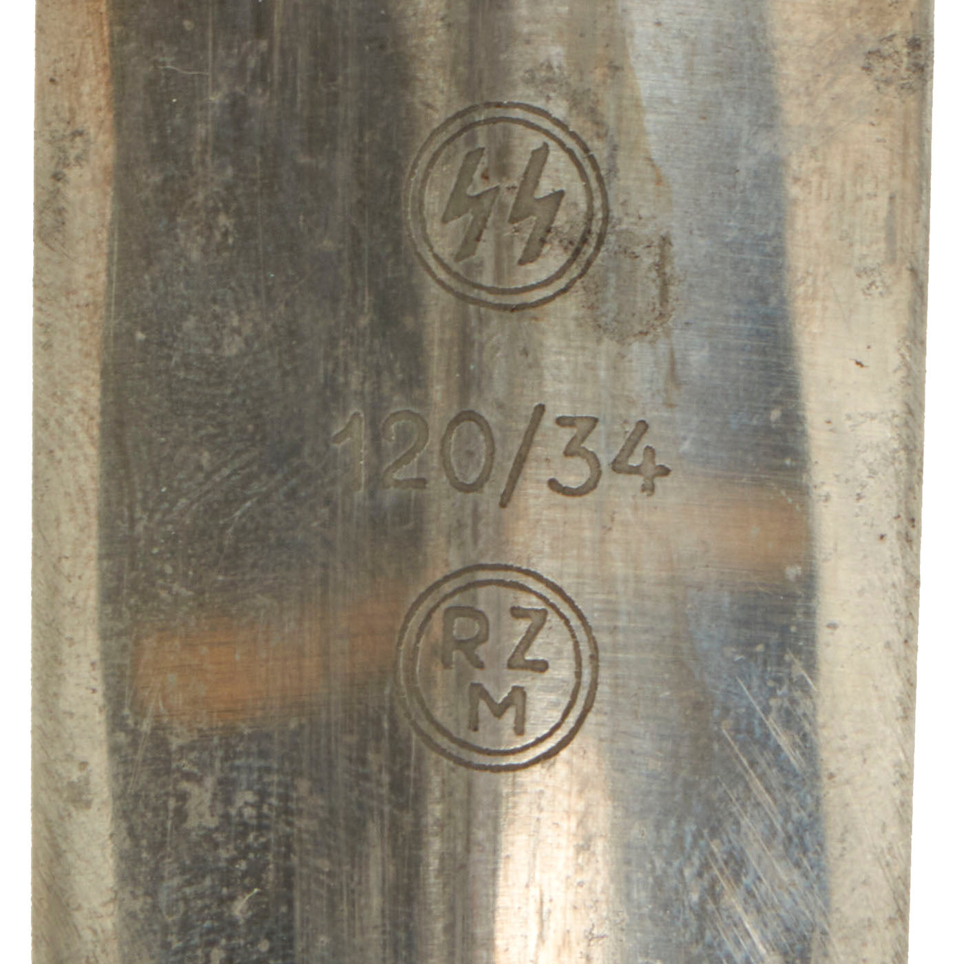 This indicates that the blade was made by SS contractor "120" in 1934. We have looked far and wide, but there are no records of which company made these blades. Theories point to Julius Krebs, but there is nothing definitive. The etched SS motto, Meine Ehre heißt Treue (My honor is loyalty) is crisp however cleaning has made the factory darkening very faint. The blade shoulders perfectly meet the lower crossguard contour, and has just a bit of wobble.