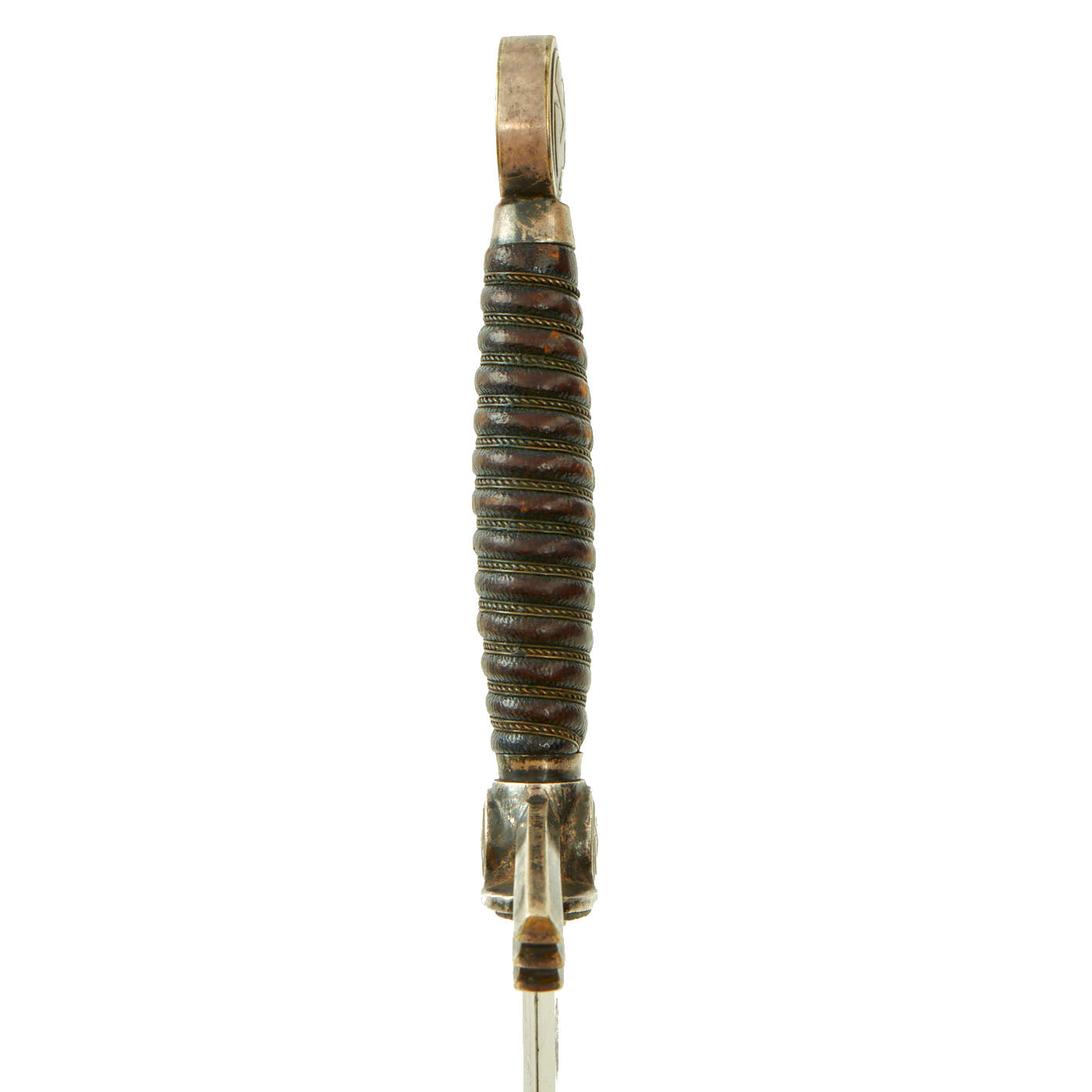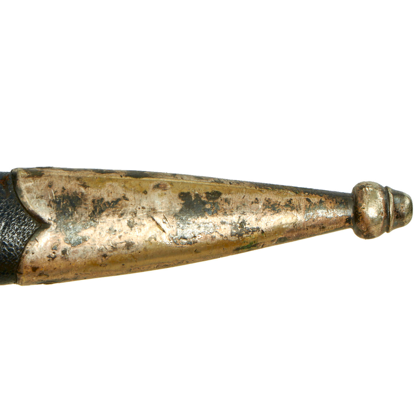 The grip on this early example looks to be made of nickel alloy, which still has a good amount of the silver plating, now tarnished to a lovely patina. The pommel has inlaid brass "Sunwheel" style swas (hook cross) emblems. The sides are only slightly vaulted, less so than later pattern daggers we have seen. The grip is a carved wood base covered in blue Moroccan leather, which shows wear to the finish, but no tears or exposed wood. The original quadruple wire wrapping, with the center pair twisted, is still fully intact, with a lovely oxidized patina. The guard is the standard down swept "wing" type, with good detailing remaining, and with more "sunwheel" swas's, which are slightly vaulted, like on the pommel. The oxide coating is very well retained on the guard, probably one of the best we have seen.