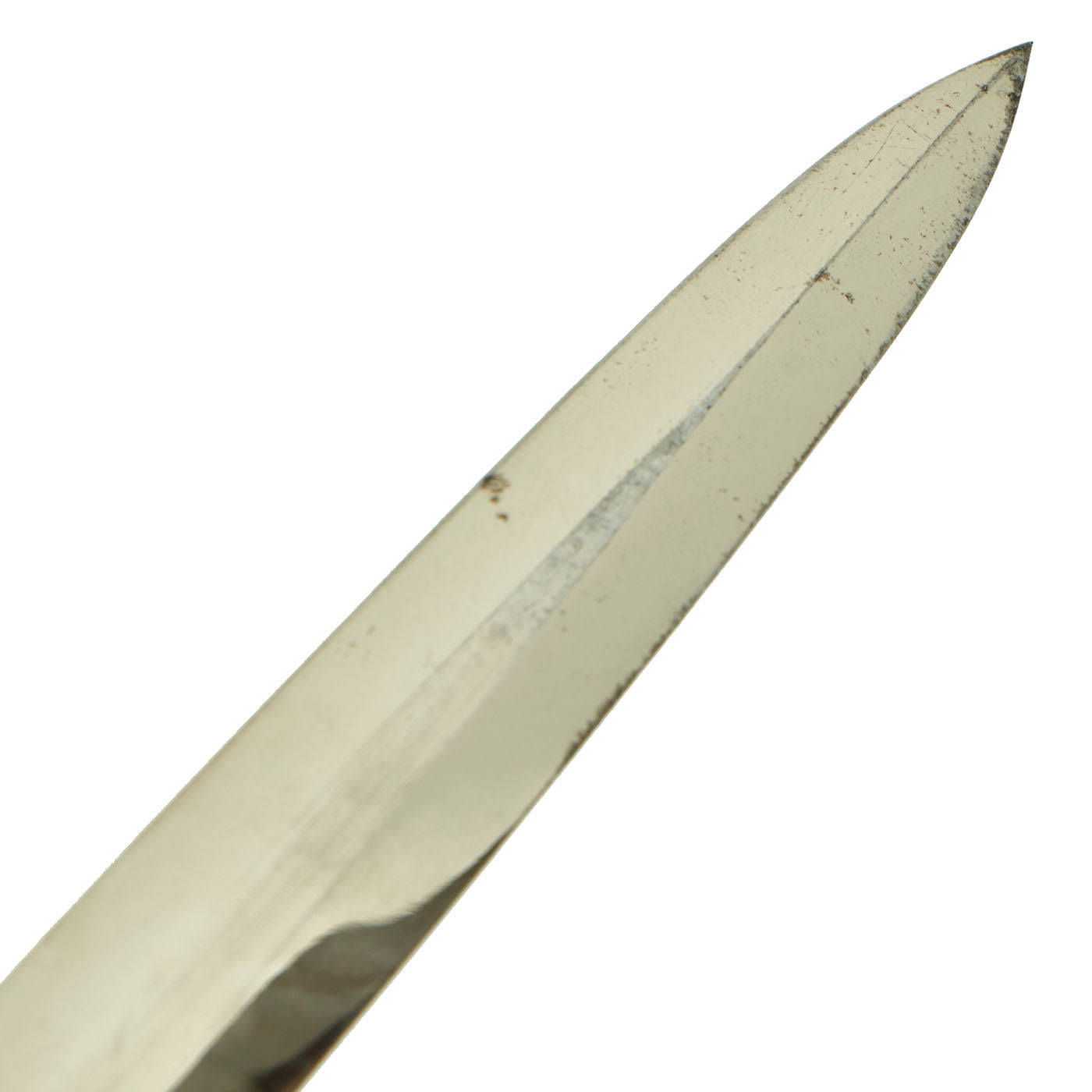 The blade of this piece is a high quality nickel-plated example, and is in very good condition. It shows the usual runner wear, present on just about every German dagger out there, but otherwise the plating is in really good condition. There is a bit of oxidation spotting, and the tip of the dagger does have some plating loss. There is also just a bit of bubbling near near the markings. The original blue leather blade buffer is still present, and in very good condition.