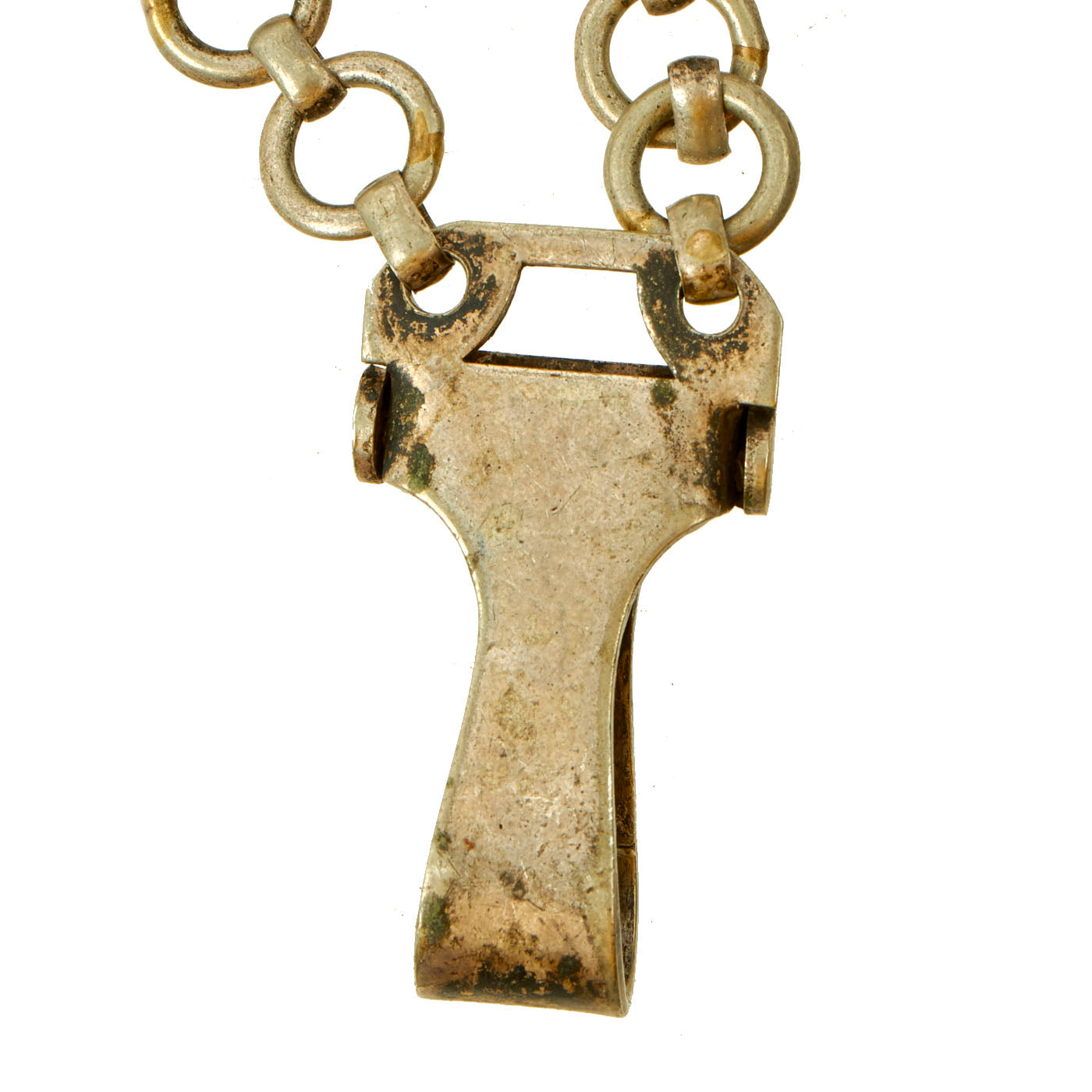 The attached hanger chain has nine ringlets making up the upper chain and fourteen on the lower, not counting the rings attached to the scabbard fittings. These look to be made from either solid nickel alloy or plated brass, and show brass where the rings are brazed closed. They are attached to a plated nickel snap clip with a flat steel spring.