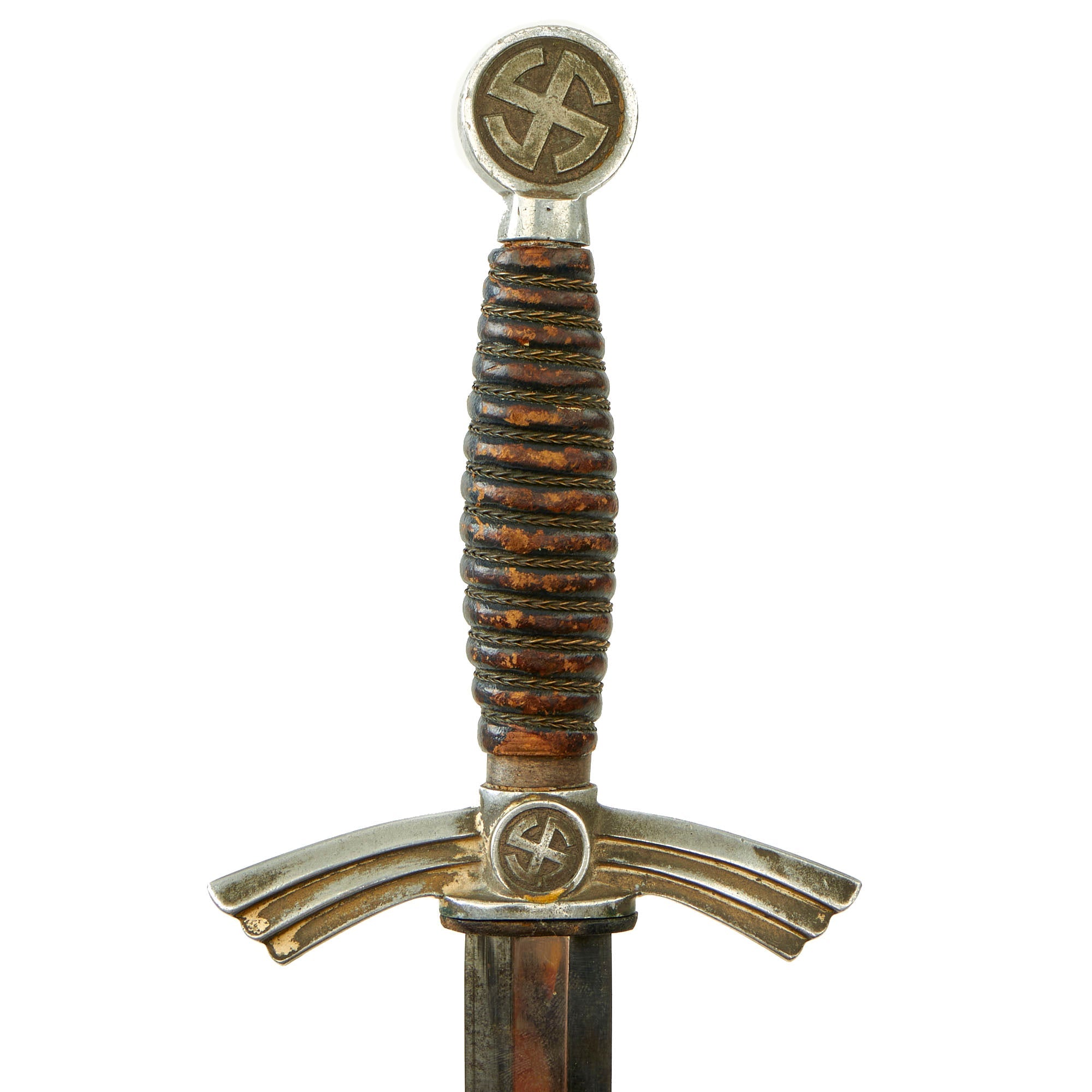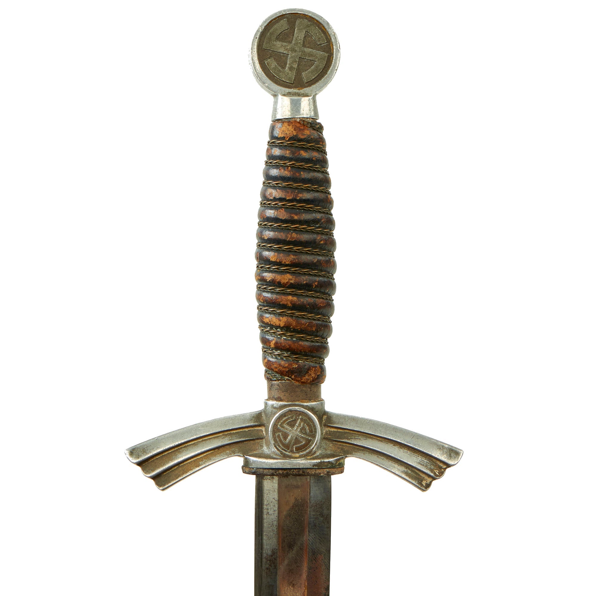 Original Item: One of a Kind. This is a lovely service used 1st Model Luftwaffe Dagger made in in the late 1930s, made by the well-known Solingen-based firm of Ernst Pack & Söhne under their "Siegfried" brand name. It has the earliest pattern fittings on the blade and steel scabbard, which nickel and aluminum alloys, which were both plated and then coated with a type of blue oxide finish. As the finish ages, it gives them a lovely patina from the degradation of the top finish, as well as the plating.