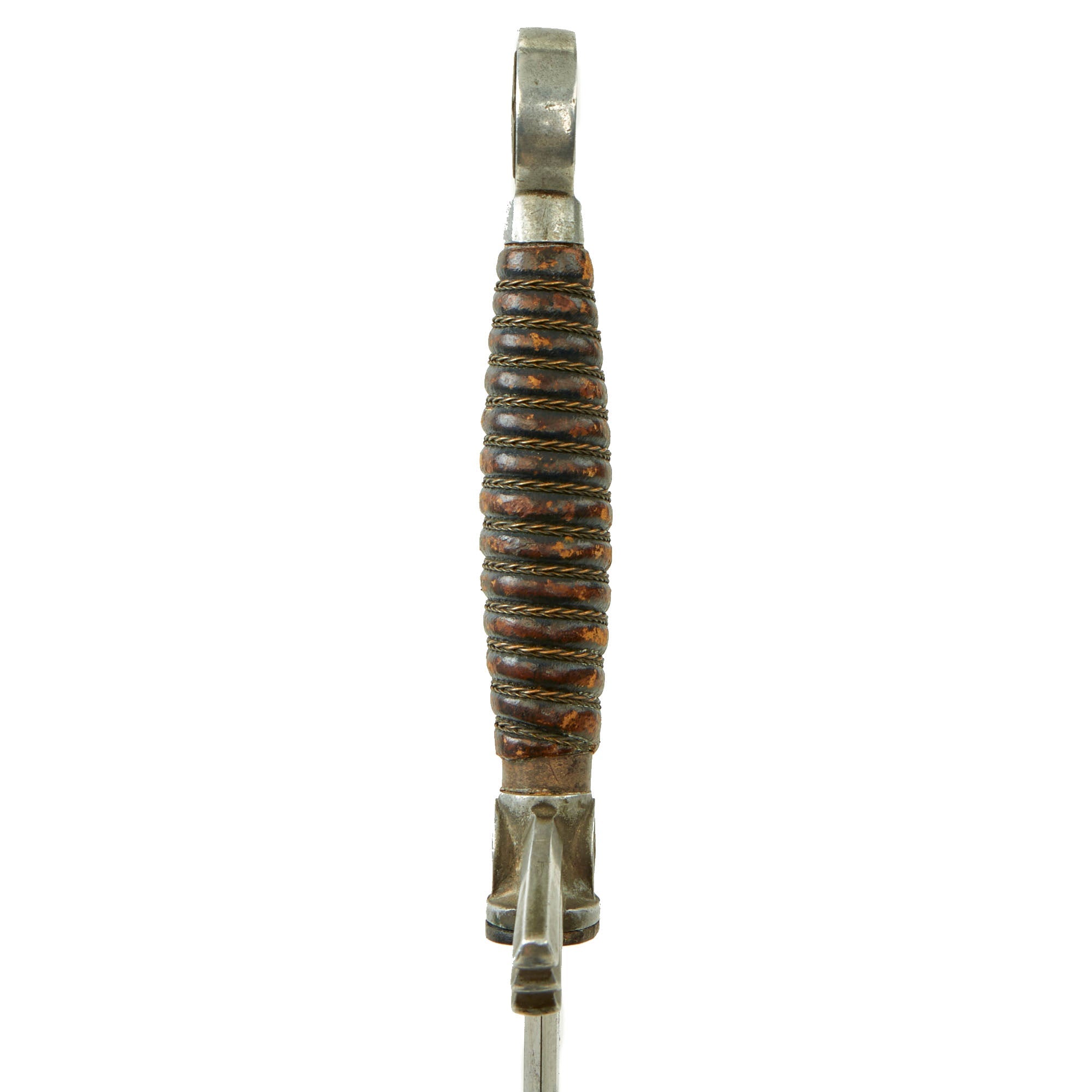 The grip on this early example is made of an aluminum frame with inlaid / pressed in alloy pieces for the "sunwheel" swas emblems. It has seen quite a bit of use and wear, which has removed most of the original oxide coating and plating, showing the base material clearly. The inlaid swas emblems are flat and not vaulted, like most of the other early examples we have seen. The grip is a carved wood base covered in blue Moroccan leather, which shows much wear to the finish, with a few tears and areas of exposed wood. The original wire wrapping has two side by side twisted pairs, unlike those we usually see. They look to be fully intact, though the plating has worn away and now the brass base metal has oxidized to a nice golden orange. The guard is the standard down swept "wing" type, with good detailing remaining, and with more "sunwheel" swas's, though the plating is mostly missing.