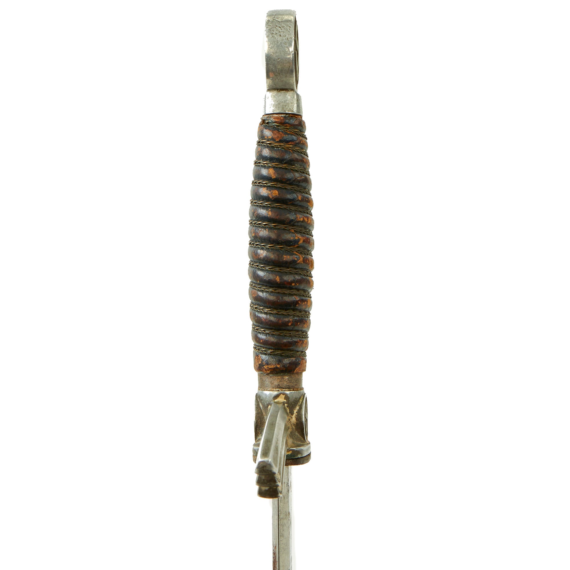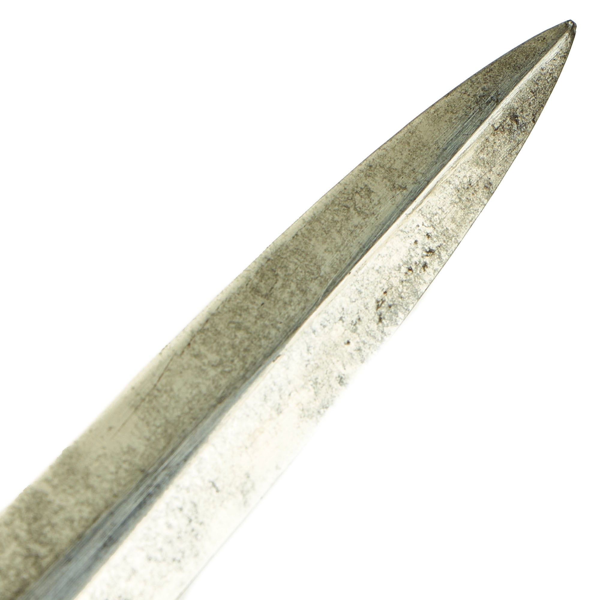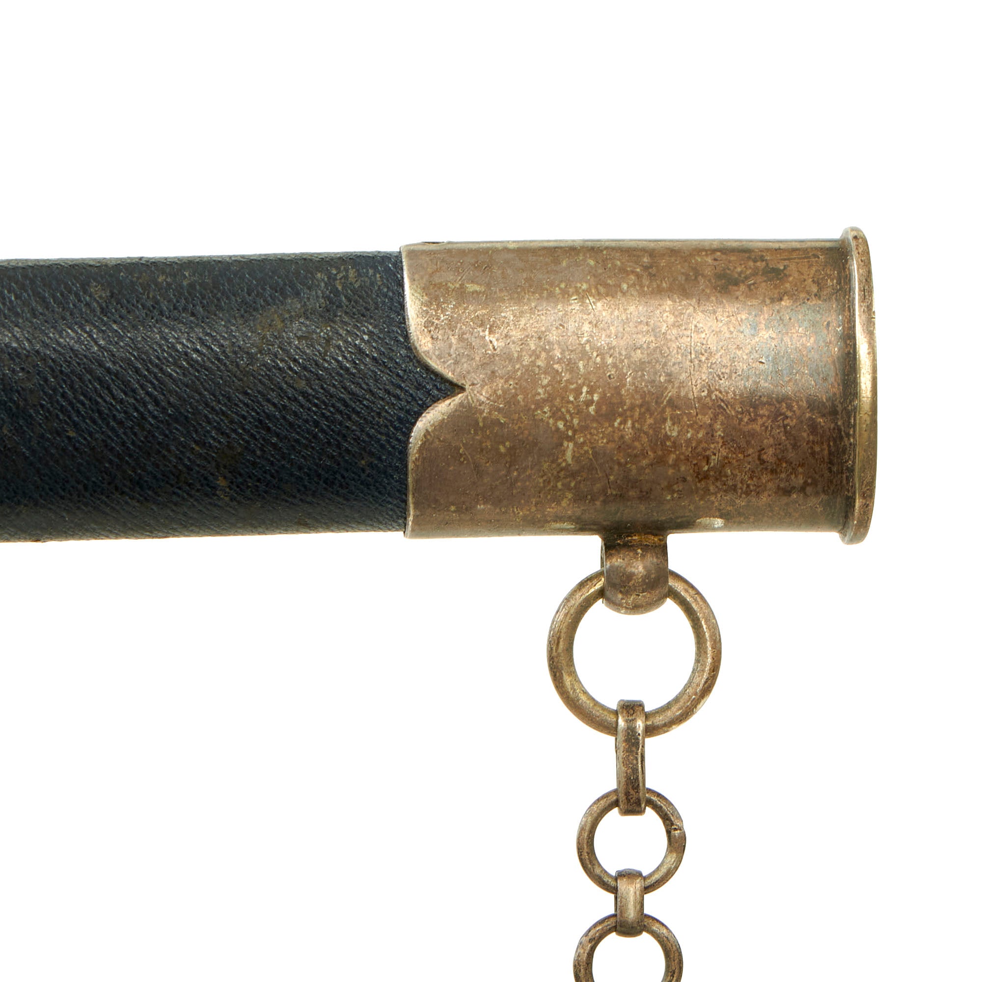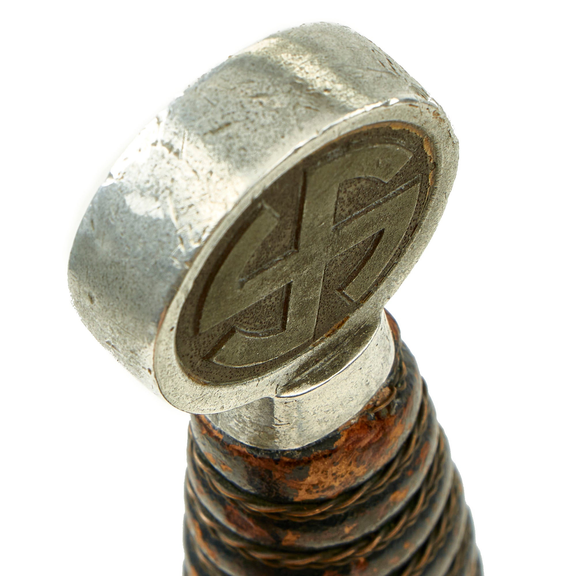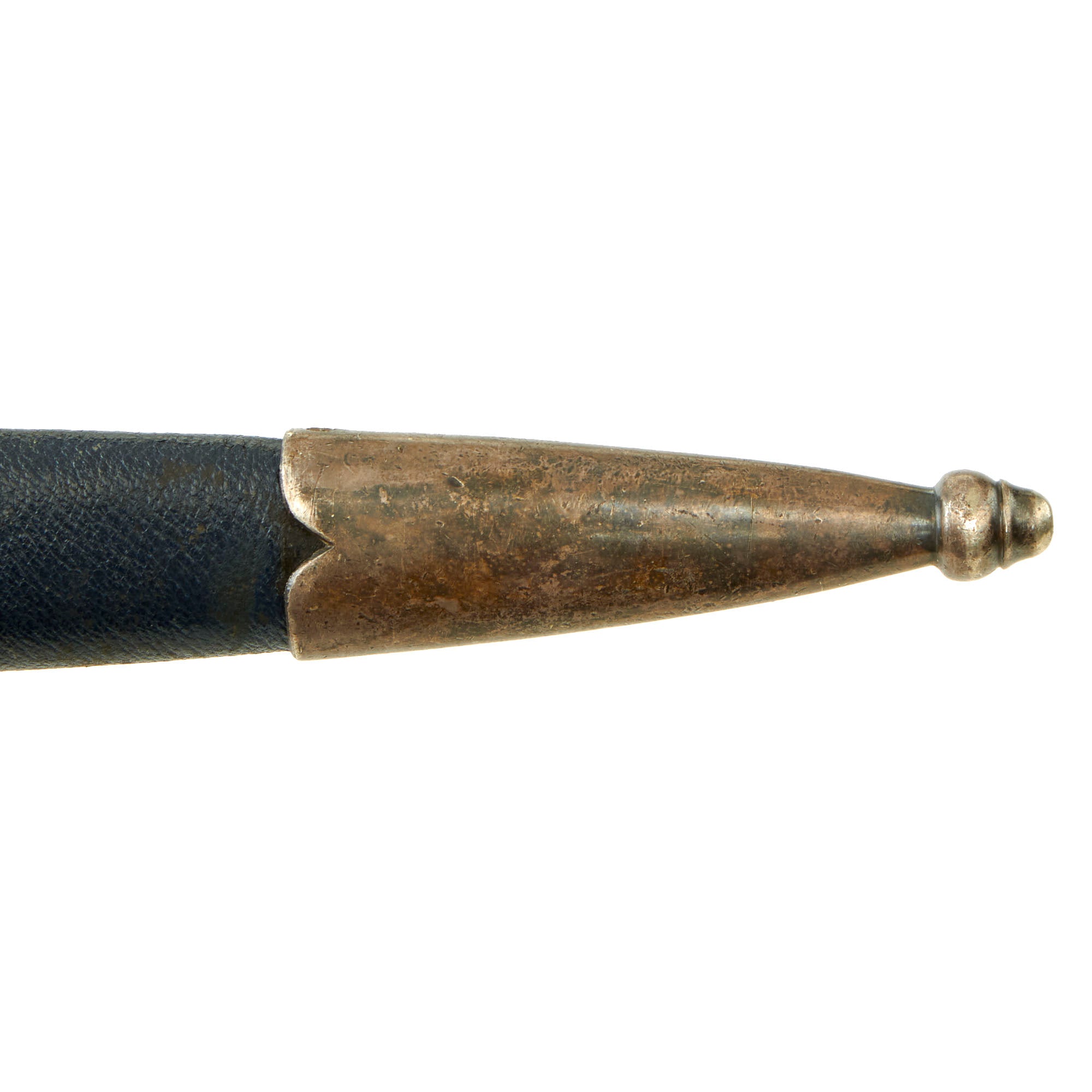 The steel scabbard shell is straight throughout with no dents we can see or feel. The Moroccan leather covering the scabbard is in much better condition than on the handle, as is typical due to how much less wear the scabbard would see in service. There is some denting and scratching, but no major tears or other wear. This scabbard has non magnetic nickel alloy mount brackets, with some of the original blacked silver plate intact, and a great patina. These mounts are retained by headless flush mounted side screws, however the ramp and throat fitting are missing their screws.