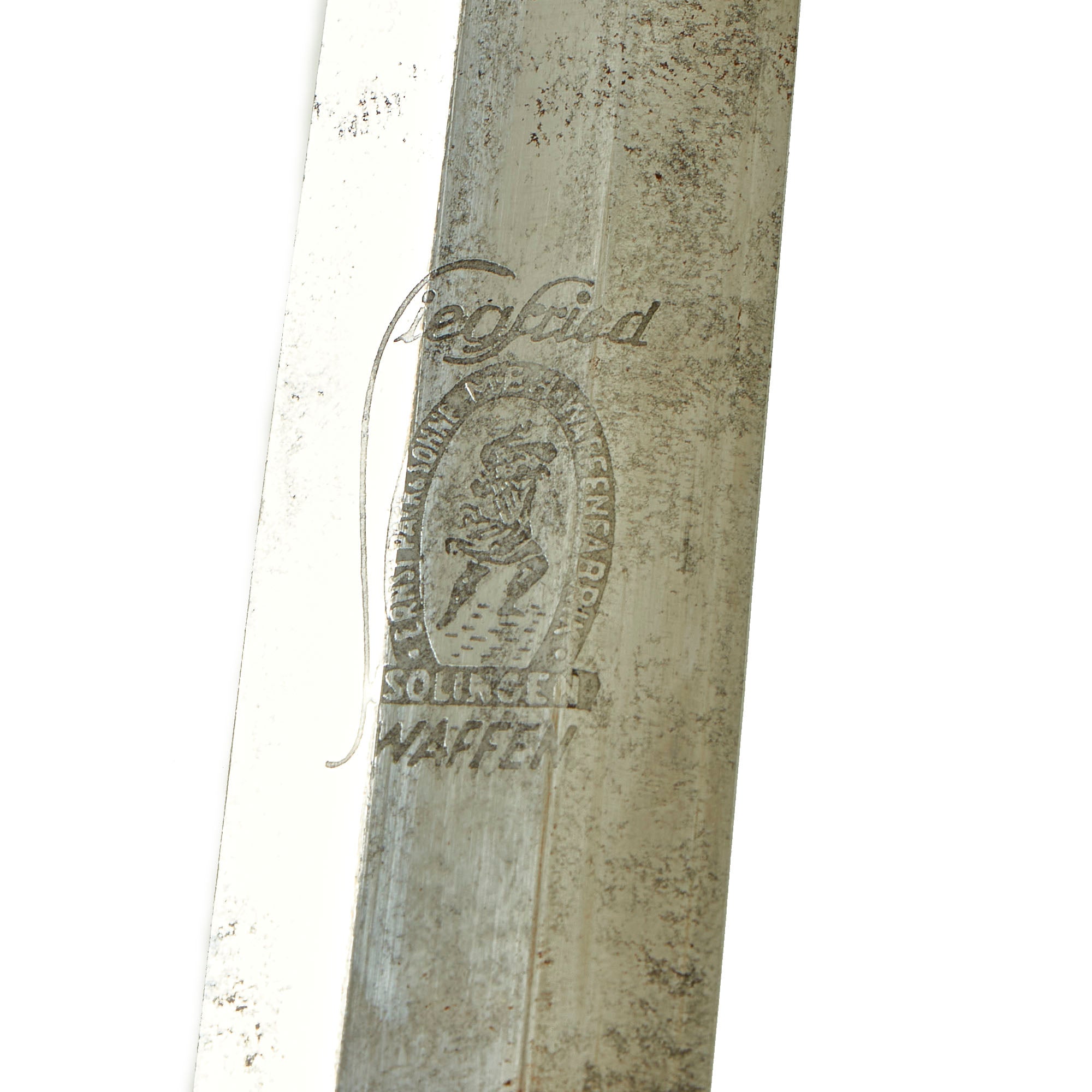 The rear ricasso of the blade is etched with the large "Siegfried" trademark logo of Ernst Pack & Söhne, which is in excellent condition. The mark shows their trademark "Young Siegfried wielding a hammer" Logo, surrounded by a stylized banner. The whole trademark reads: