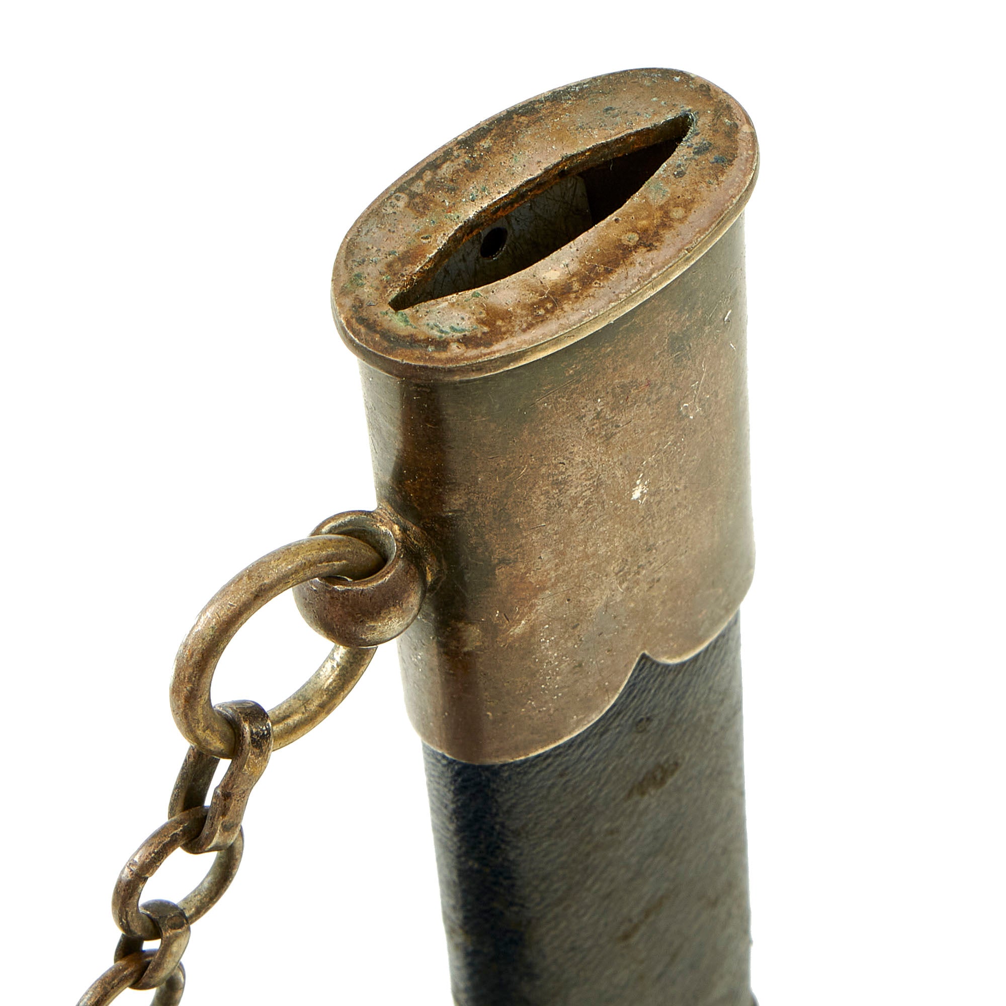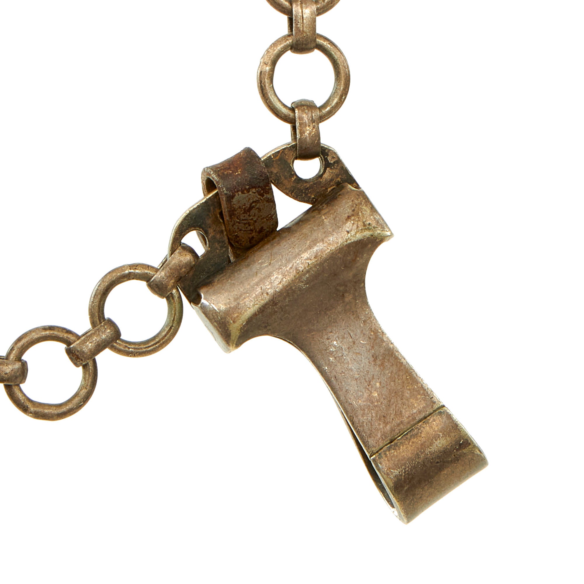 The attached hanger chain has nine ringlets making up the upper chain and fourteen on the lower, not counting the rings attached to the scabbard fittings. These look to be made from solid nickel alloy, or may possibly be plated, as we cannot see any change in color at the brazes. They are attached to a plated nickel snap clip with a flat steel spring, which also has had a plated steel hook attached to the bottom, used to "hitch up" the dagger.