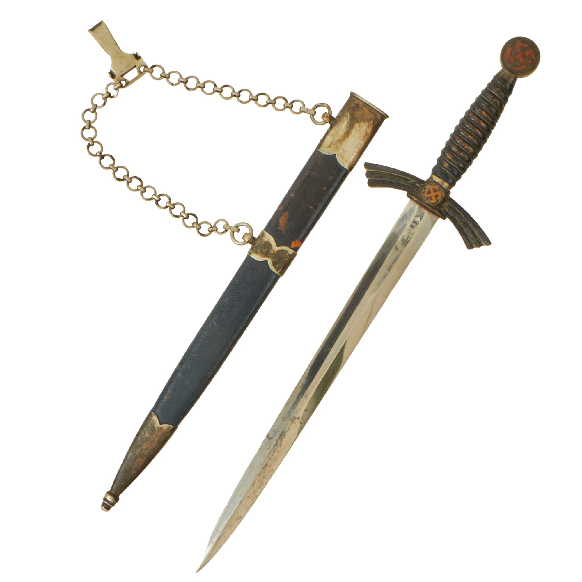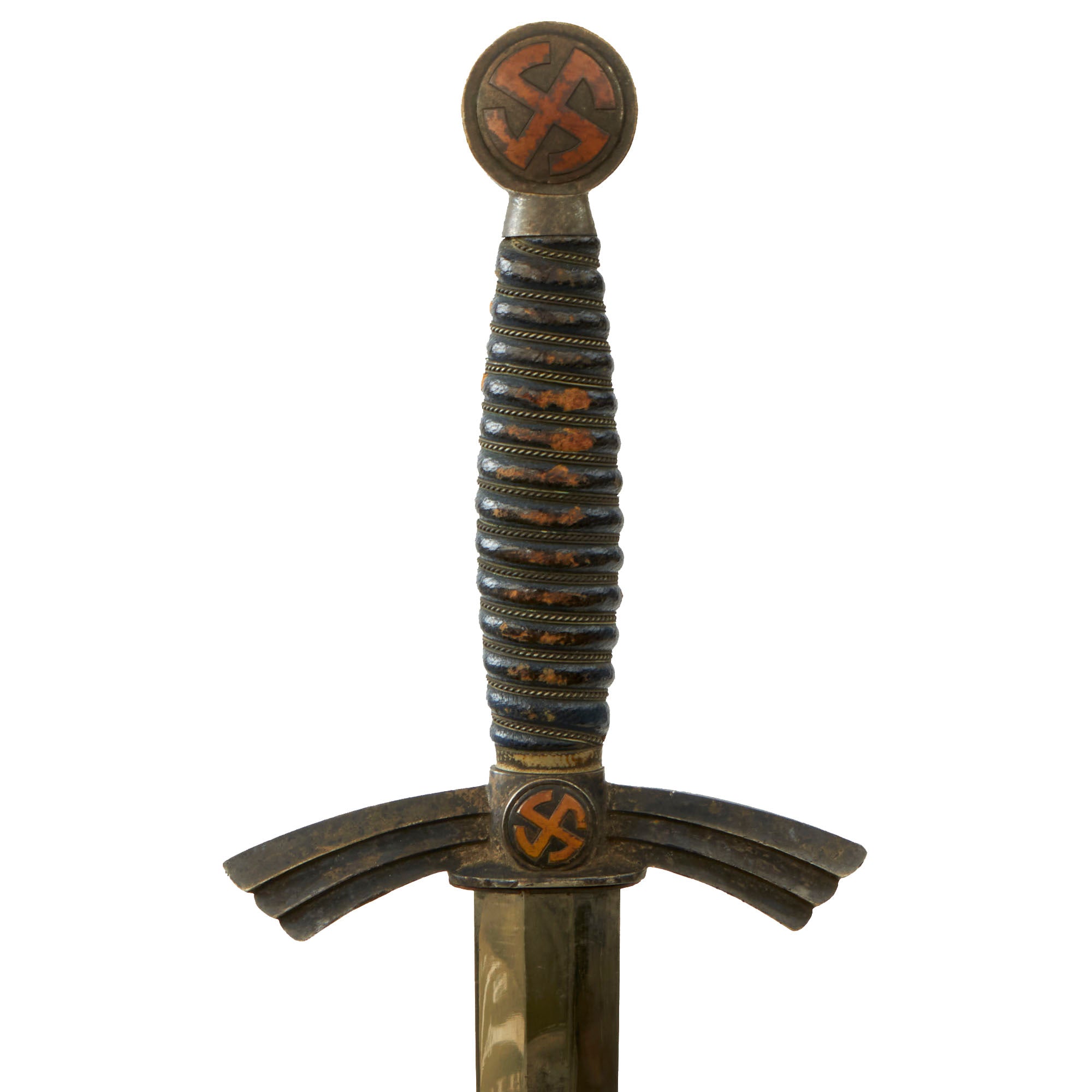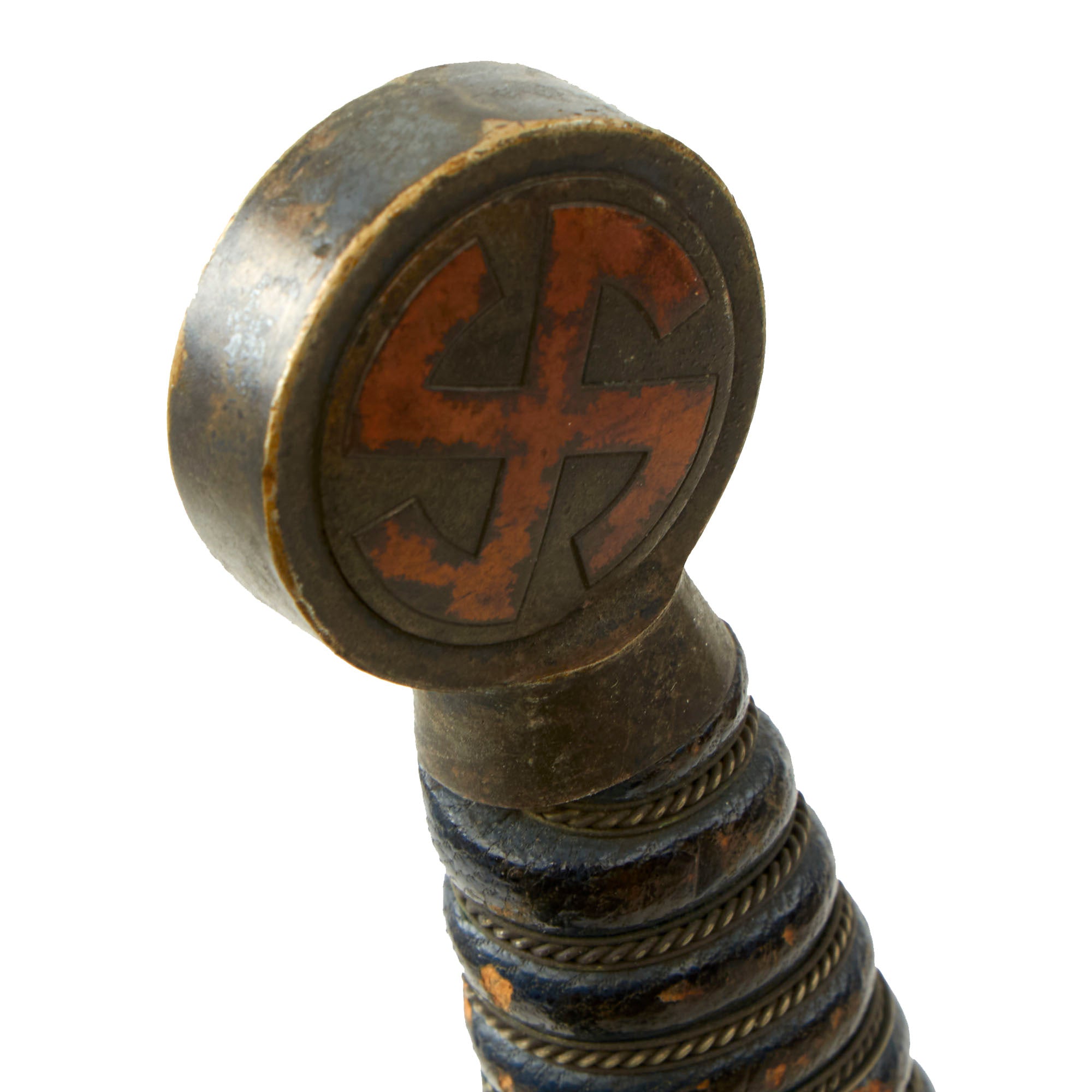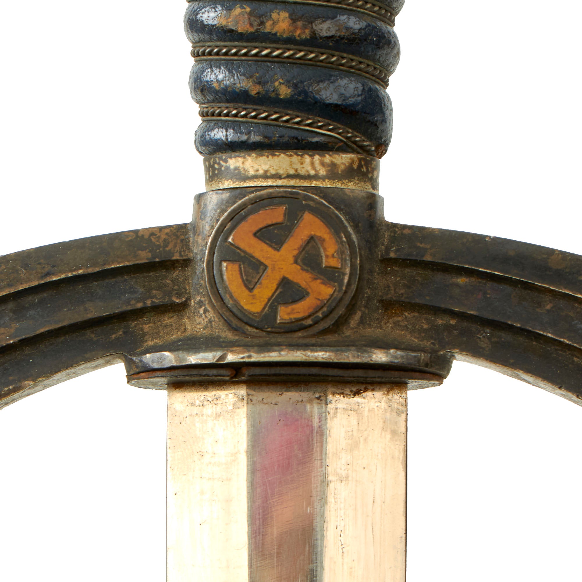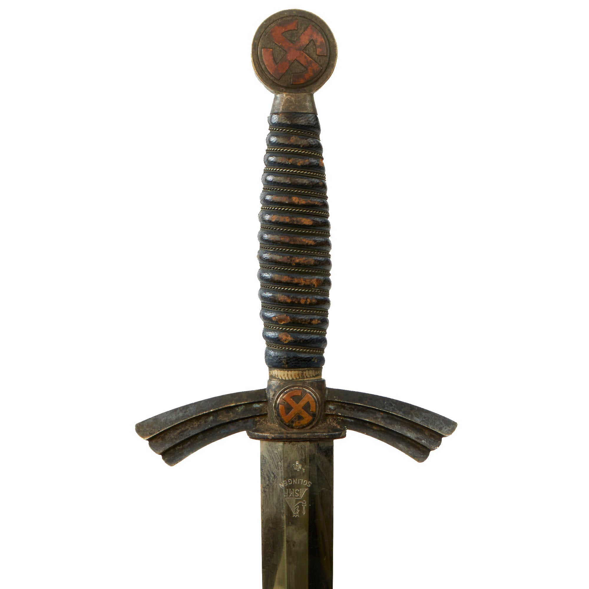 Original Item: One of a Kind. This is a very nice early 1st Model Luftwaffe Dagger, made by the desirable maker Solinger Metalwaren-Fabrik Stöcker & Co. GmbH, of Solingen, Germany. It was made in the mid to late 1930s, before 1938 when the change was made to use aluminum fittings. It has plated mounts throughout all being nickel alloy plated with blue oxide. The plating has worn in some areas, showing the base metal, however overall it is very well retained. The rim of the pommel shows some usage but there are no hits or problems. The vaulted pommel shows the original "Broken Sun Cross" swas medallions, which are probably the type that is inserted, and the brass on the emblems has oxidized. The grip is a carved wood base covered in blue Moroccan leather, showing wear through on the wider sides. It is triple wrapped with silver wire, with the center example being twisted.
