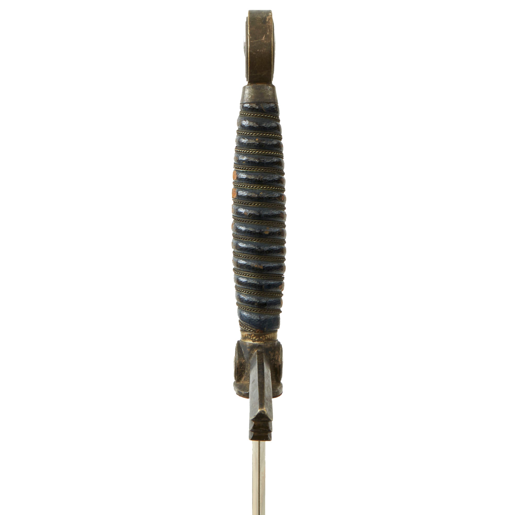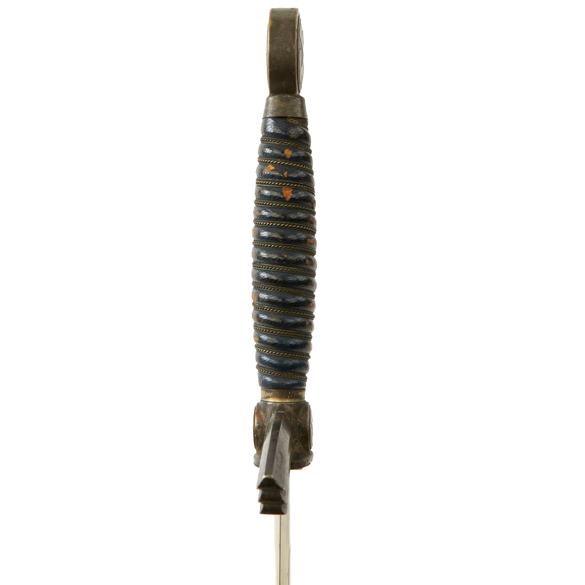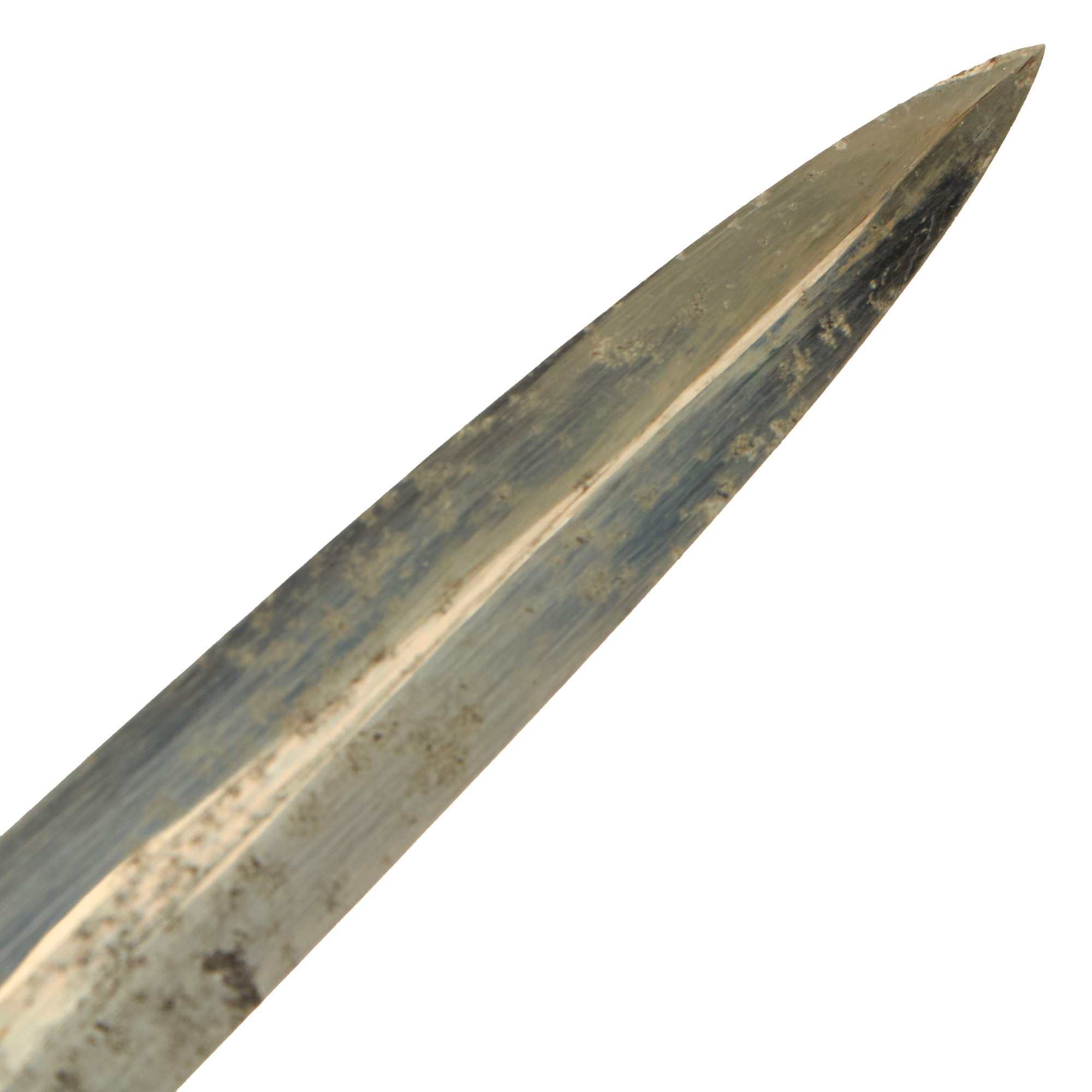 The blade of this piece is a high quality nickel-plated example, which looks to have seen long service, causing the plating on the half of the blade near the tip to flake off in places, allowing the steel to oxidize. There is also some wear from the runners of the scabbard, and light scuffing from cleaning. There are no nicks on the edge, which is correctly unsharpened, and the tip of the blade is intact and unbent.