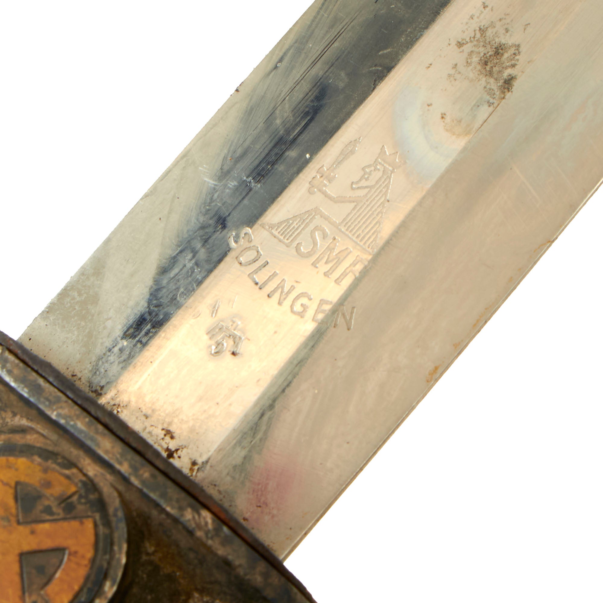 The SMF trademark logo on the blade ricasso features an etched king holding an upward pointing sword, and is known as the "Seated King". The king is sitting on the firm initials SMF and is positioned above an arch shaped town location SOLINGEN. Solinger Metalwaren-Fabrik Stöcker & Co. GmbH, also known as SMF, were one of the major suppliers of edged weapons to the Luftwaffe during WWII. As the name implies, they were located in Solingen, the legendary "City of Blades" in Western Germany. For more information, please see J. Anthony Carter's fine work GERMAN SWORD AND KNIFE MAKERS. Above the trademark is a Weimar style Waffenamt Eagle / 5, the standard acceptance mark for edged weapons in the Luftwaffe.