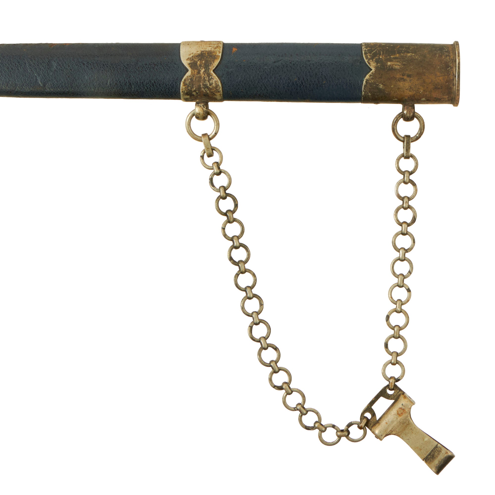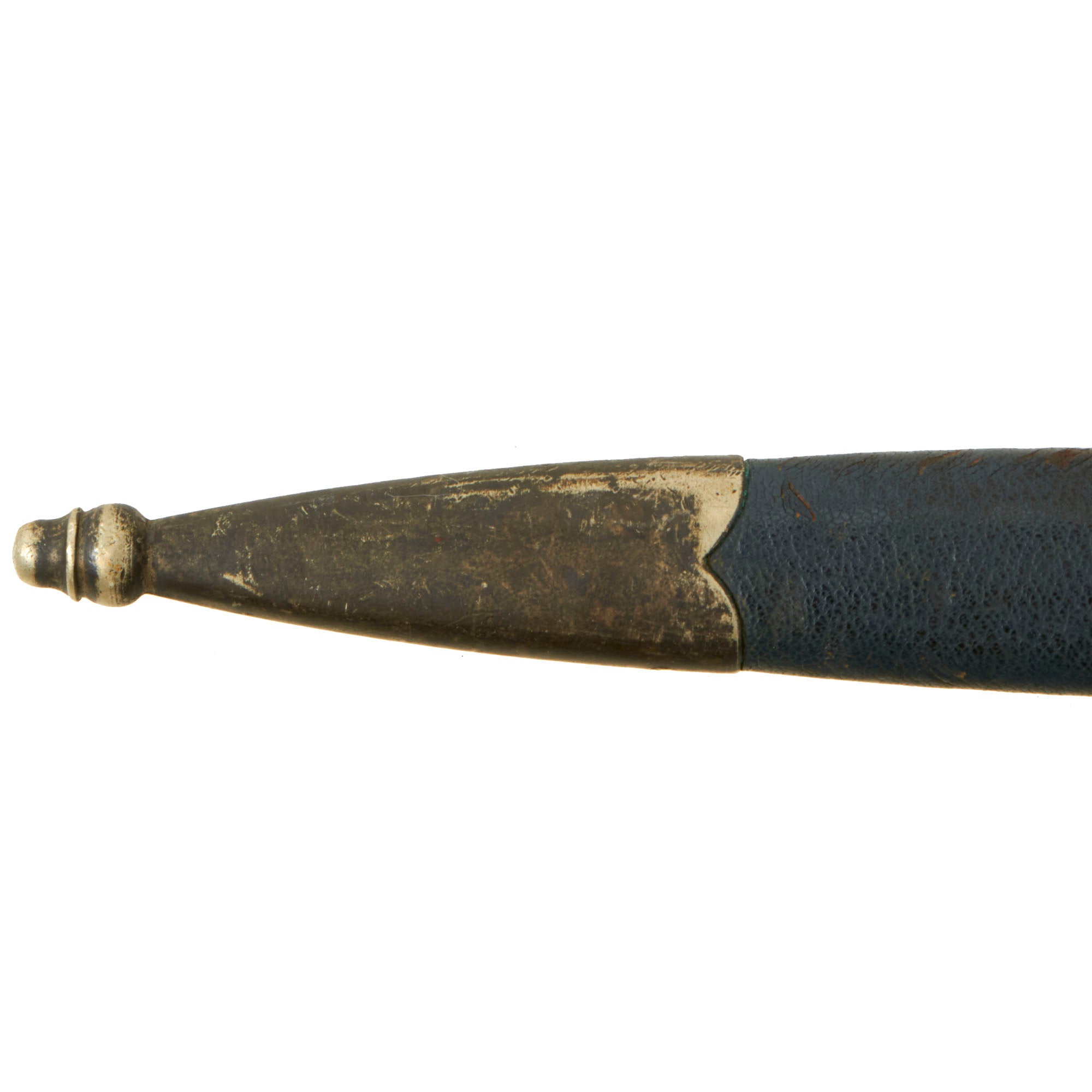 The steel scabbard shell is straight throughout with no major dents. The Moroccan leather covering the scabbard nicely matches the grip and is in very good condition. There are some areas where the leather finish has worn and/or cracked, but that is expected on a scabbard of this age. The mounts on this scabbard are all solid nickel alloy, originally fully oxide coated like the hilt, but now showing some wear through in areas. They do not show any major damage or wear, and are retained by headless flush mounted side screws, all five of which are still present.