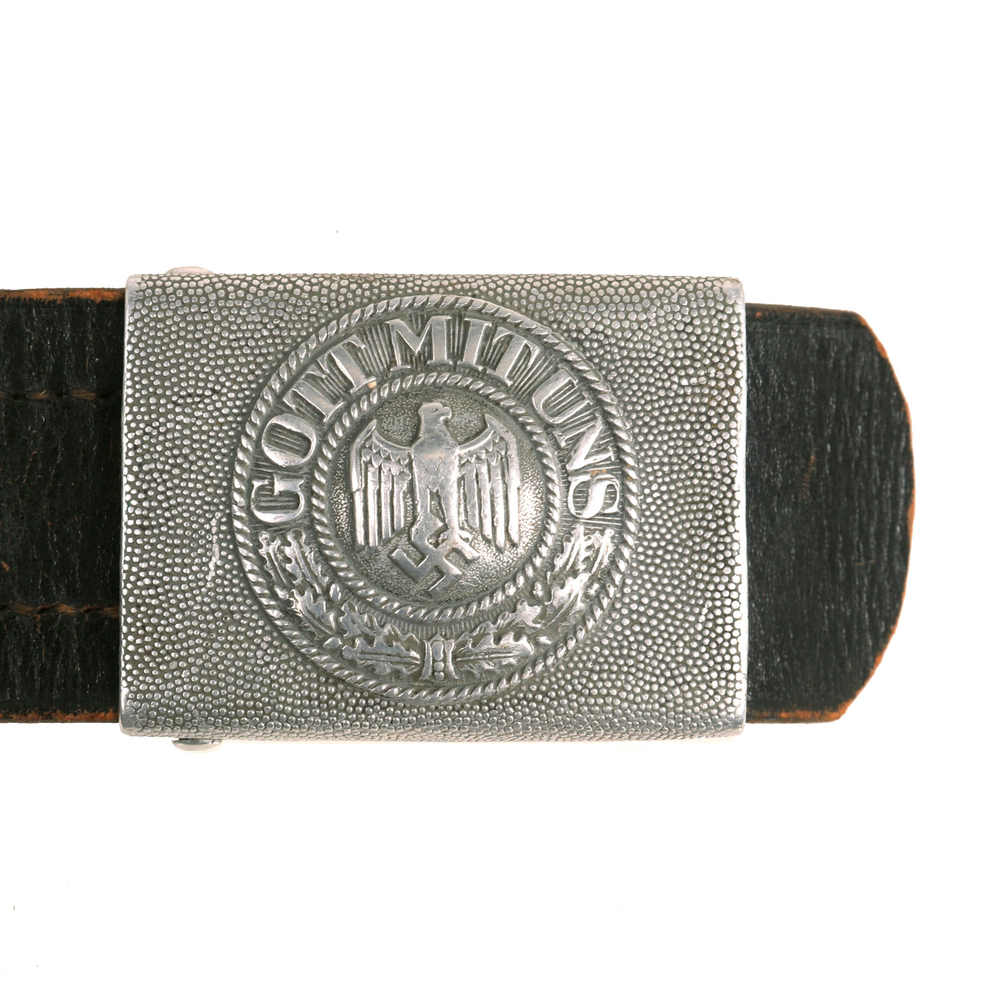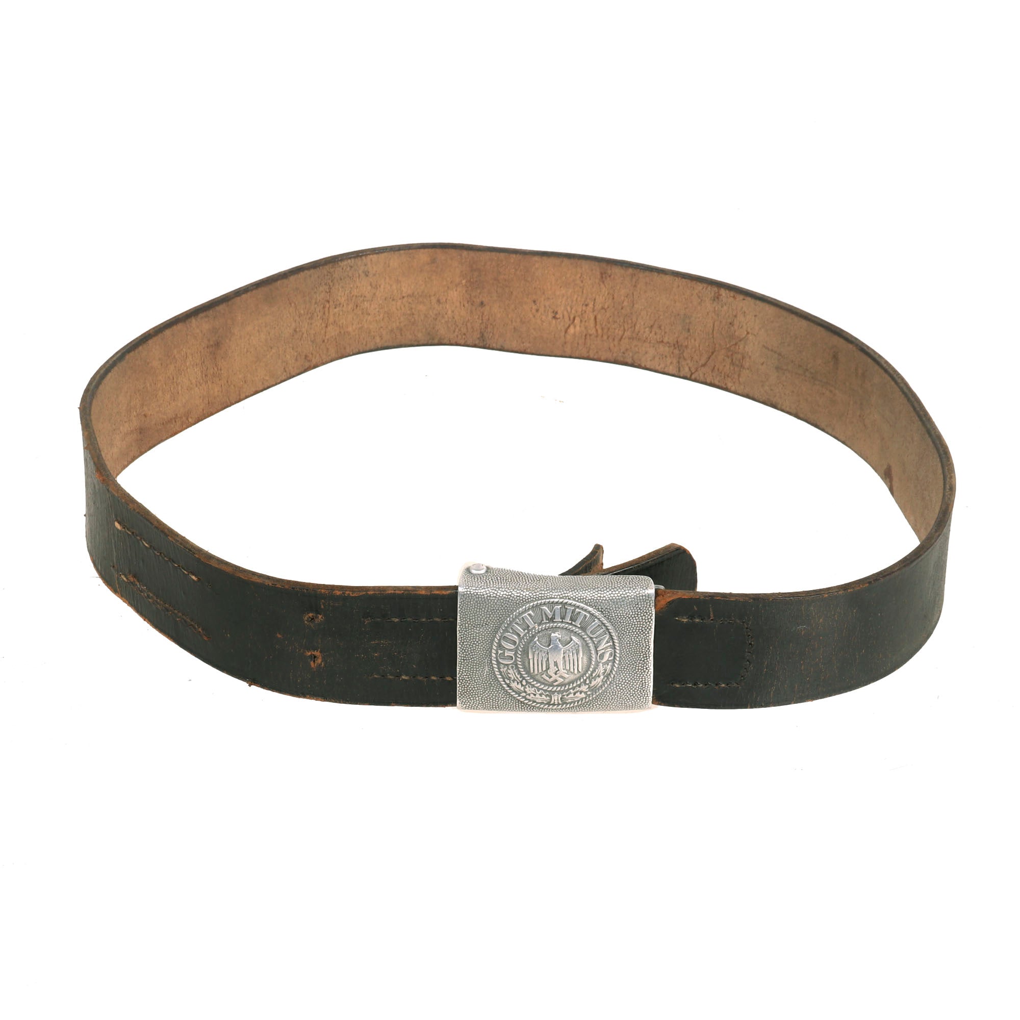 Original Item: Only One Available. This is a very nice WWII German Wehrmacht (Heer) Aluminum EM/NCO's Belt Buckle (Koppelschloß) with an original black finished leather belt. The buckle is embossed with the Heer motto GOTT MIT UNS ("God (is) with us") around the Wehrmacht Reichsadler (State Eagle). Nice aluminum construction box buckle with a pebbled background. The buckle is in good condition, and is a single piece injection molded and crimped example. It does show some surface wear, common due to the softer aluminum alloy.