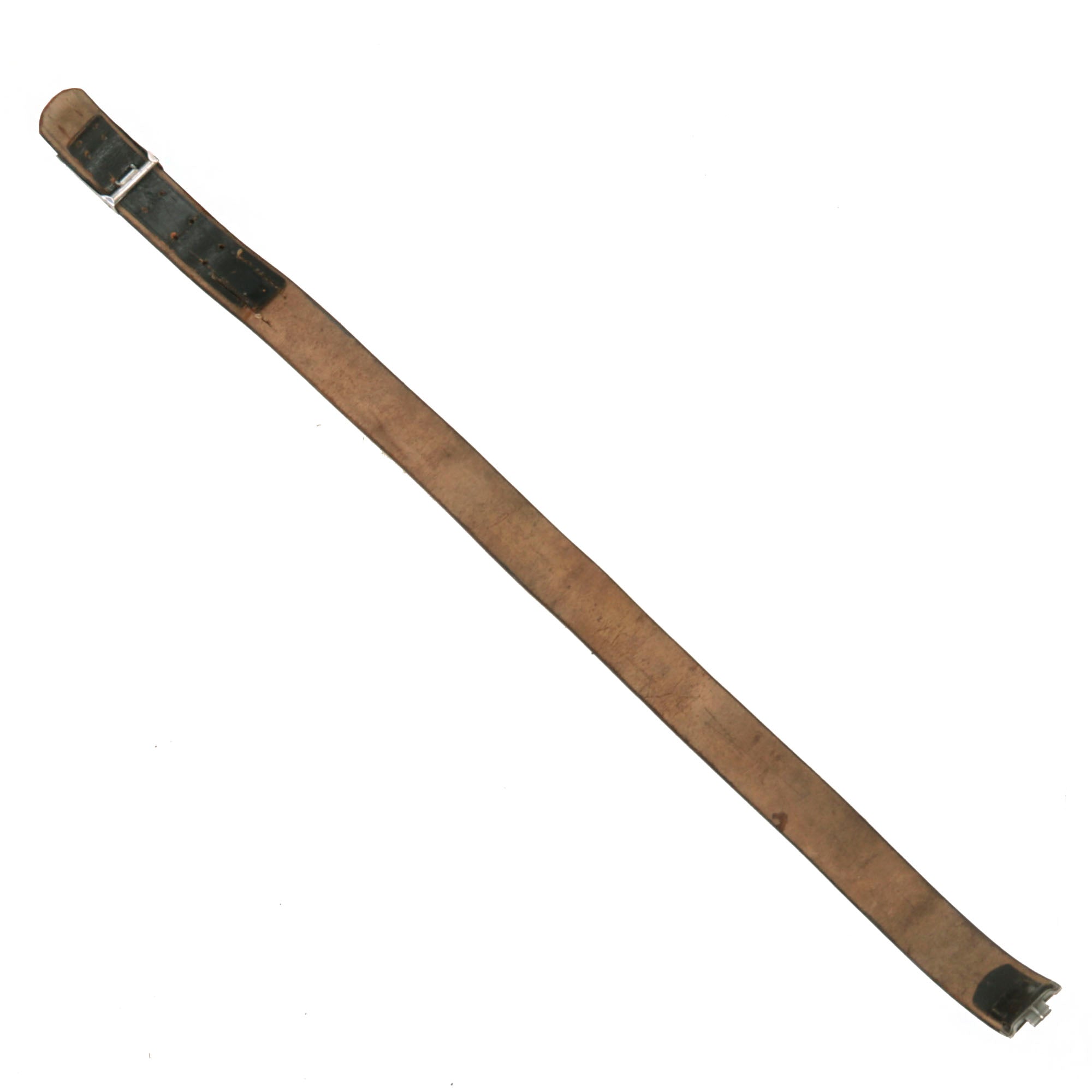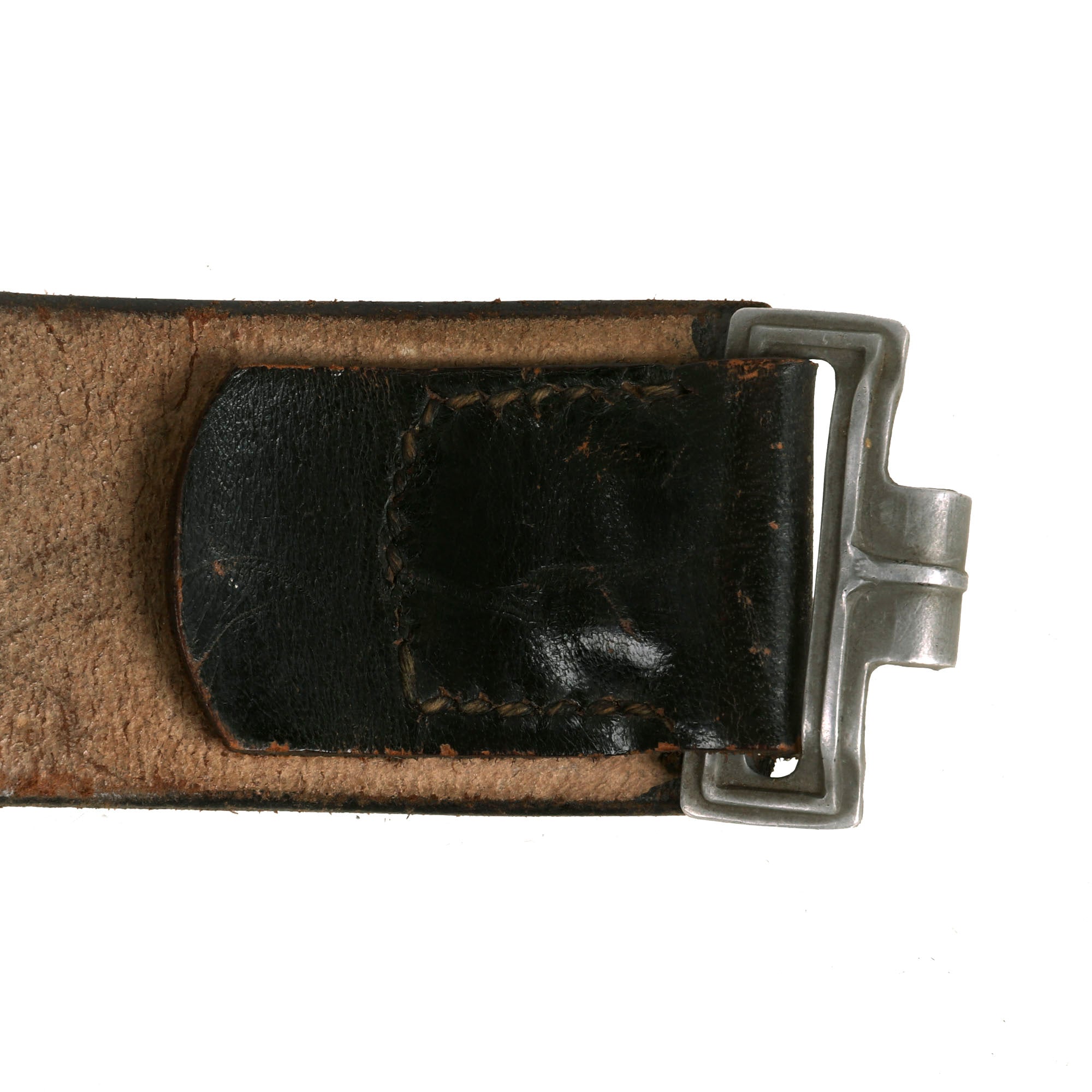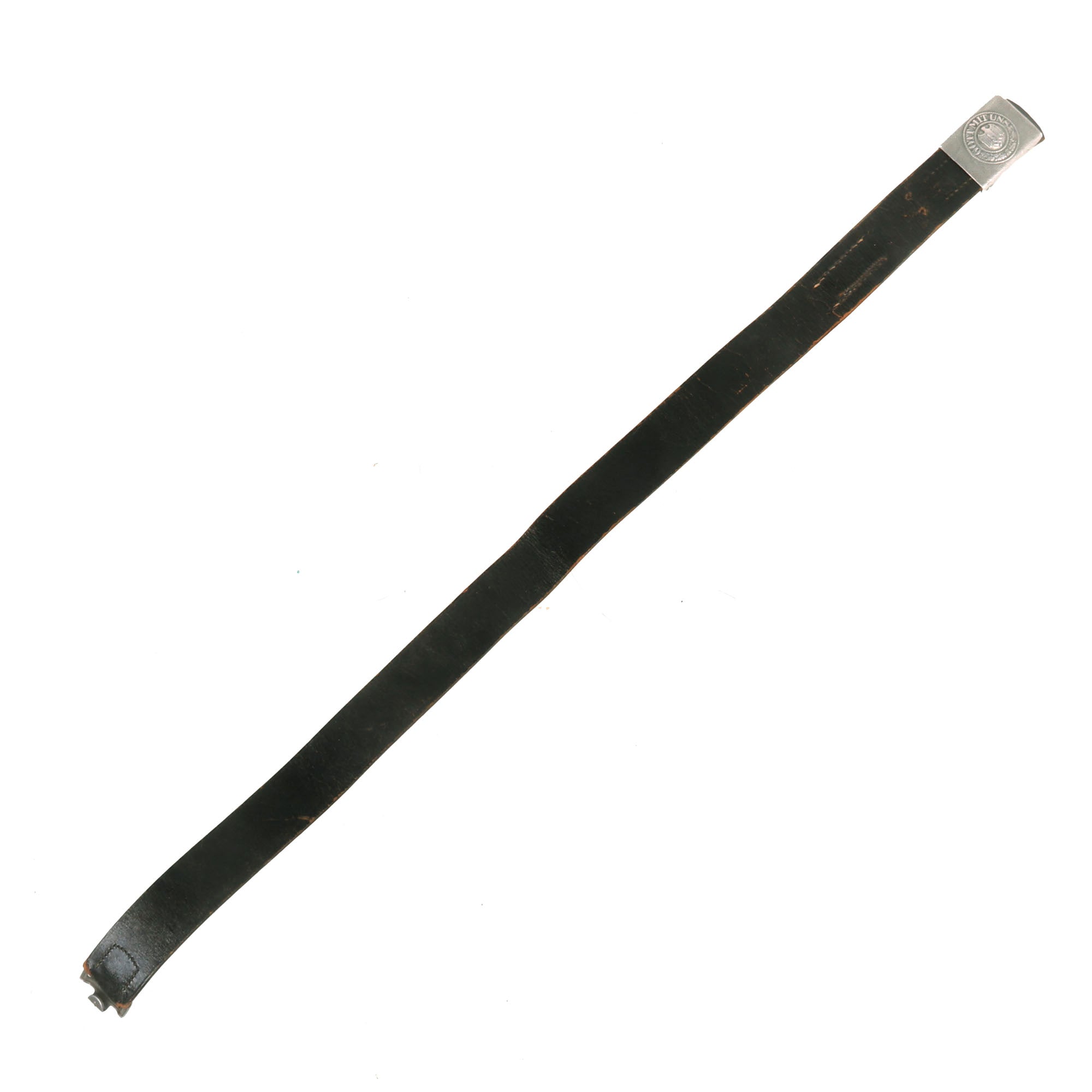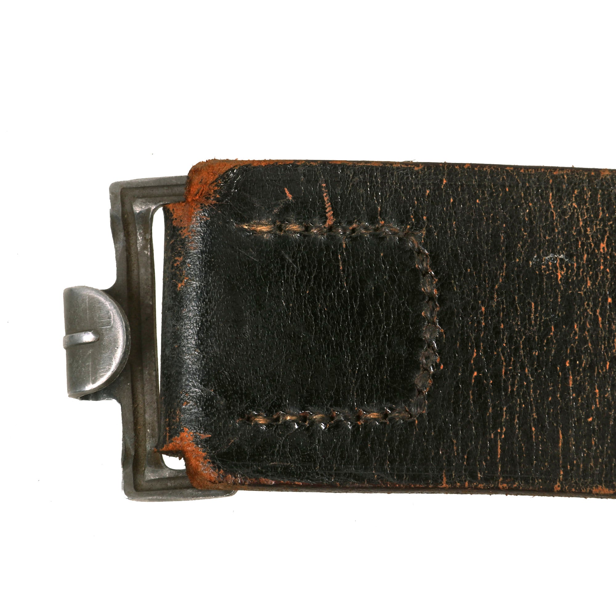 The leather belt is in very good condition, and measures about 37.5” when fully extended. It has a lovely gloss black finish on the leather, and originally was about 5 inches longer. The adjustment tab with double rows of 5 holes had an additional row added at the end, and was restitched to a new location at some point during the war. It also features an early war aluminum securing hook, which was originally painted green like the buckle.