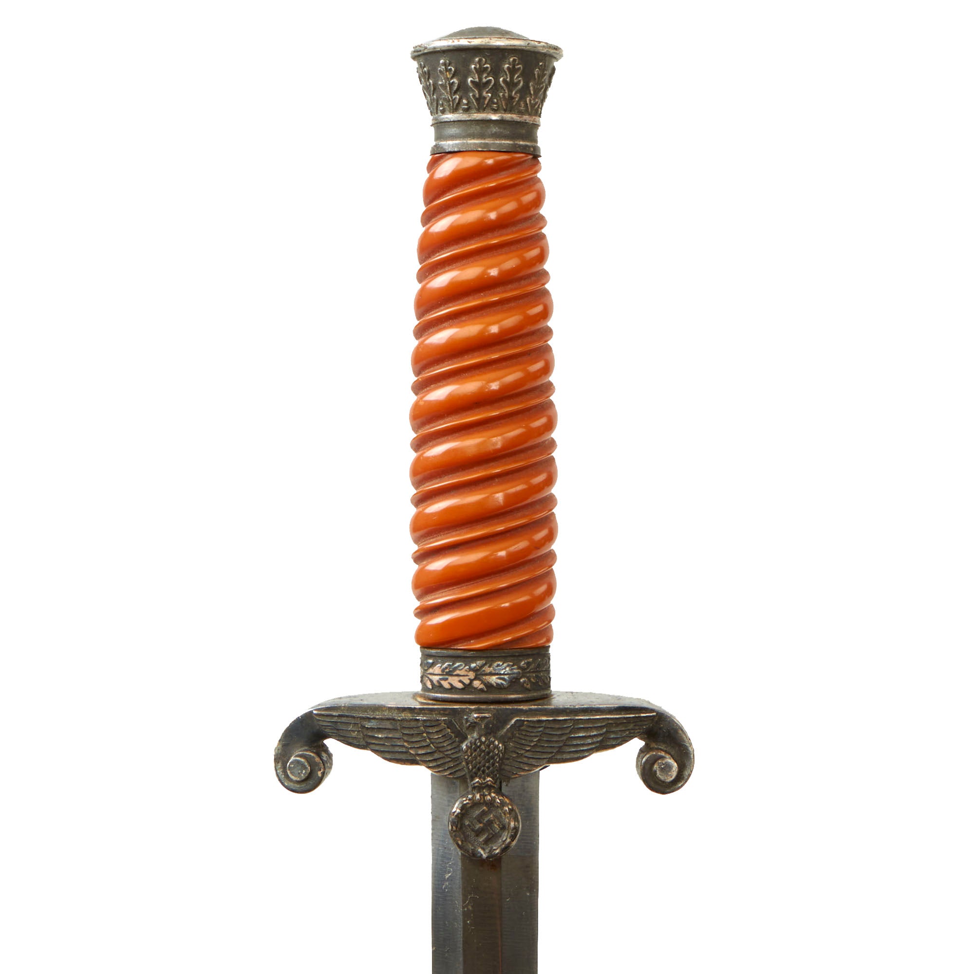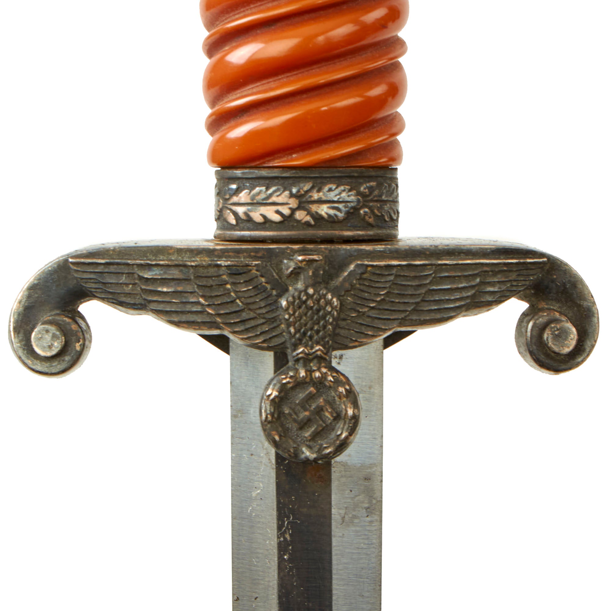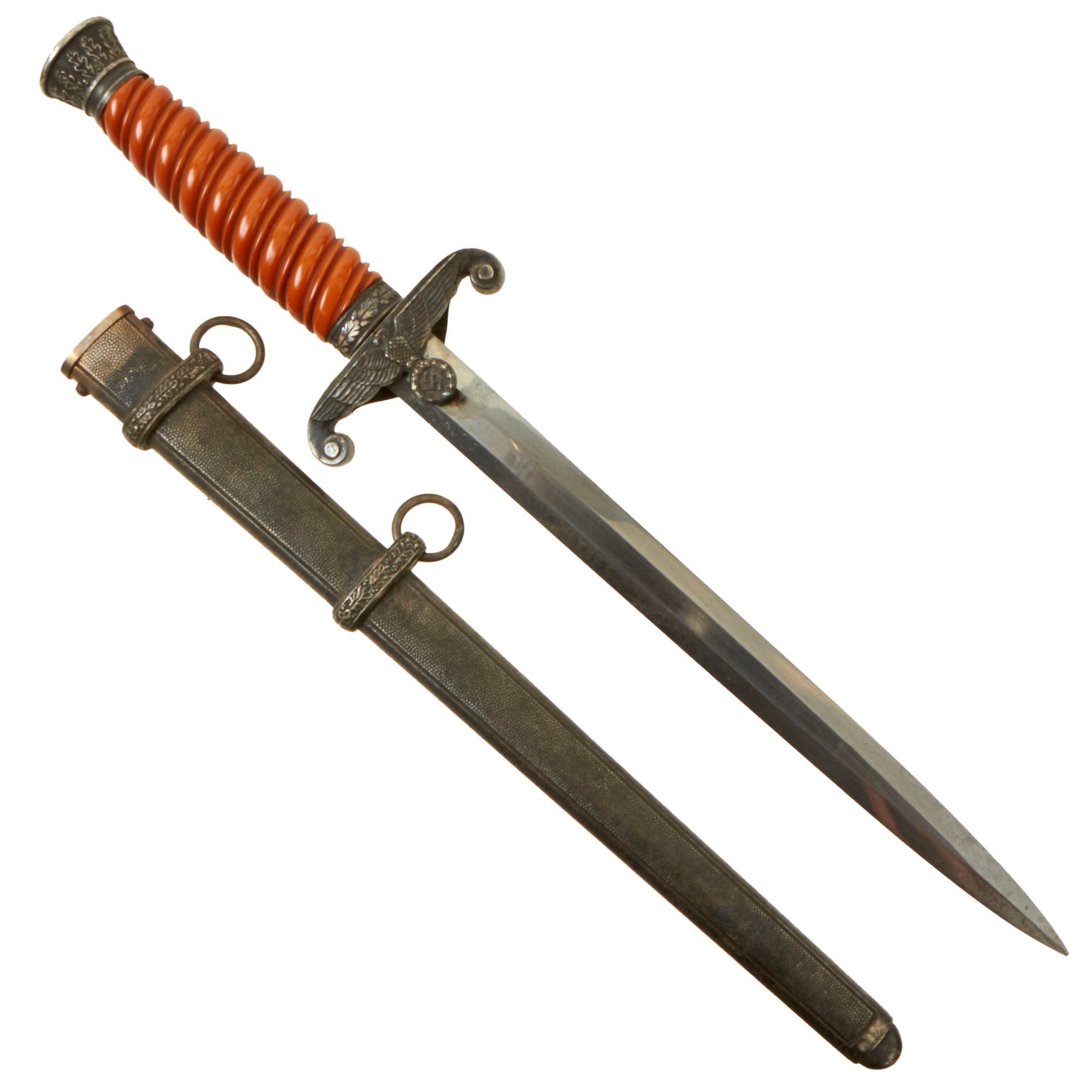 The German Army (Heer) first carried a dagger beginning in 1935. The weapon was worn in lieu of occasions not demanding the wearing of a more formal sword. The dagger design was quite attractive featuring silvered heavy fittings with white or colored grip. The crossguard depicted a Wehrmacht open-winged eagle clutching a wreathed swas.