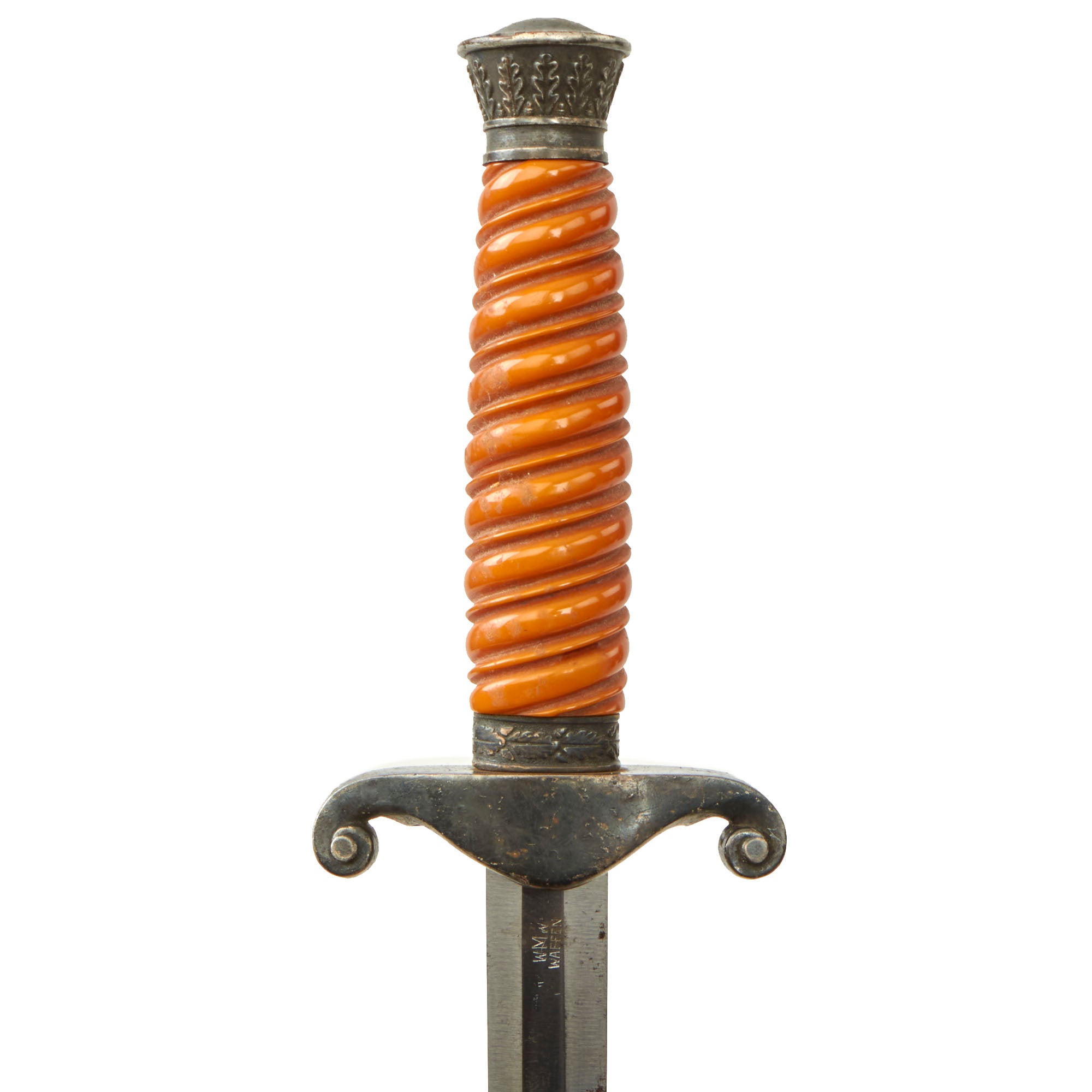 Original Item: Only One Available. This is a very good condition Army Officer's Dagger, produced by the relatively rare Solingen-based firm Max Weyersberg, Waffenfabrik, complete with its original scabbard. The alloy pommel of this dagger is in very good condition, showing light wear around the bottom edge. It looks to have been plated and then oxide coated or tarnished, giving it a lovely deep blue color overall. It may be that it is made from a solid alloy like Tombak or Nickel Silver, and then oxide coated. The standing oak leaves and acorns are crisply detailed around the pommel, and there is little wear or damage of any kind, except around the edge, the first place to wear.