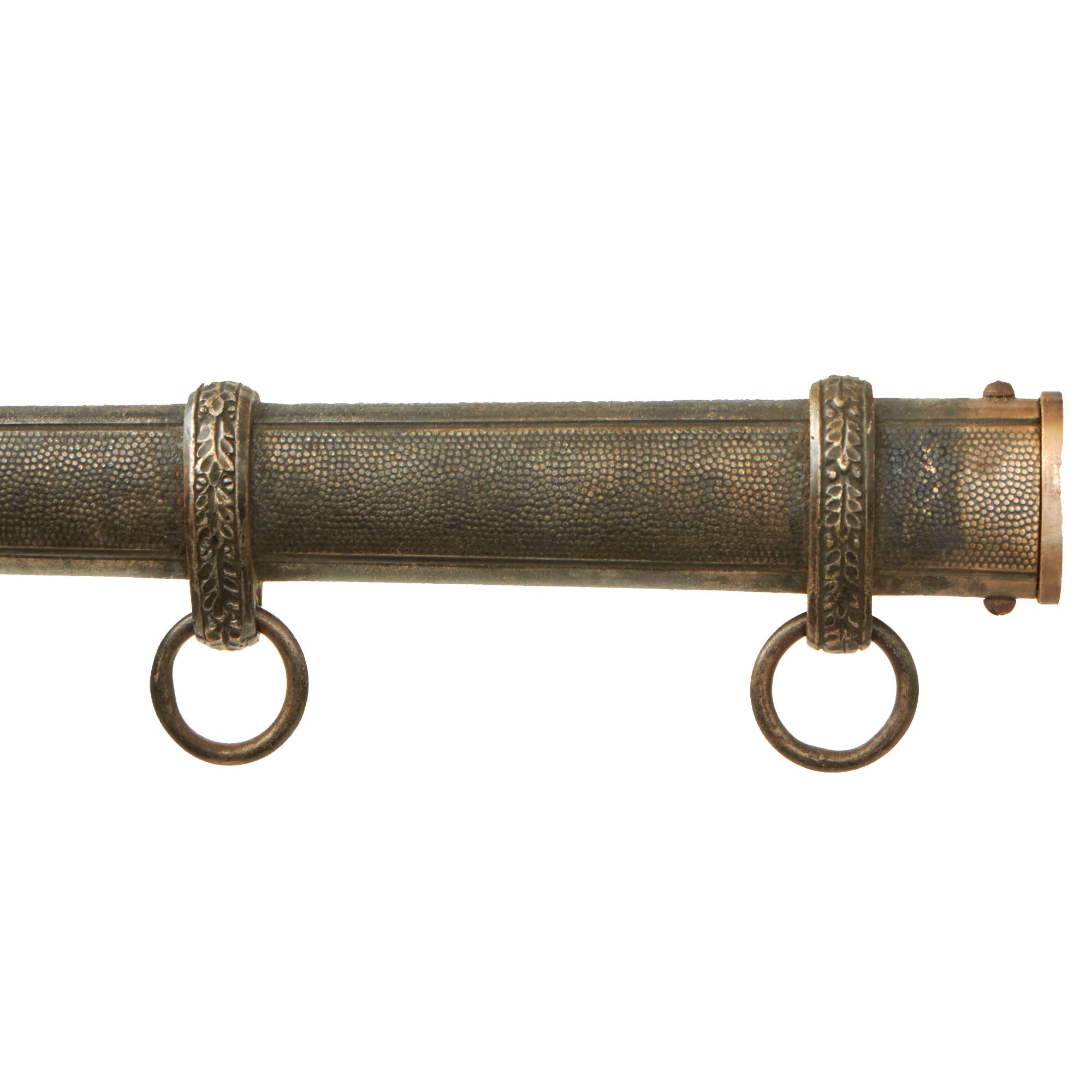 The pommel depicted oak leafing around the outer circumference. The scabbard had panels of pebble designs. Later produced examples were plated with nickel, and late war-made pieces were unplated, finished in a gray color metal. This early war version is quite nice, and in great shape.