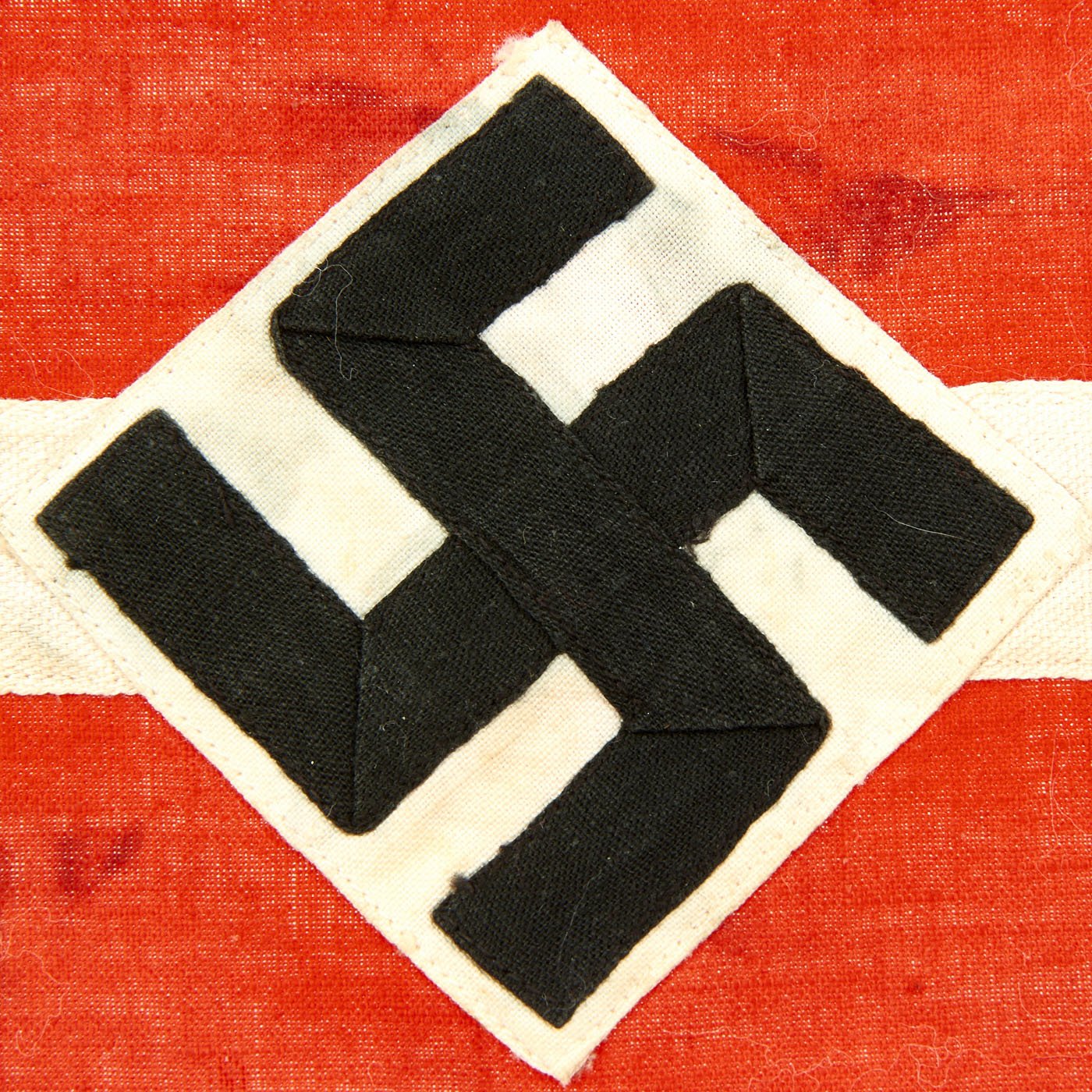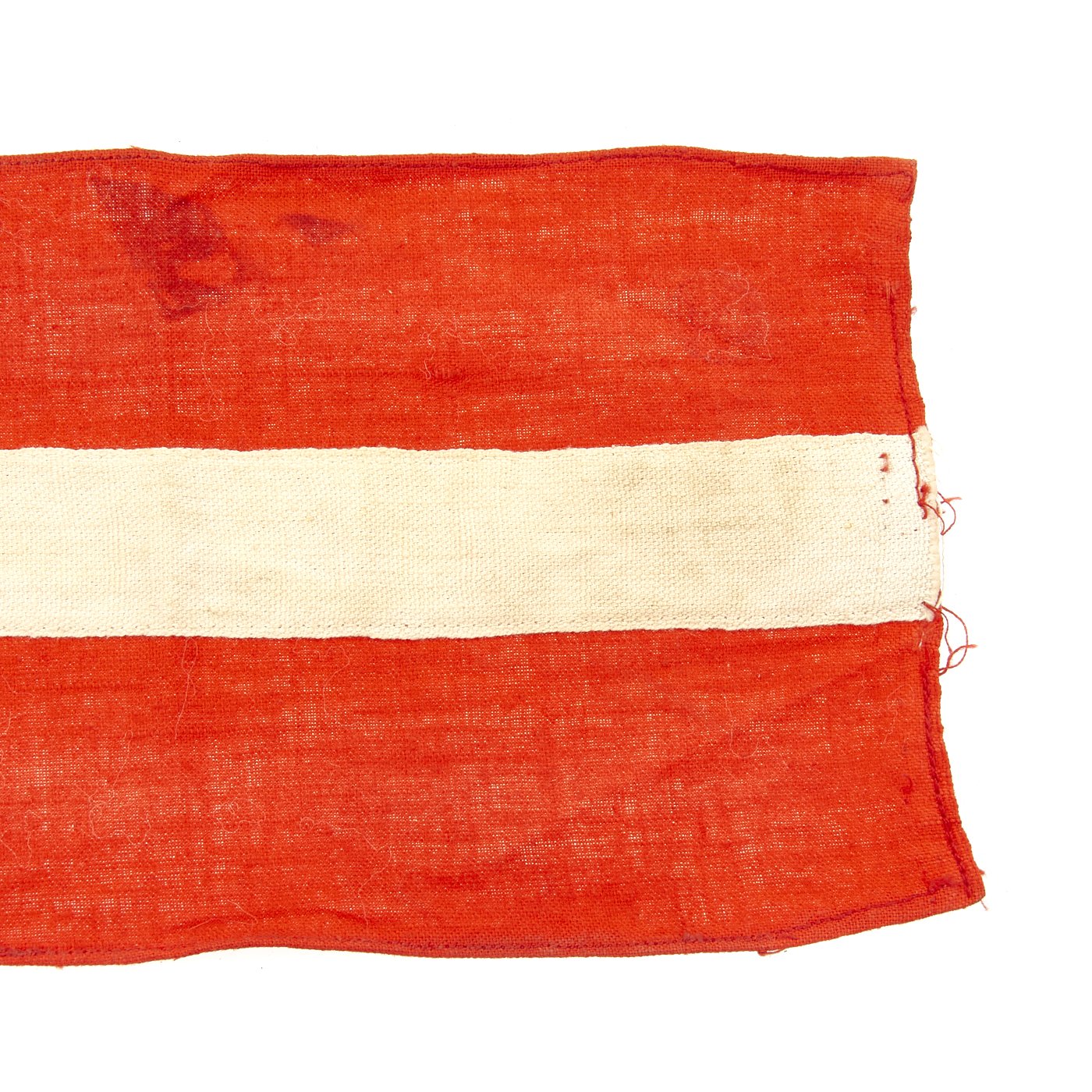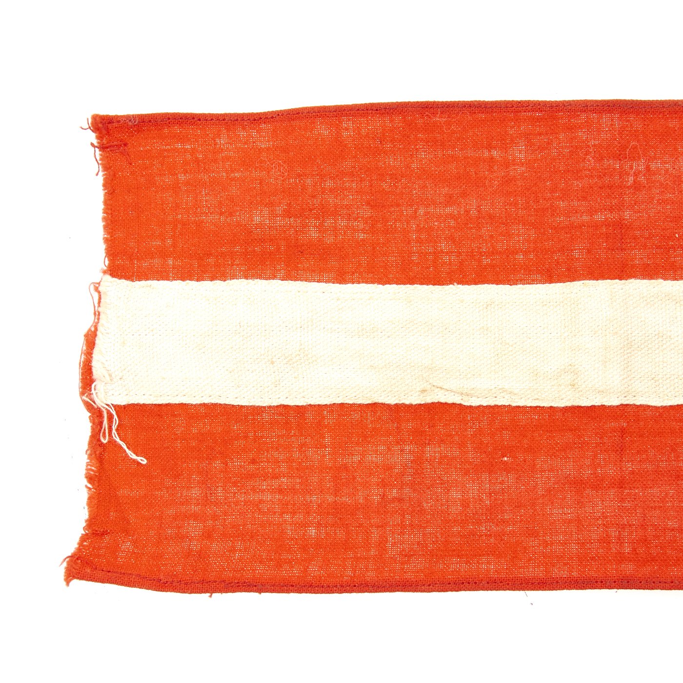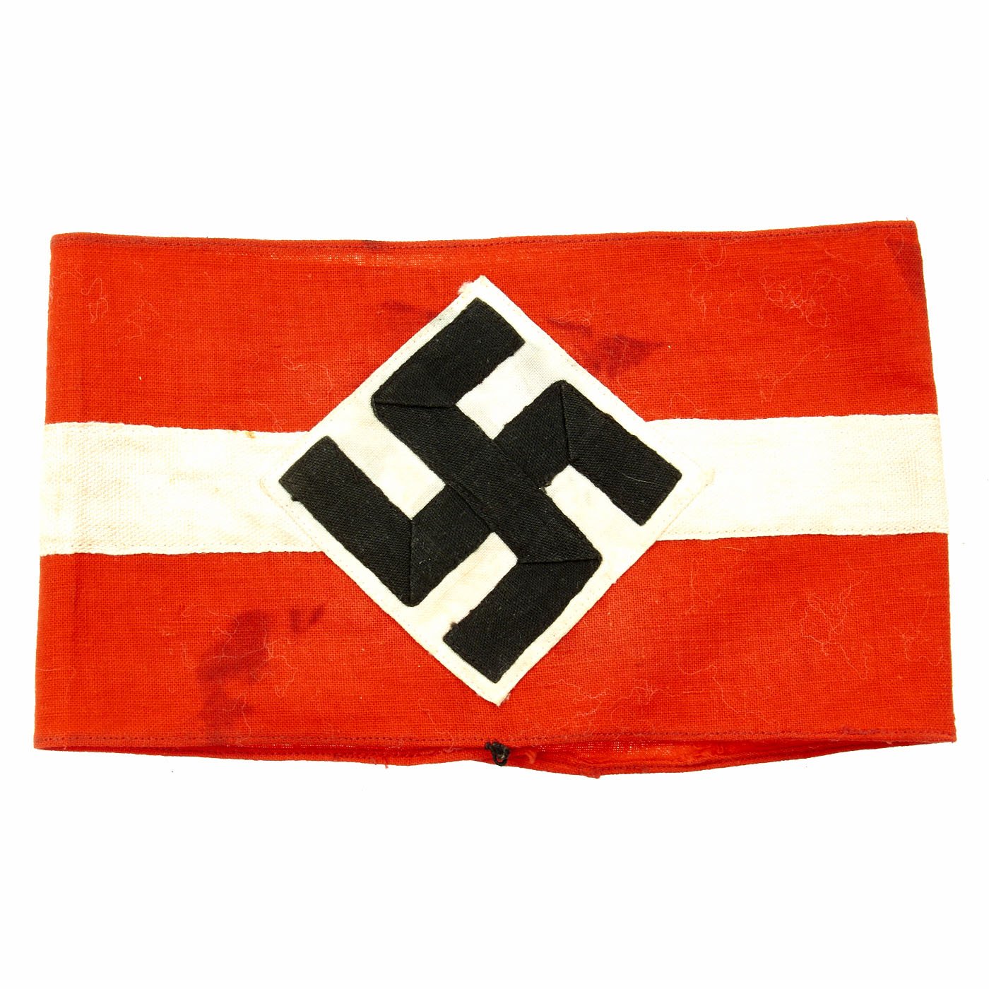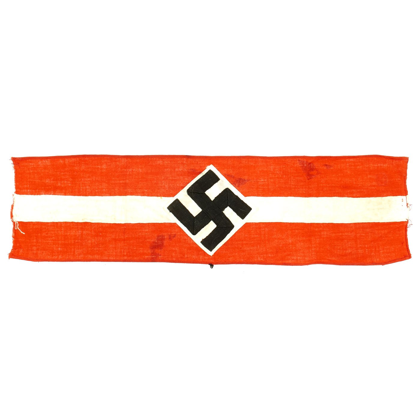 Original Item: Only One Available. This HJ Armband looks to have been worn but remains in very fine condition. It has some light staining, and some of the edge stitching has pulled, but is otherwise solid. The black fabric appears to have had some color bleed due to moisture exposure. The band is red with a white center stripe, with the usual applied HJ diamond with a sewn on swas. Later models would have an embroidered swas, but this one is made of two fabric strps. A very nice HJ Armband, especially if you like examples that have the battle-hardened look provided of a bit of period wear. Overall condition is very good. Measures approximately 14 1/2 " x 4".