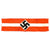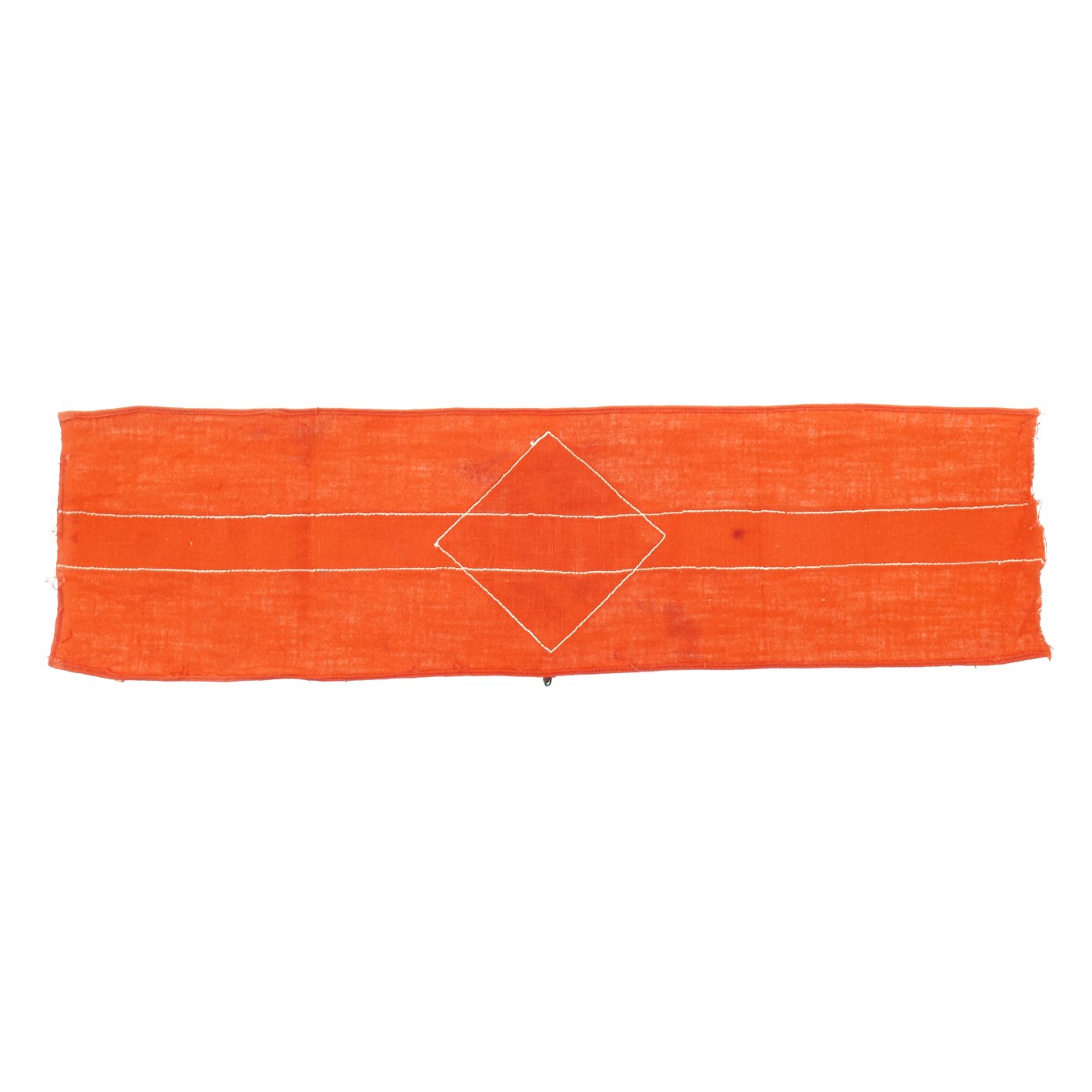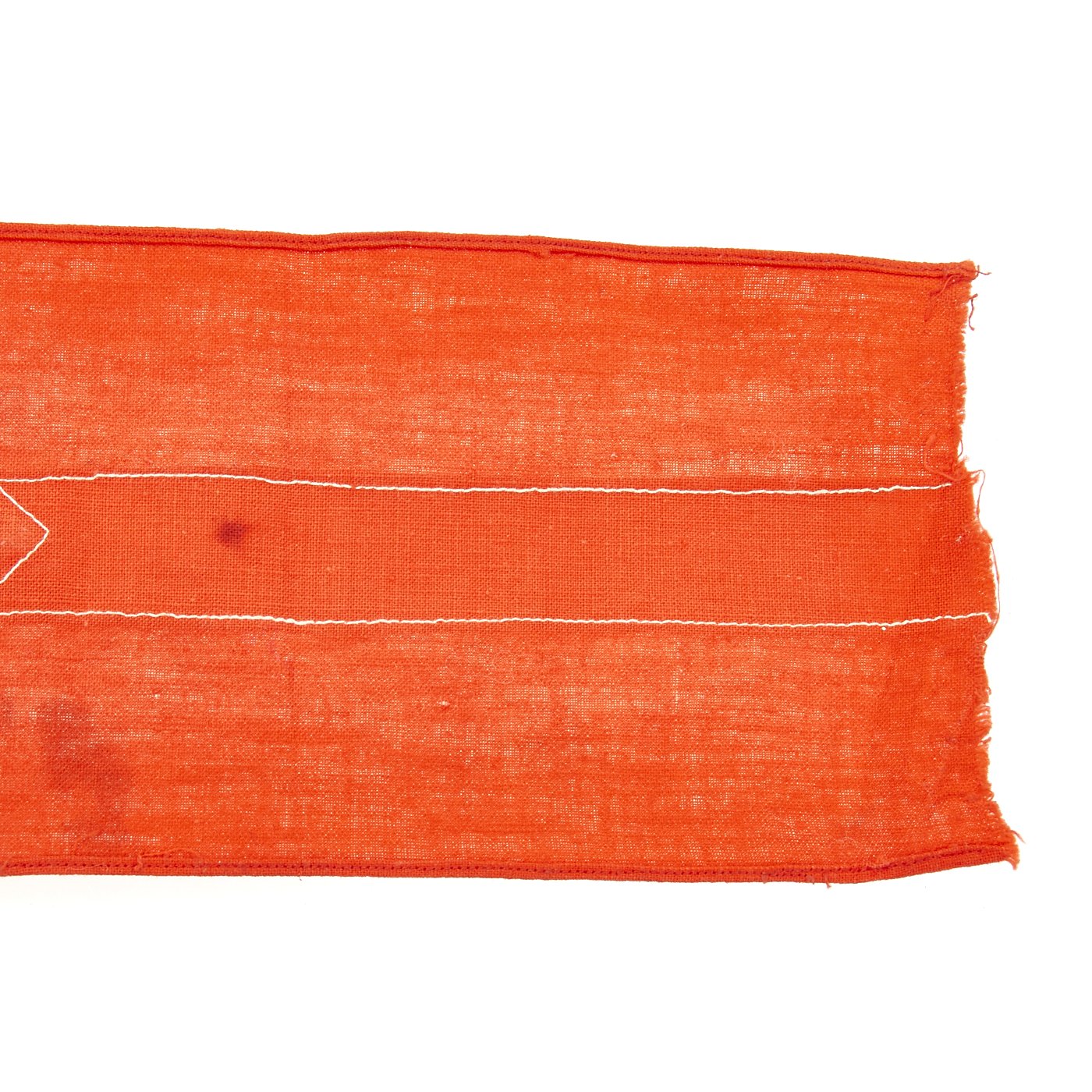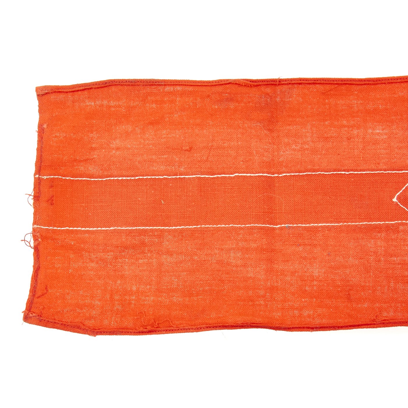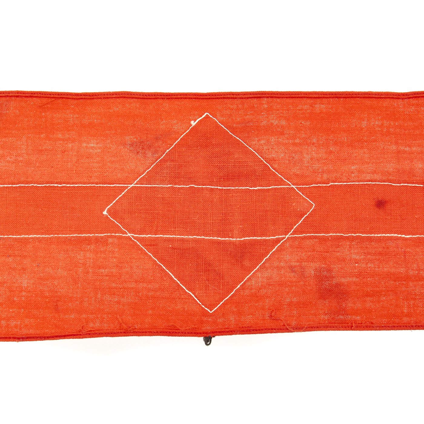 Original Item: Only One Available. This HJ Armband looks to have been worn but remains in very fine condition. It has some light staining, and some of the edge stitching has pulled, but is otherwise solid. The black fabric appears to have had some color bleed due to moisture exposure. The band is red with a white center stripe, with the usual applied HJ diamond with a sewn on swas. Later models would have an embroidered swas, but this one is made of two fabric strps. A very nice HJ Armband, especially if you like examples that have the battle-hardened look provided of a bit of period wear. Overall condition is very good. Measures approximately 14 1/2 " x 4".