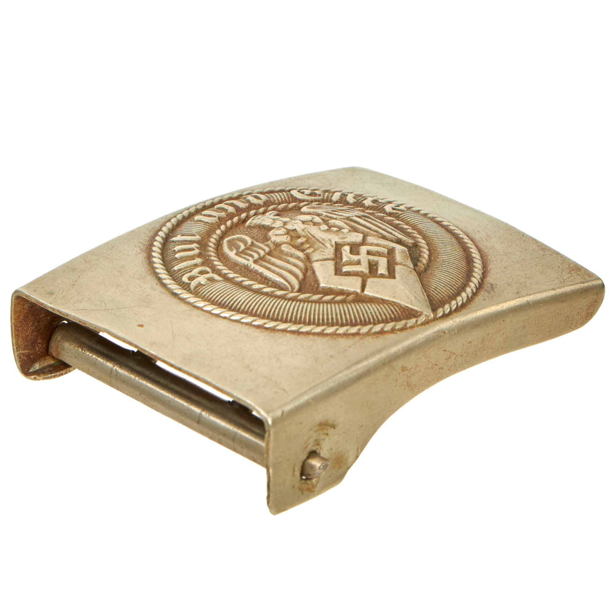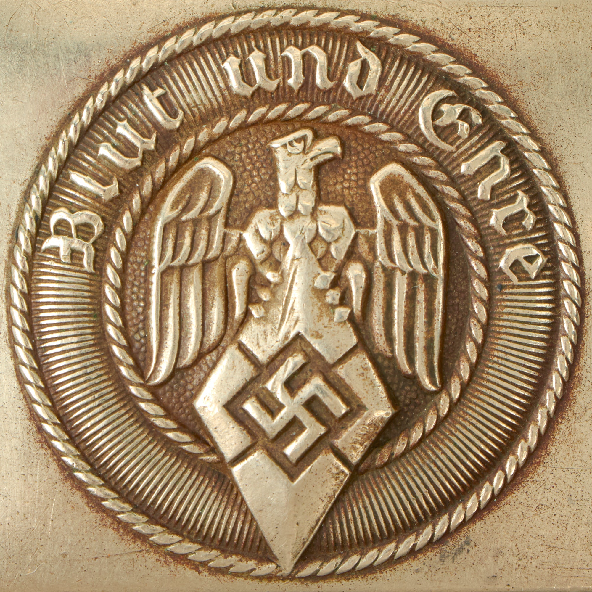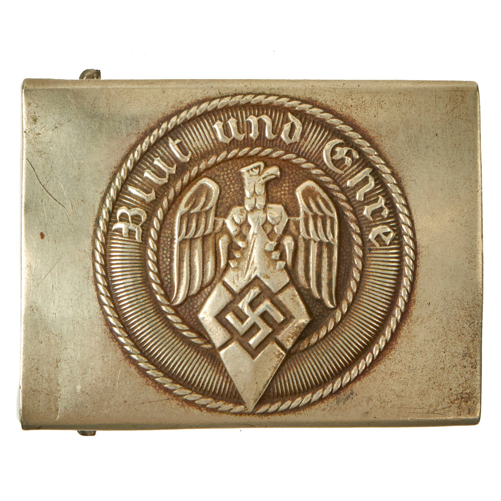 Original Item: Only One Available. This is an excellent WWII German HJ Belt Buckle (Koppelschloß), with a rare solid Nickel Alloy Body. It is embossed with the HJ motto Blut und Ehre (Blood and Honor), around the HJ (H Jugend) diamond logo. The buckle is in near excellent condition, with some wear and light scratches. The early Nickel version of this buckle is very hard to find, and more valuable to collectors.