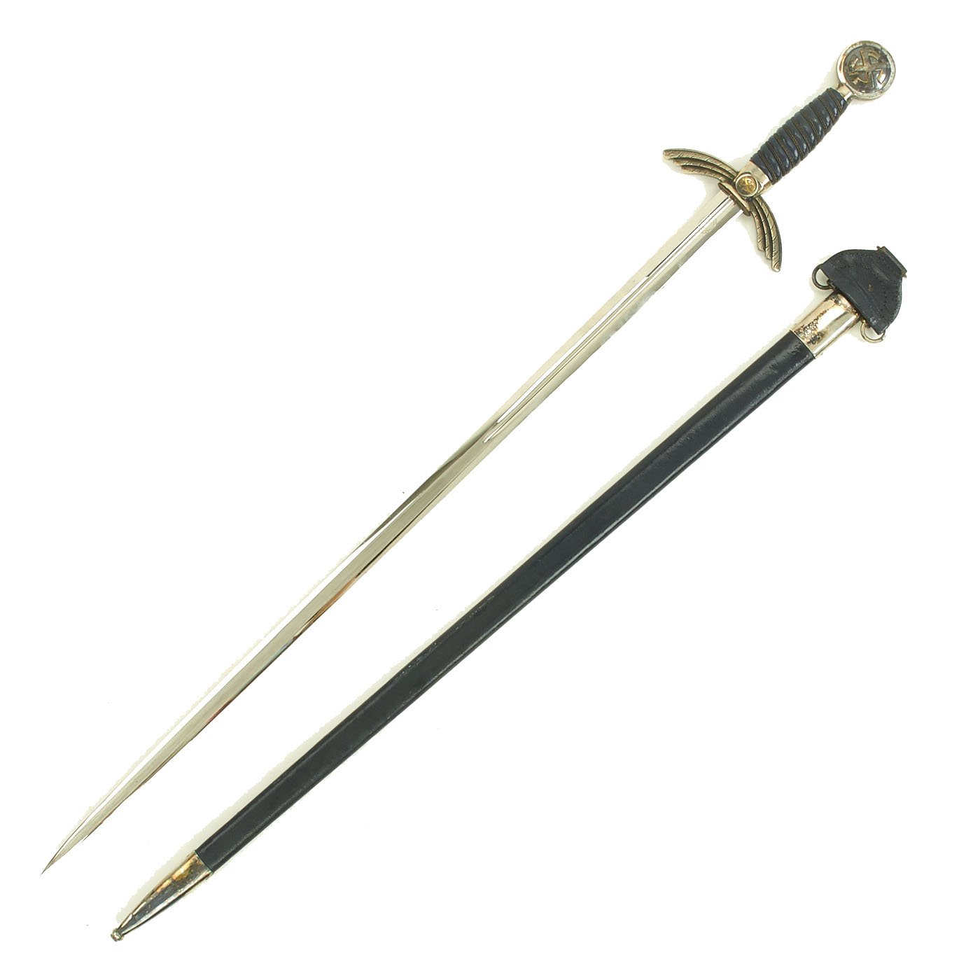 Original Items: Only One Available. This is an excellent early example of a German WWII Luftwaffe Officer's Sword from a famous maker. Early examples such as this were fit with silver-plated nickel alloy mountings, with lovely brass "Sunwheel" style Hankenkreuz (Hook Cross or Swas) emblems. Later they would move to the "Air Age" aluminum material, which didn't develop the lovely patina that this sword has.