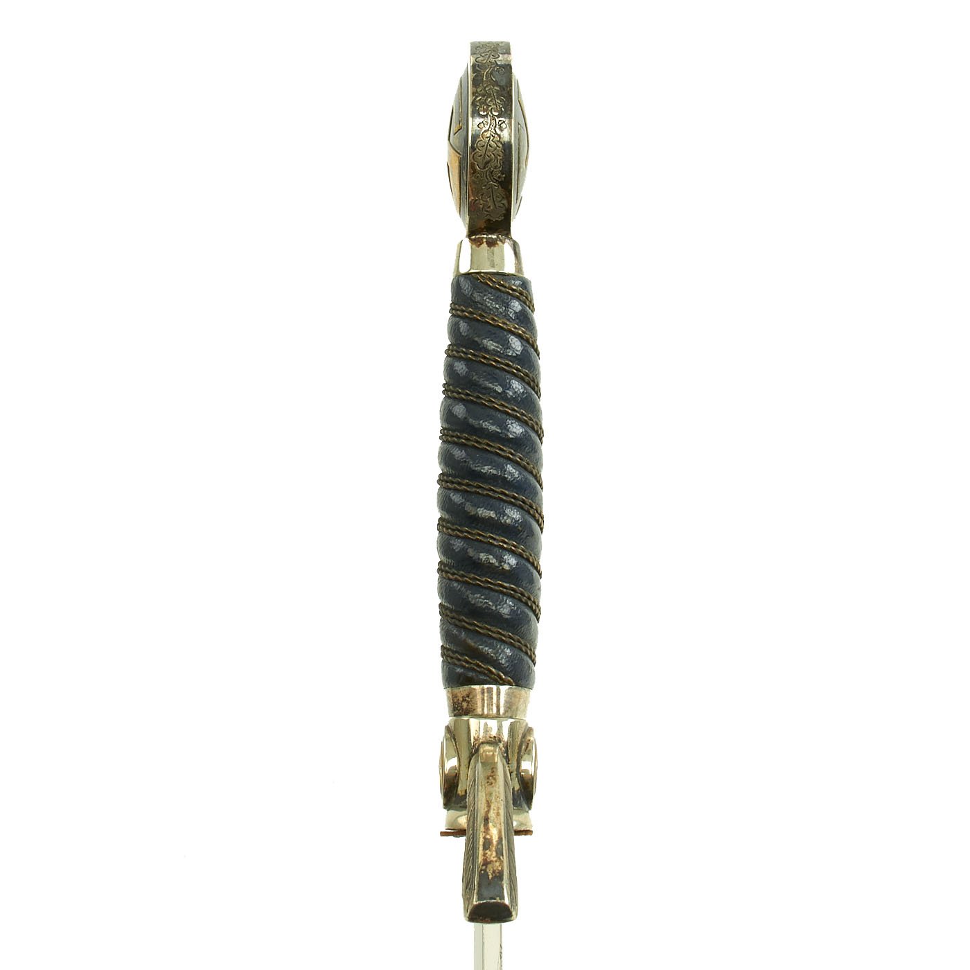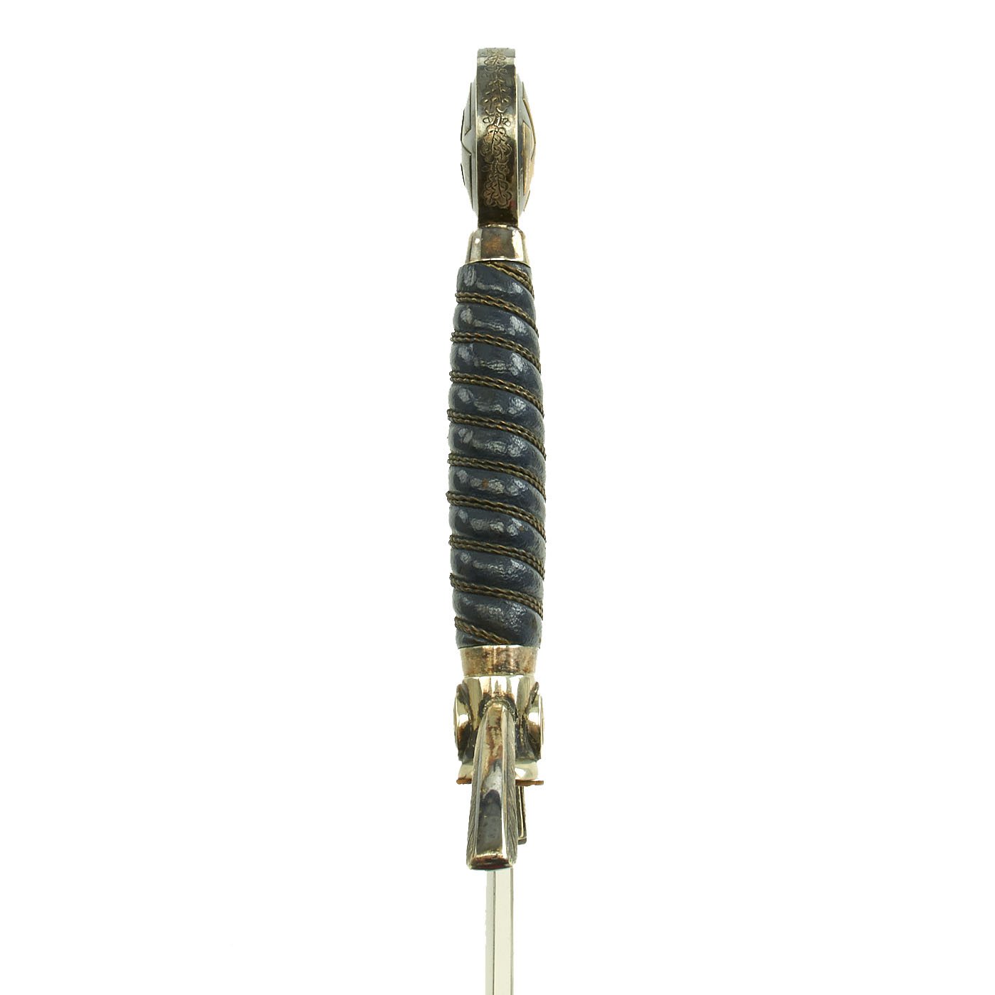 The grip is a wood based type, with original Moroccan blue leather covering. This leather is in very good condition throughout and still shows all of the leather grain. There is no wear through or finish flaking, which makes this a great example. The original double twisted bullion wire wrapping is intact, with a great dark patina and some of the copper base metal showing