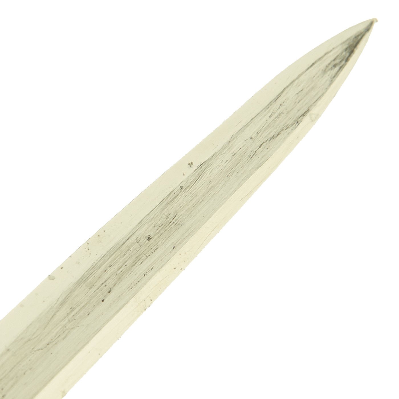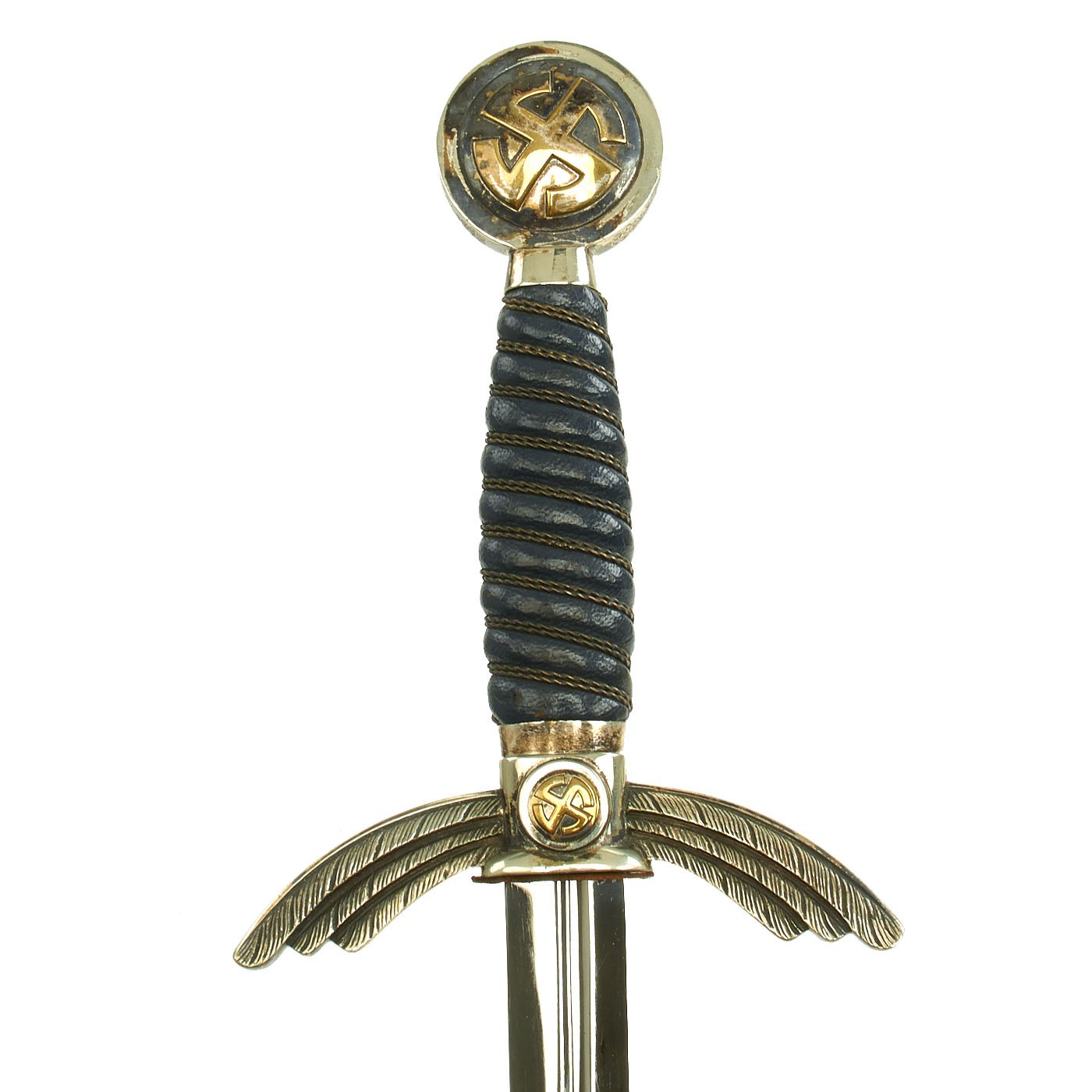 The reverse ricasso of this great sword is maker marked E. & F. HÖRSTER / SOLINGEN in an oval "lozenge" around the company's trademark downward pointing sword piercing interlocking HHS initials. E. & F. Hörster & Co Gmbh, is a well-known maker from Solingen, the famous "City of Blades" in Western Germany, which marketed many fine edged weapons. Originally founded in 1850 as "Friedrich Hörster" in 1850, the company was renamed to E. & F. Hörster in 1870 at the behest of Friedrich Emil & Fritz Hörster. The firm lasted long after WWII, finally being declared insolvent in 1996. For more information please see GERMAN KNIFE AND SWORD MAKERS by J. Anthony Carter. There is also a faint Weimar eagle inspection stamp above the maker mark, a common Luftwaffe inspection mark, who continued to use the Weimar style eagle throughout the war. Also, the original leather blade buffer is still present on top of the cross guard.