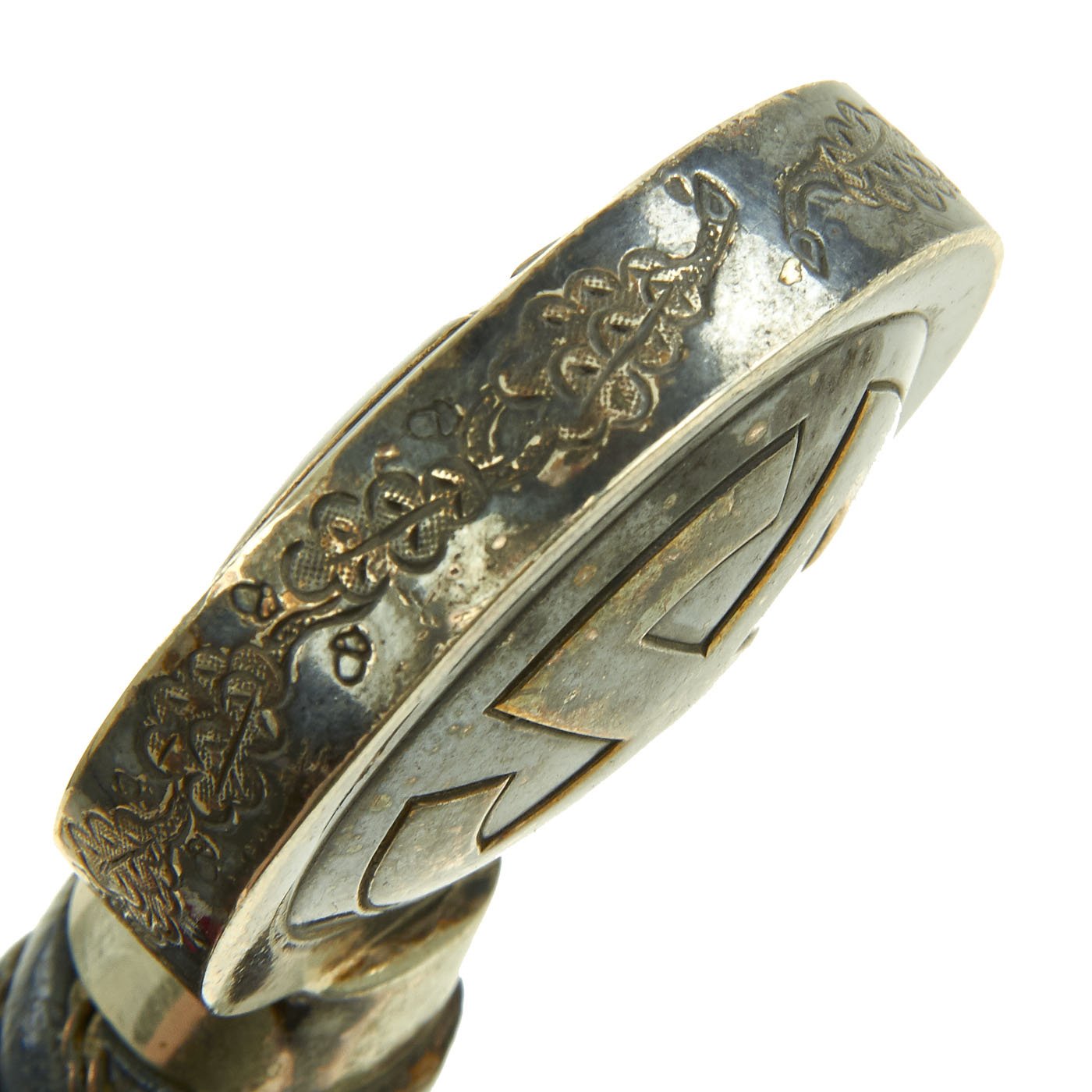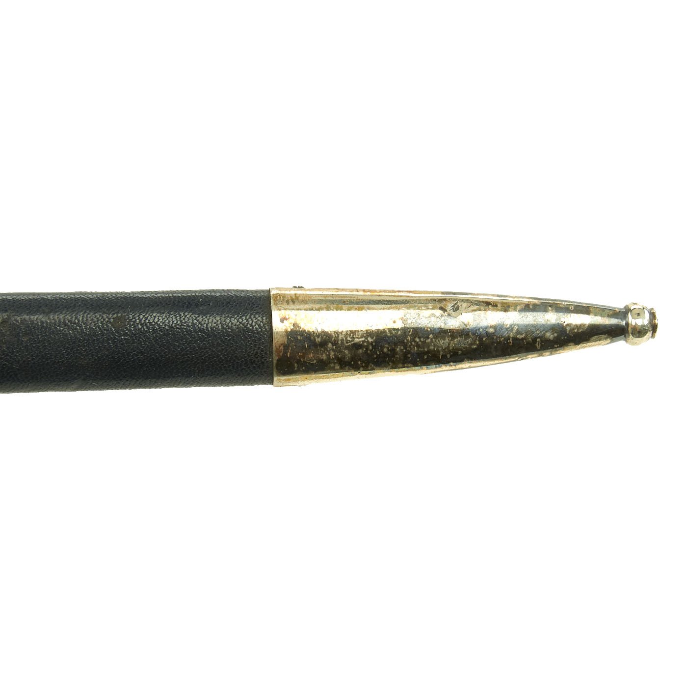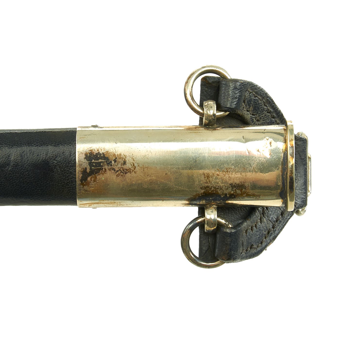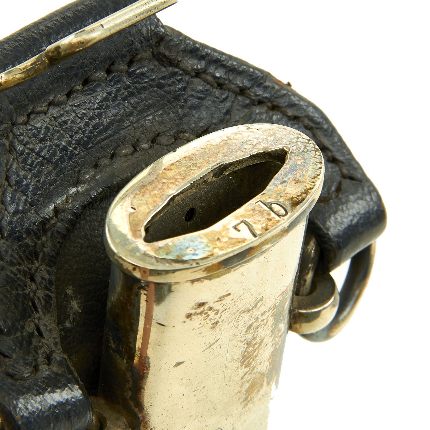 The scabbard shell is nice and straight, with no denting to the metal body. The original Moroccan blue leather here is also in very good shape. There are no cuts or nips; the only signs of age are a few bruises in the surfaces of the leather, but this is to be expected on any Luftwaffe sword. This leather is all there, with only a small bit of lifting at the seam. The scabbard mounts are a fine matching nickel alloy with silver plate. The mounts are in good condition, with fully intact plating with a great patina in places. The Moroccan leather sword hanger is present, and shows age, with wear to the leather, but is fully intact and has no repairs.