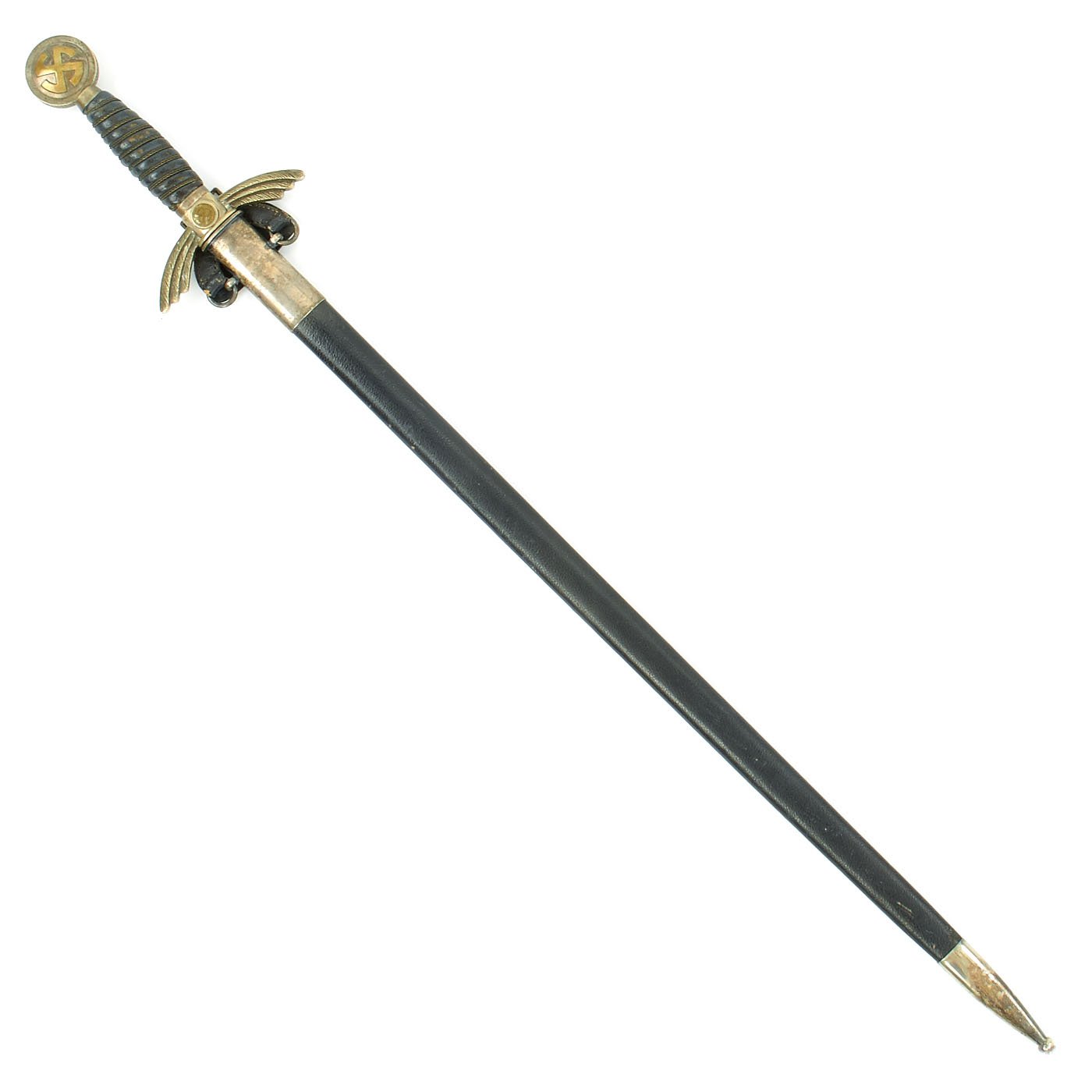 Original Items: Only One Available. This is an excellent early example of a German WWII Luftwaffe Officer's Sword from a famous maker. Early examples such as this were fit with silver-plated nickel alloy mountings, with lovely brass "Sunwheel" style Hankenkreuz (Hook Cross or Swas) emblems. Later they would move to the "Air Age" aluminum material, which didn't develop the lovely patina that this sword has.