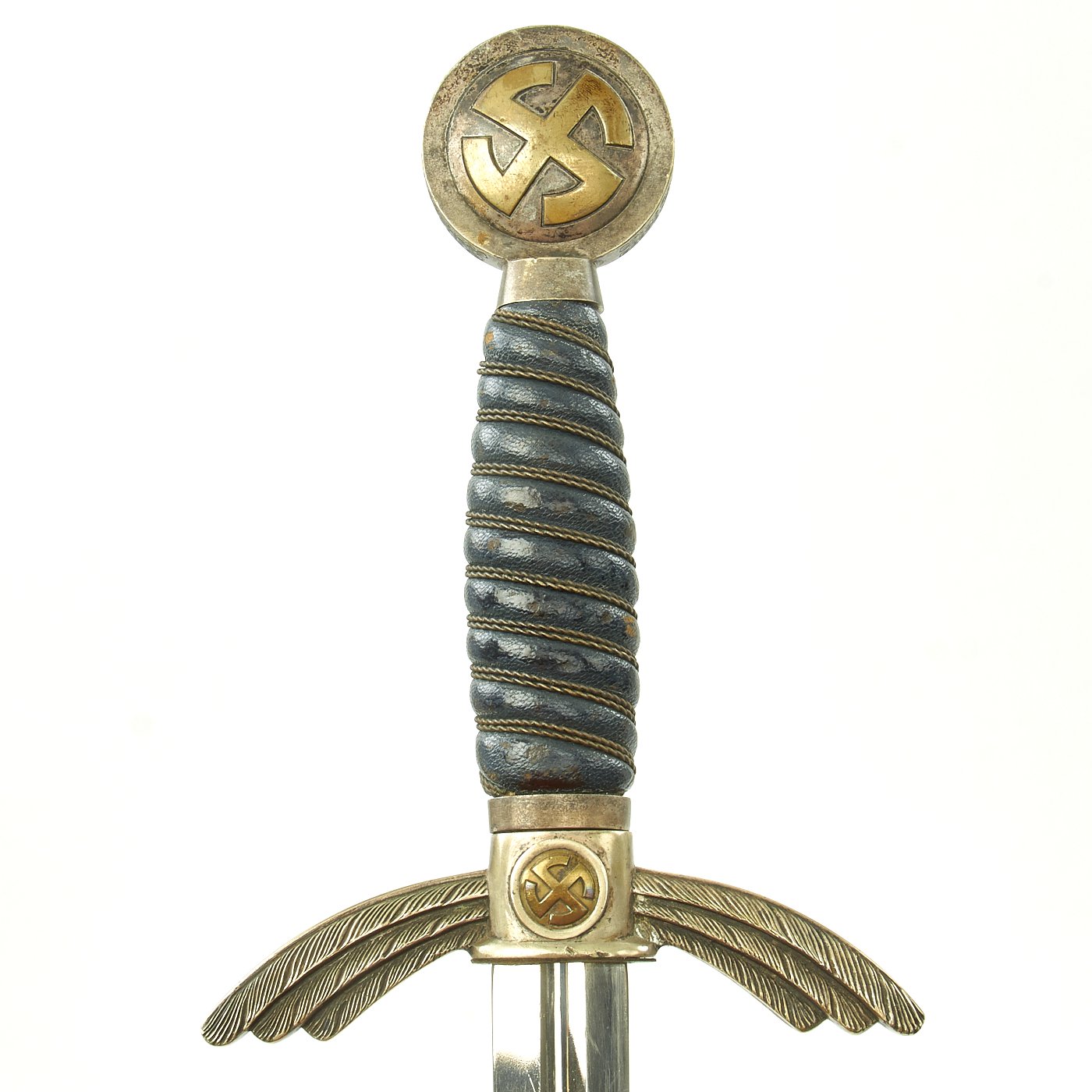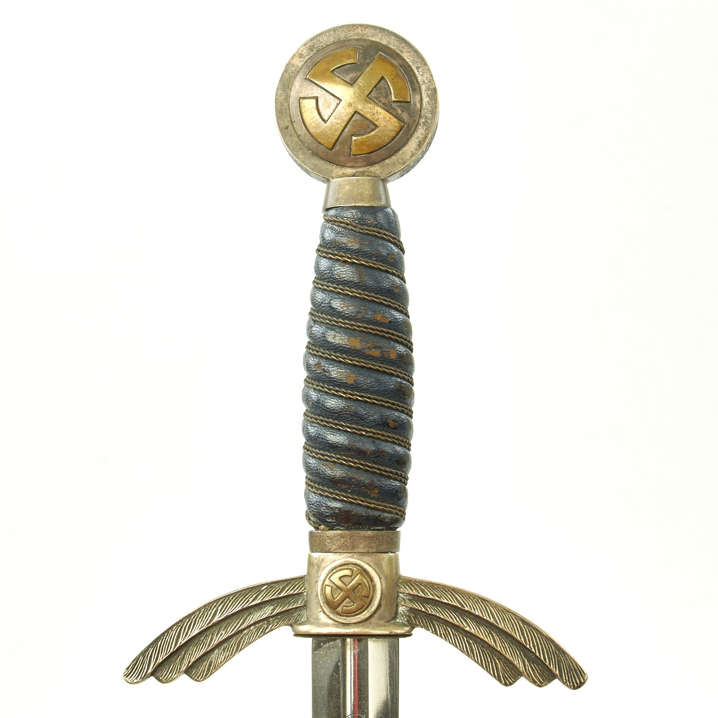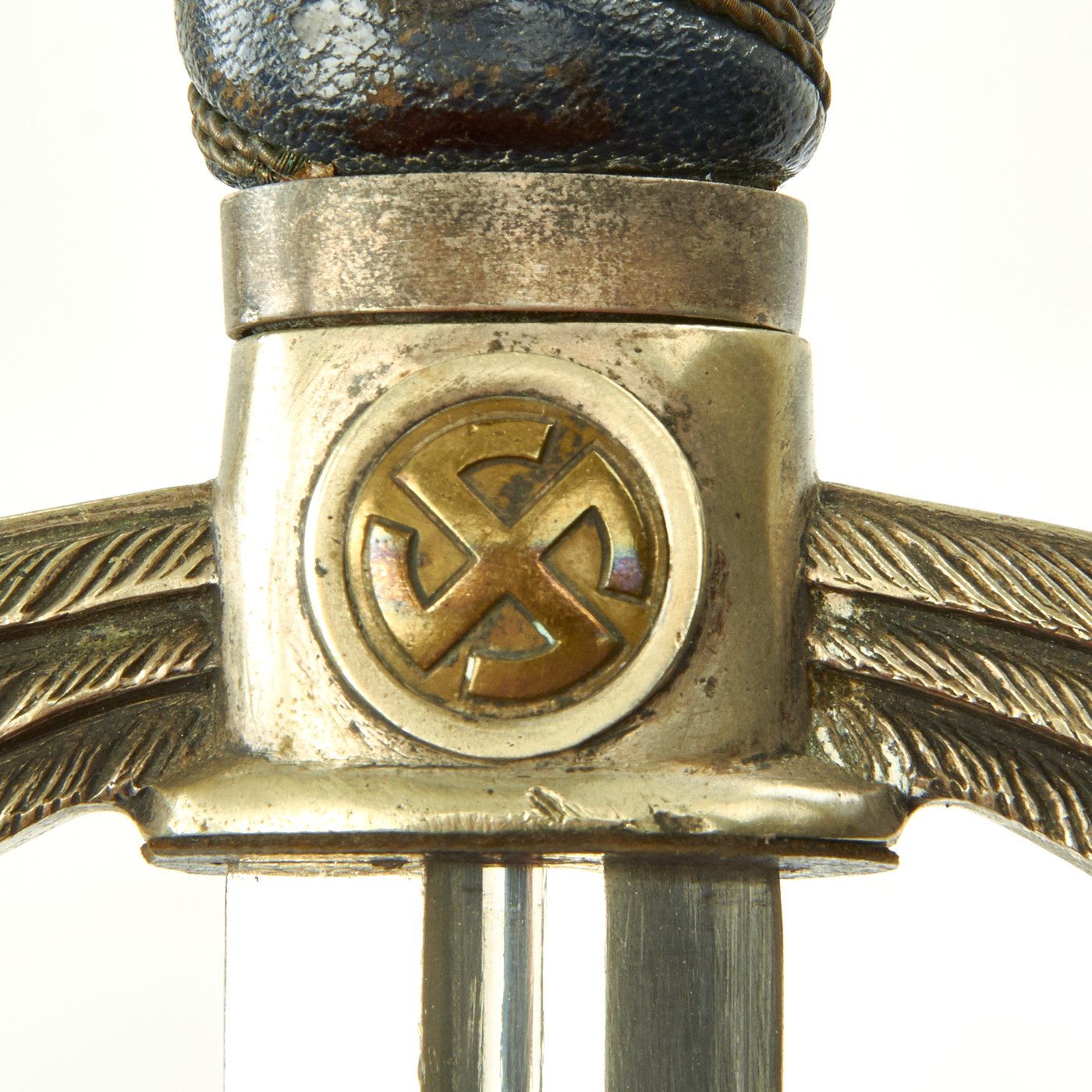 This early Luftwaffe Sword has very nice plated nickel alloy mounts, with brass caps for the Swas designs. They do not look to have been cleaned in many years and are developing a desirable patination, with no plating wear through we can see. The pommel has very nice rims, with just some edge scratching, and very nice stamping to the oak leaves and acorns which run around the circumference. The medallion sun wheels very good as well, having great aged brass finish which really sticks out against the silver next to them. The lower cross guard sun wheels are brass inserts, so they do not have sivering between the legs. The crossguards are nice and crisp and they both have good detail to the feathering of the downward pointing quillons, which still have a lot of the plating.