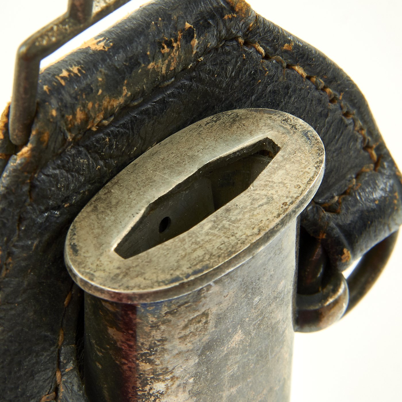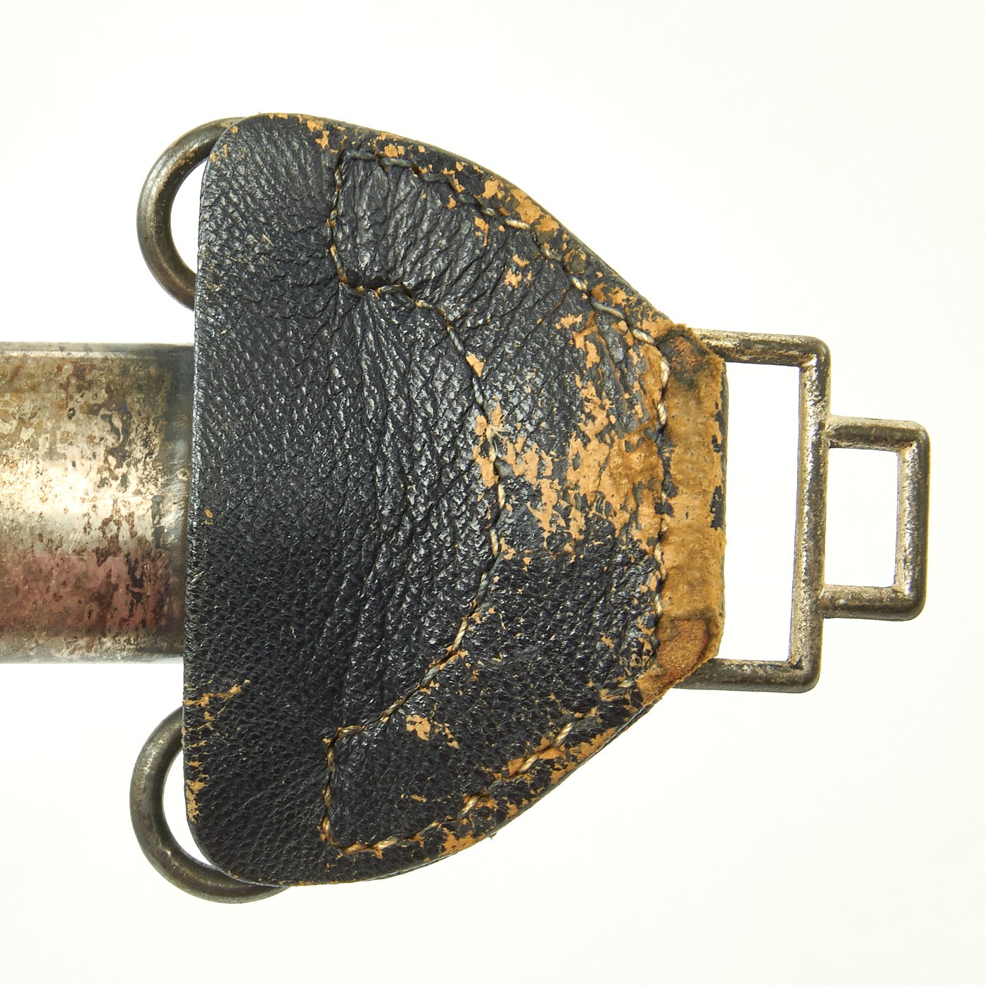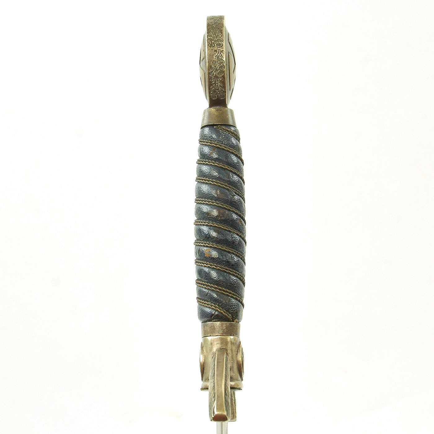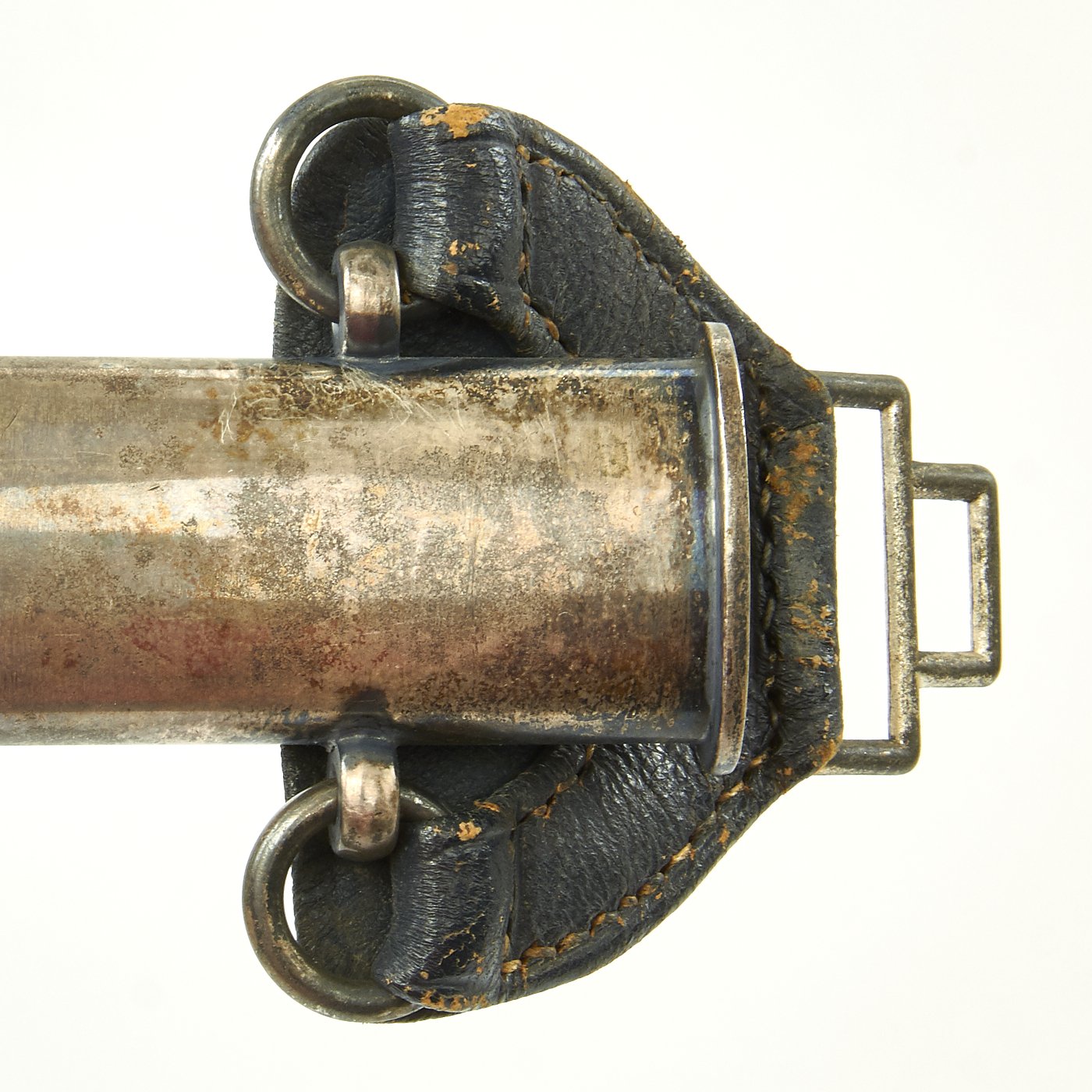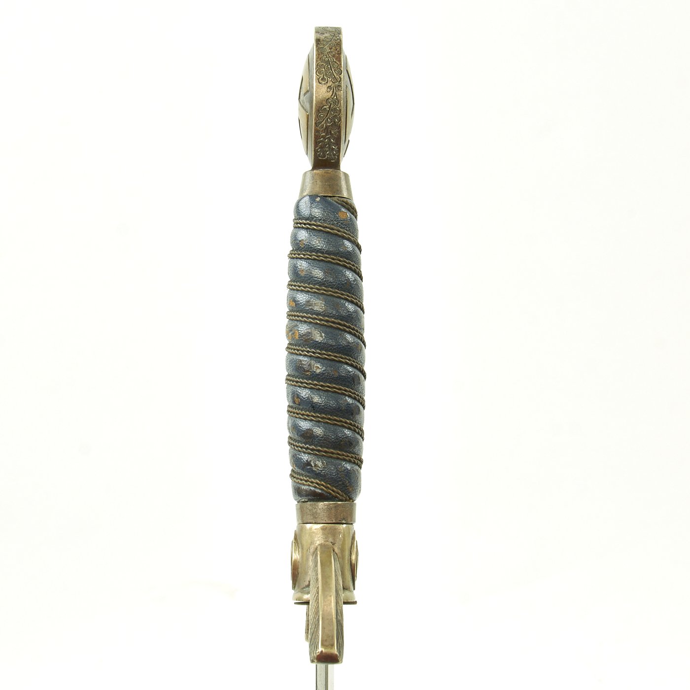 The scabbard shell is nice and straight, with no denting. The original Moroccan blue leather here is also in good shape. There are no cuts or nips; the only signs of age are a few bruises in the surfaces of the leather where the finish is worn off, but this is to be expected on any Luftwaffe sword. This leather is all there, with no lifting. The scabbard mounts are a fine matching nickel alloy with silver plate. The mounts are in good condition, with fully intact plating with a great patina. The Moroccan leather sword hanger is present, and shows age, with wear to the leather, but is fully intact and has no repairs.