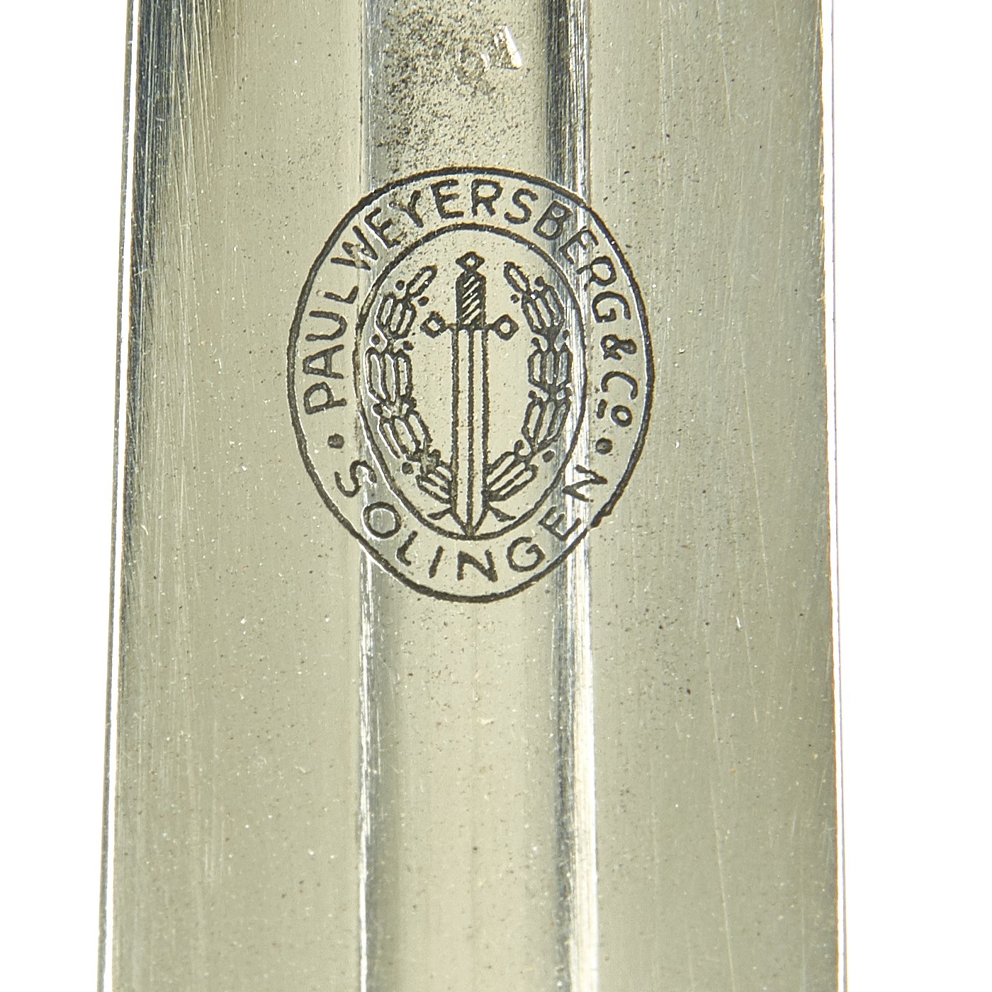 This great example was made by Paul Weyersberg of Solingen, the legendary "City of Blades" in western Germany. The reverse ricasso is etched with PAUL WEYERSBERG & Co. / SOLINGEN in double ovals around the firms trademark "Sword-and-Wreath" logo, which was the only marking they used during the Third Reich era. This company was one of many in Solingen owned by members of the Weyersberg family. The company survived the war, but ceased production in 1955. For more information please see GERMAN KNIFE AND SWORD MAKERS by J. Anthony Carter.