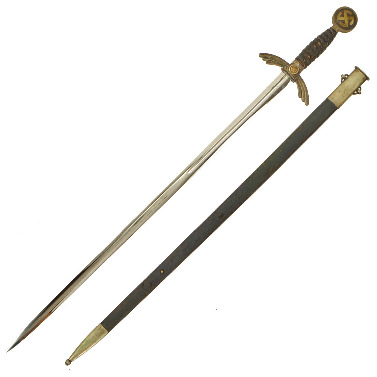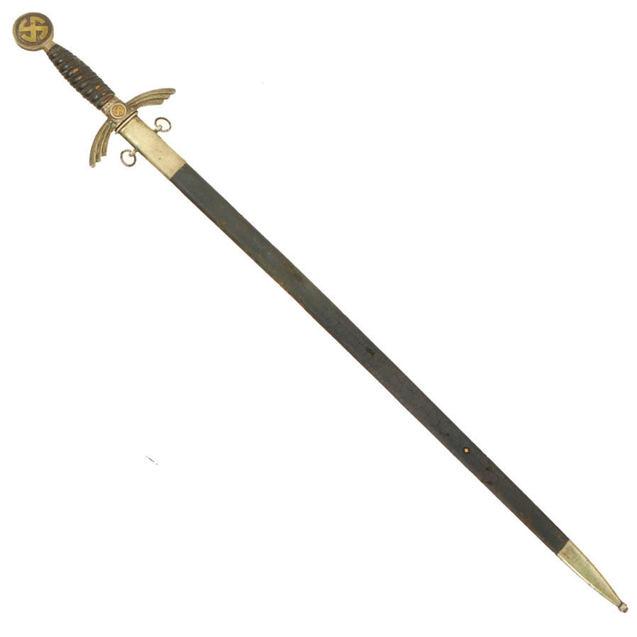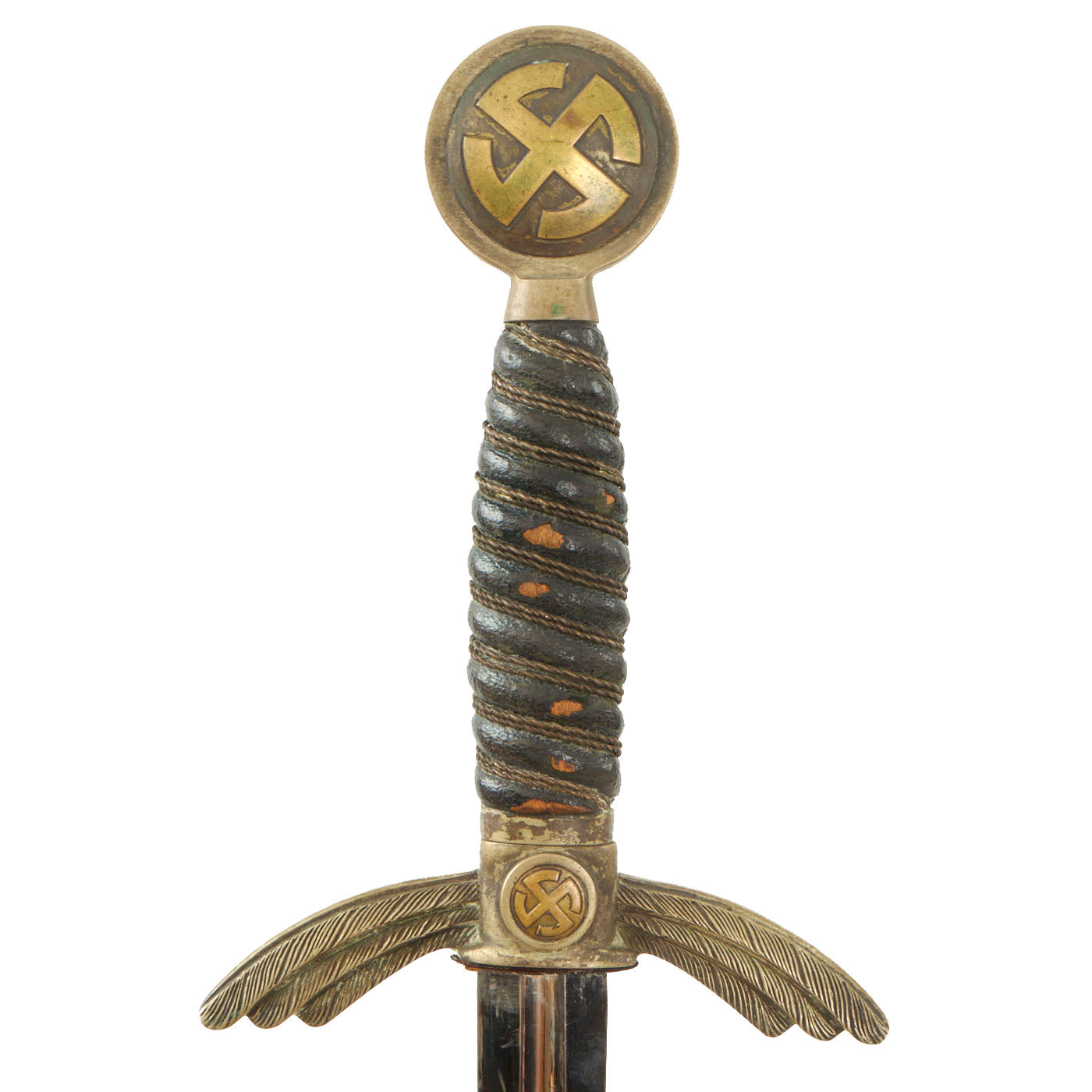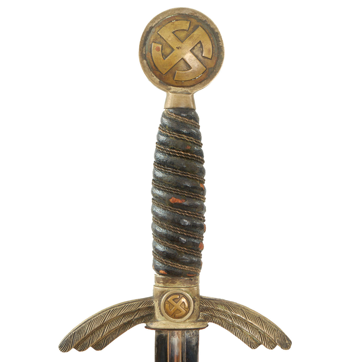 Original Items: Only One Available. This is a very nice early example of a German WWII Luftwaffe Officer's Sword, made by rare maker F. & A. Helbig, Messerfabrik (knife factory). Early examples such as this were fit with silver-plated nickel alloy mountings, with lovely brass "Sunwheel" style Hankenkreuz (Hook Cross or Swas) emblems. Later they would move to the "Air Age" aluminum material, which didn't develop the lovely patina that this sword has.