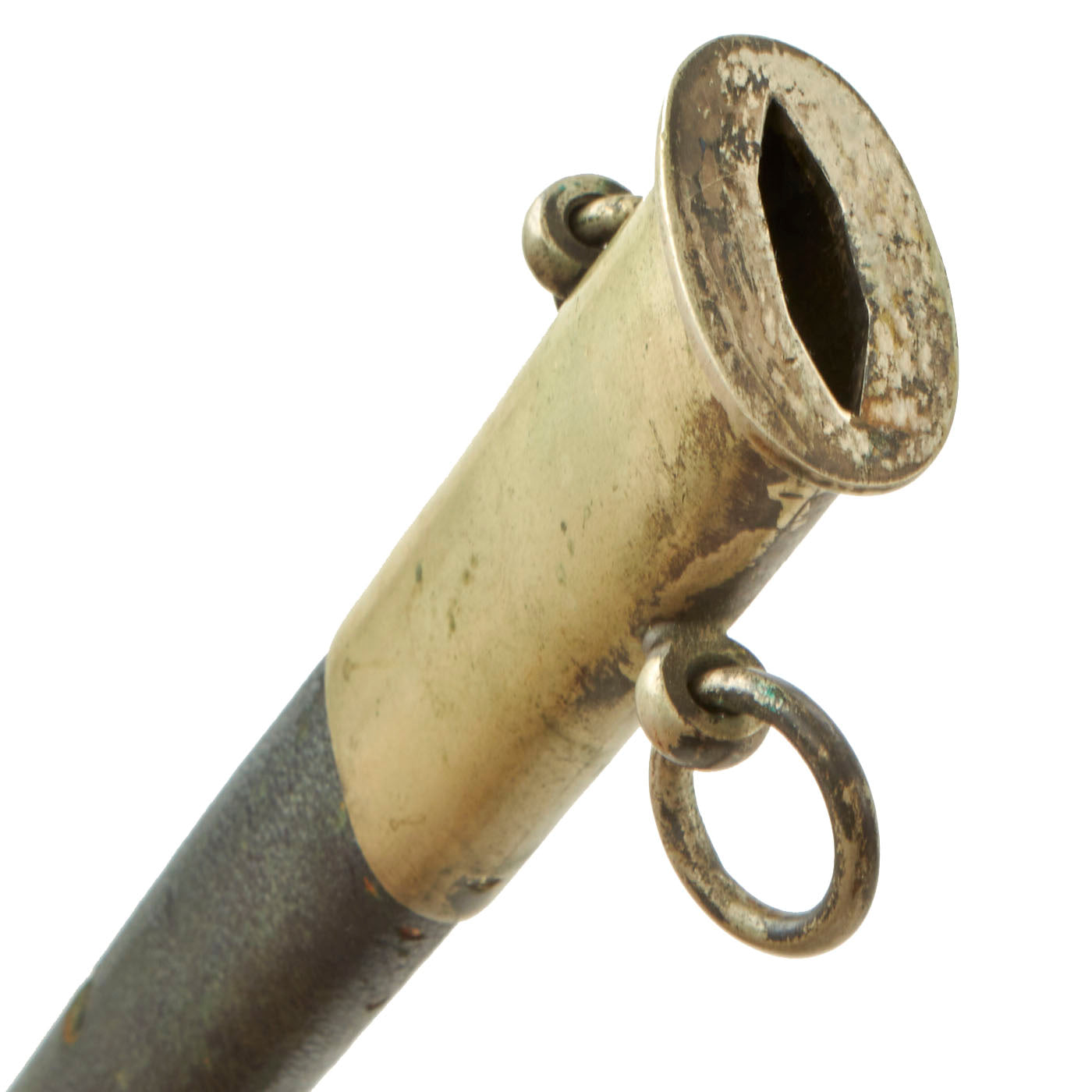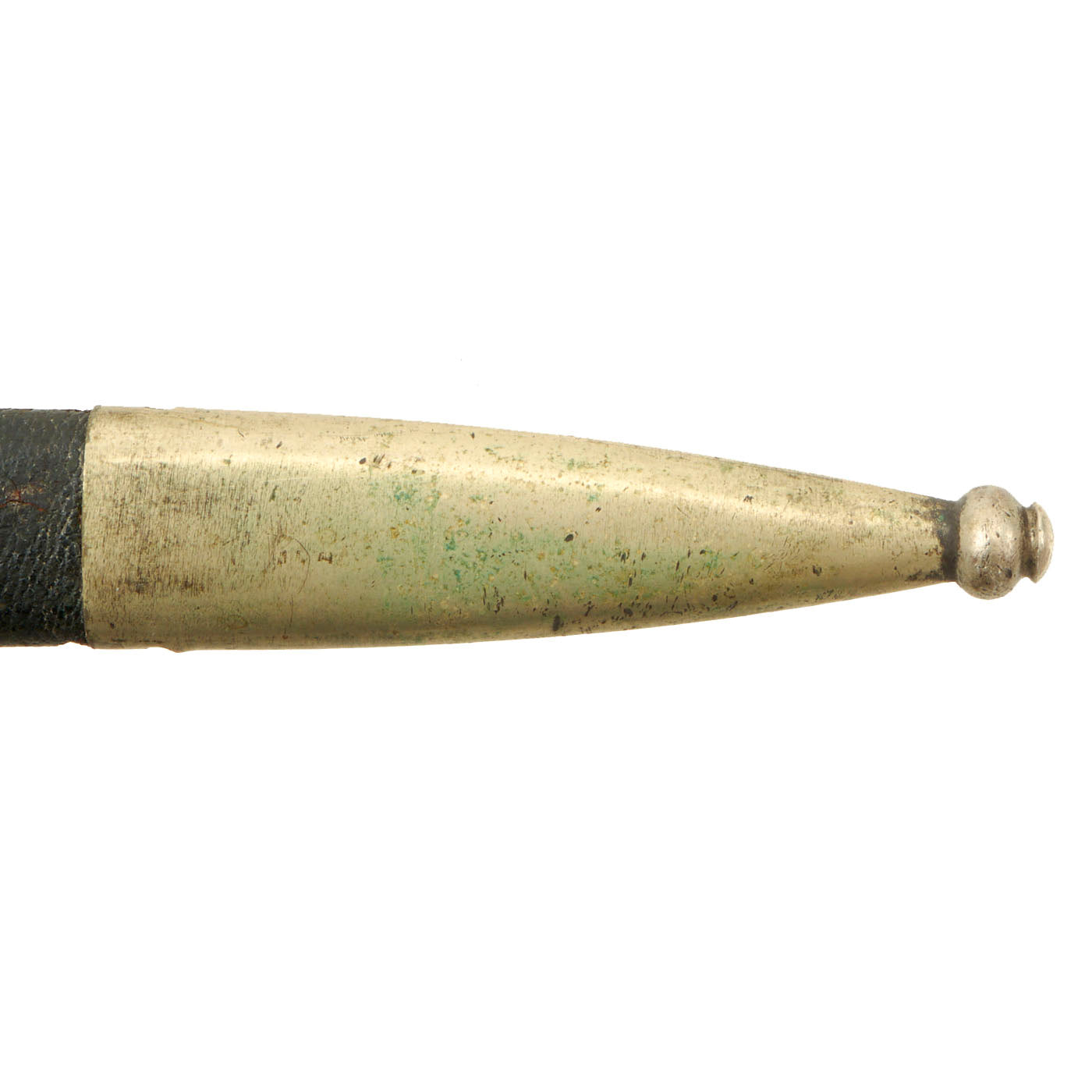 The scabbard shell is nice and straight, with no denting to the metal body. The original Moroccan blue leather however has definitely aged, as on the grips. One side has cracking through the finish as well as through the entire leather cover. There is one space where the underlying alloy body can be seen. The scabbard mounts are a fine matching nickel alloy with silver plate. The mounts are in good condition, with mostly intact plating with a great patina in places. The leather sword hanger is unfortunately absent.