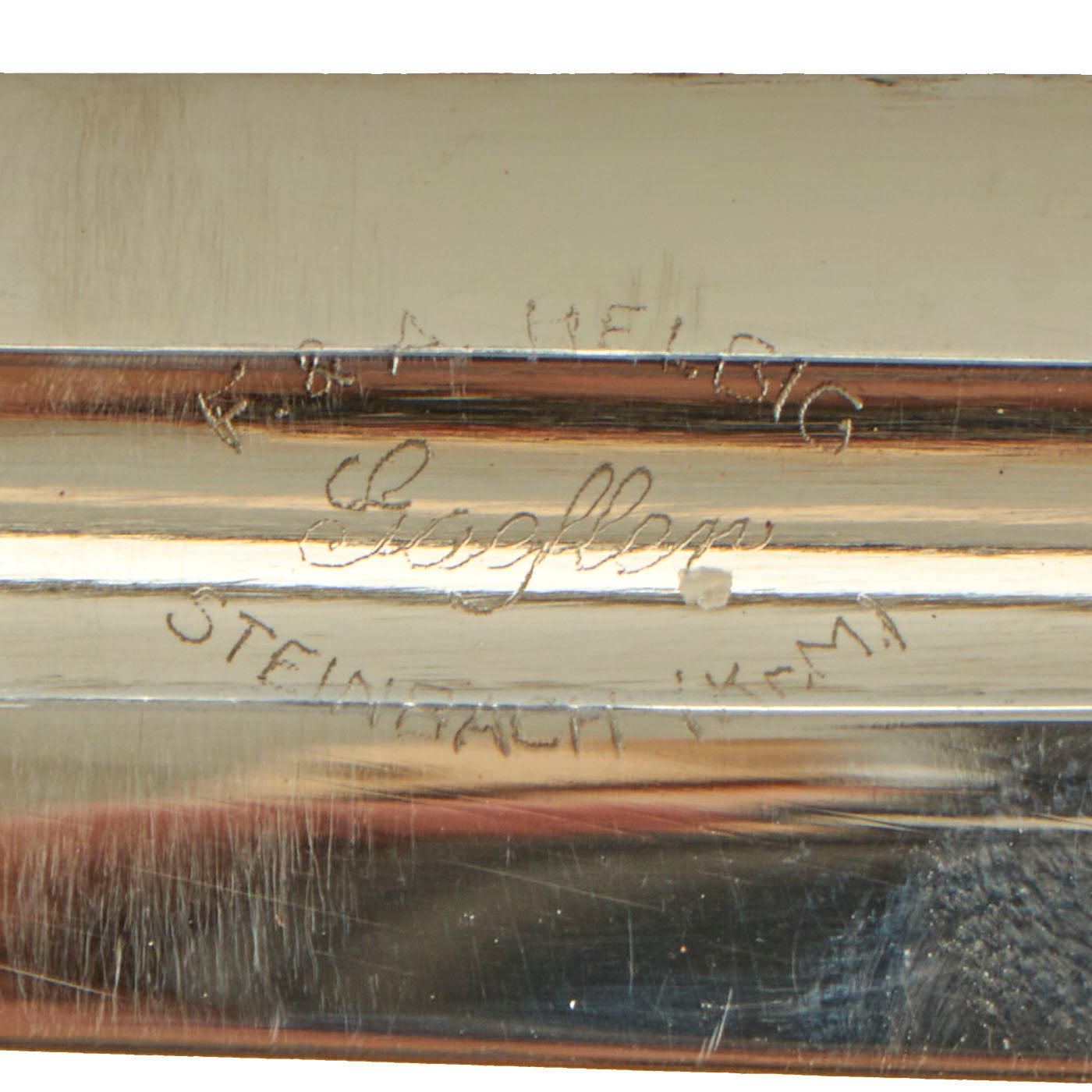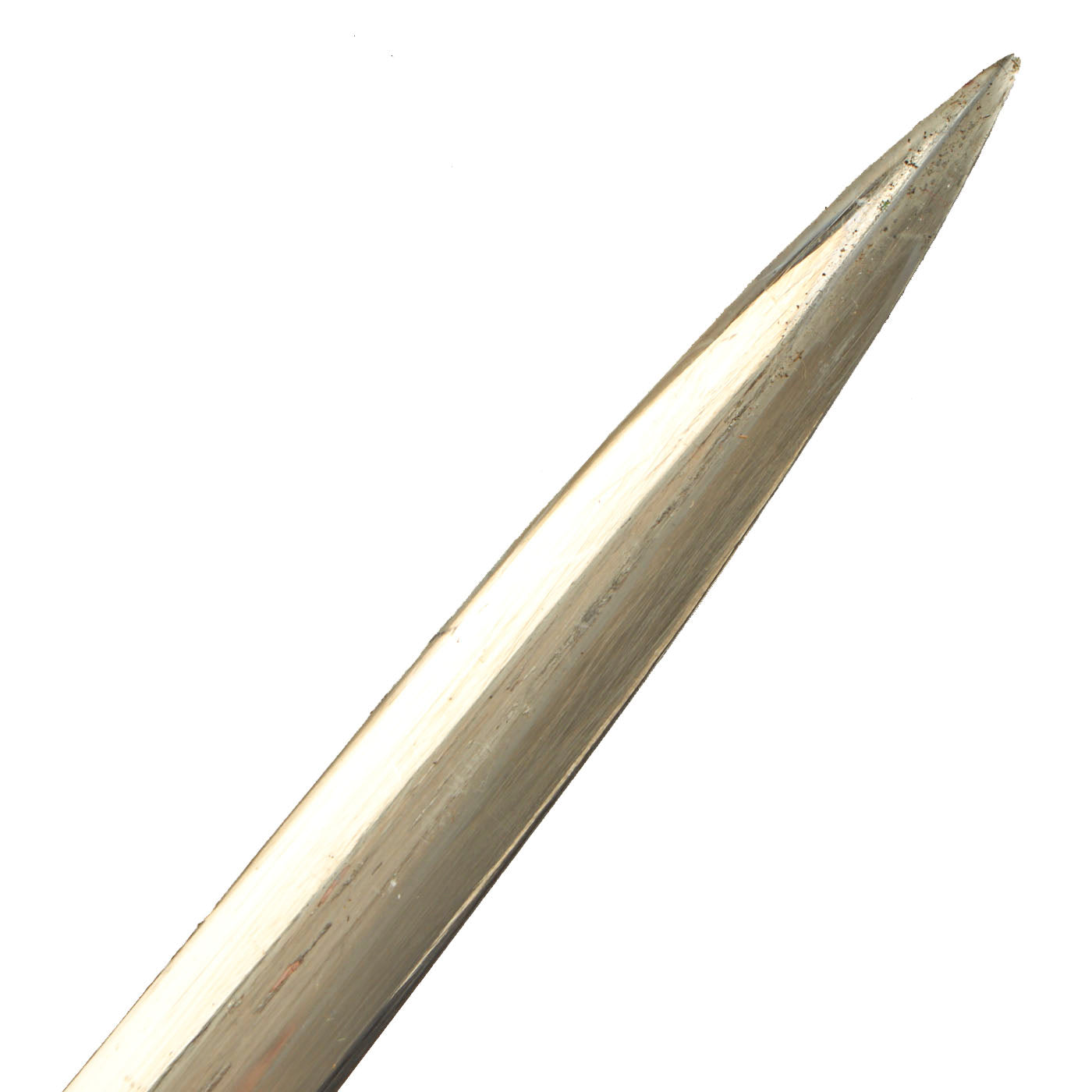The 28 1/2" blade is fully nickel plated, and looks incredible, with a near mirror finish, with just a few areas of runner wear and scuffing. There are no chips or nicks in the edge on the blade, and it was never sharpened, correct for a dress sword. Truly an very nice example of WWII production blade from a rare maker.