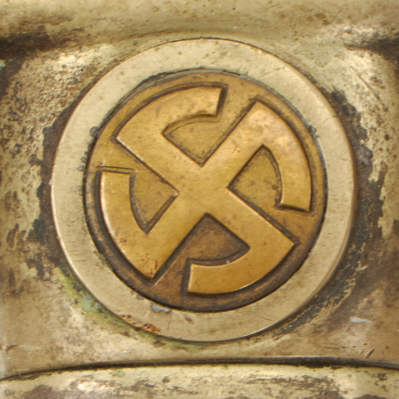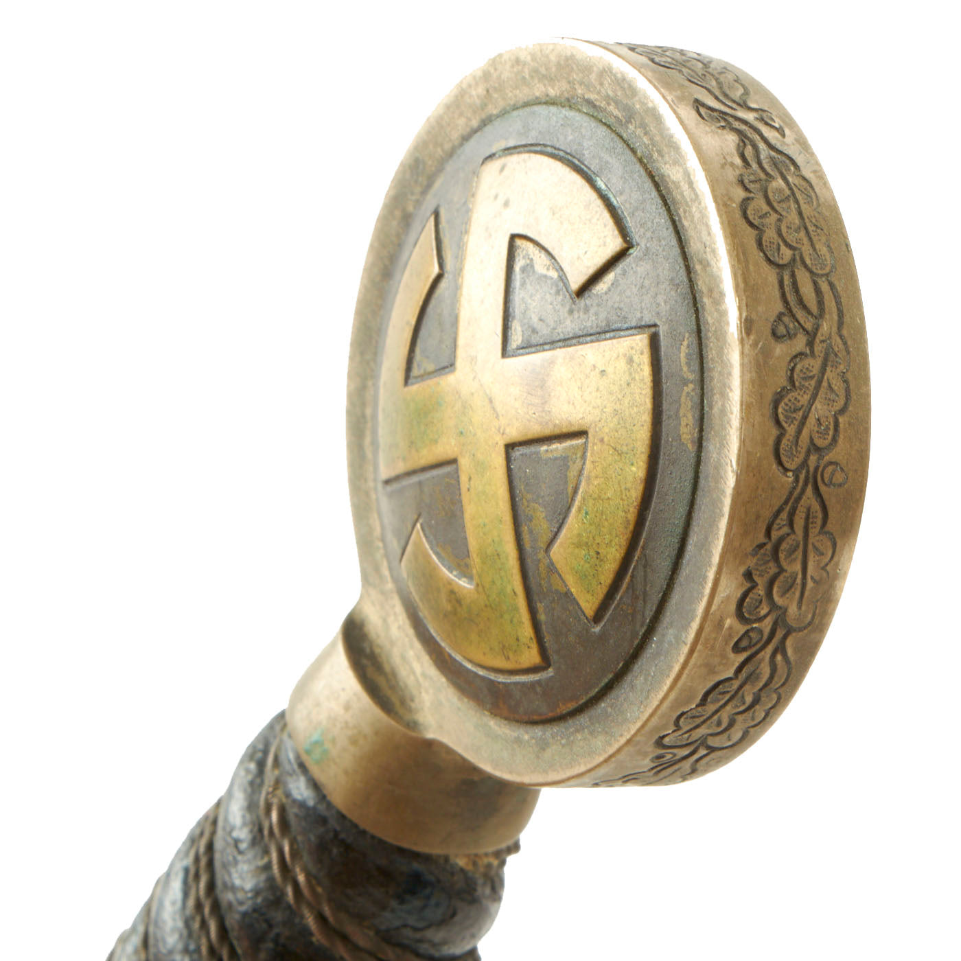 This early Luftwaffe Sword has very nice plated nickel alloy mounts, possibly silver plated. This example has brass inserts for the "Sunwheel" swas designs on the pommel and crossguard. They do have the plating between the "arms" worn through for hte most part. The pommel has very nice rims, with just a few dents and scratches, and very nice stamping to the oak leaves and acorns which run around the circumference. The crossguards are nice and crisp and they both have good detail to the feathering of the downward pointing quillons, which still have a lot of the plating.