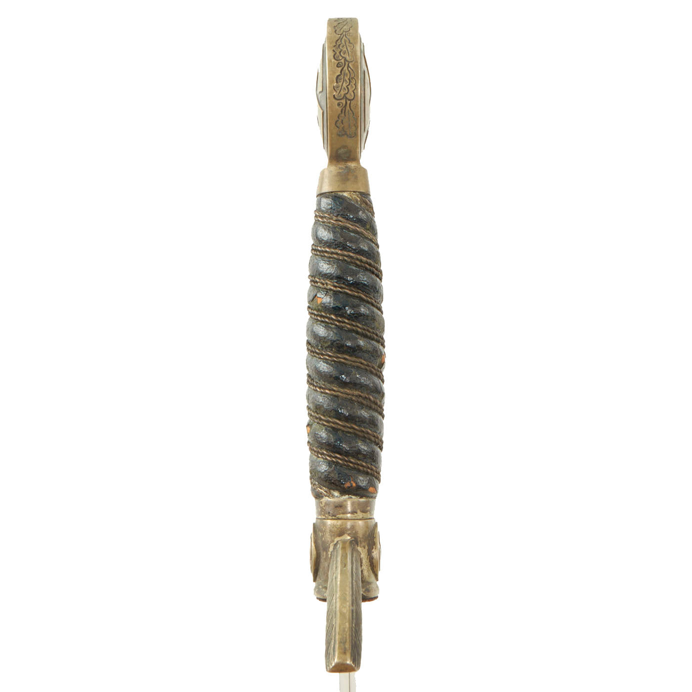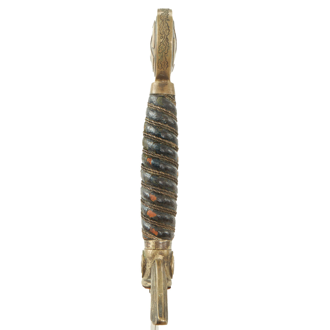 The grip is a wood based type, with original Moroccan blue leather covering. This leather is in good condition throughout, showing wear through the finish and down to the wood in places. The original double twisted bullion wire wrapping is intact, though the plating is worn, so much of the copper base can be seen, as well as oxidation. It definitely looks to have seen service during the war.