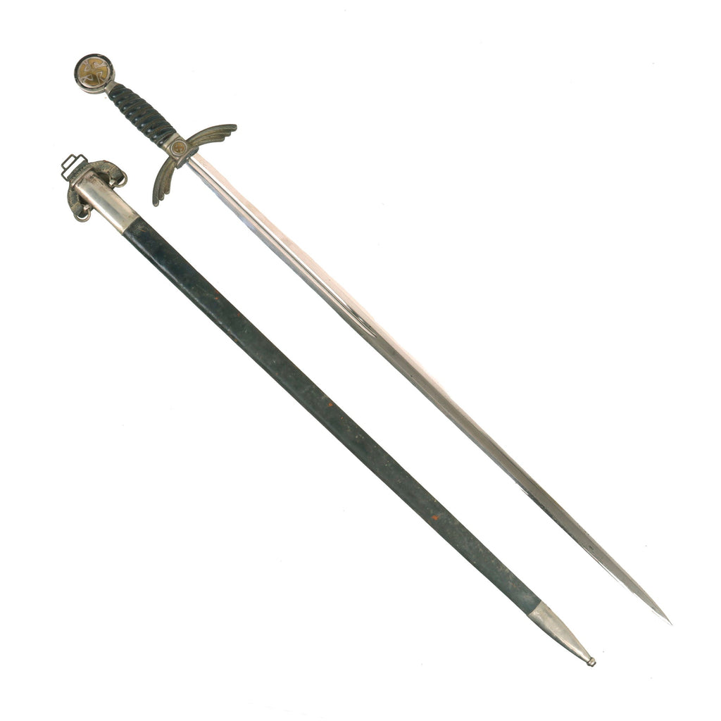 Original Items: Only One Available. This is a very good condition early example of a German WWII Luftwaffe Officer's Sword from the famous maker SMF. Early examples such as this were originally fit with silver-plated nickel alloy mountings, with lovely brass "Sunwheel" style Swas (Hook Cross) emblems. These were also often coated with a lovely "blue oxide coating" as well, common on edged weapons from other branches. Later they would move to the "Air Age" aluminum material, which didn't develop the lovely patina that this sword has.