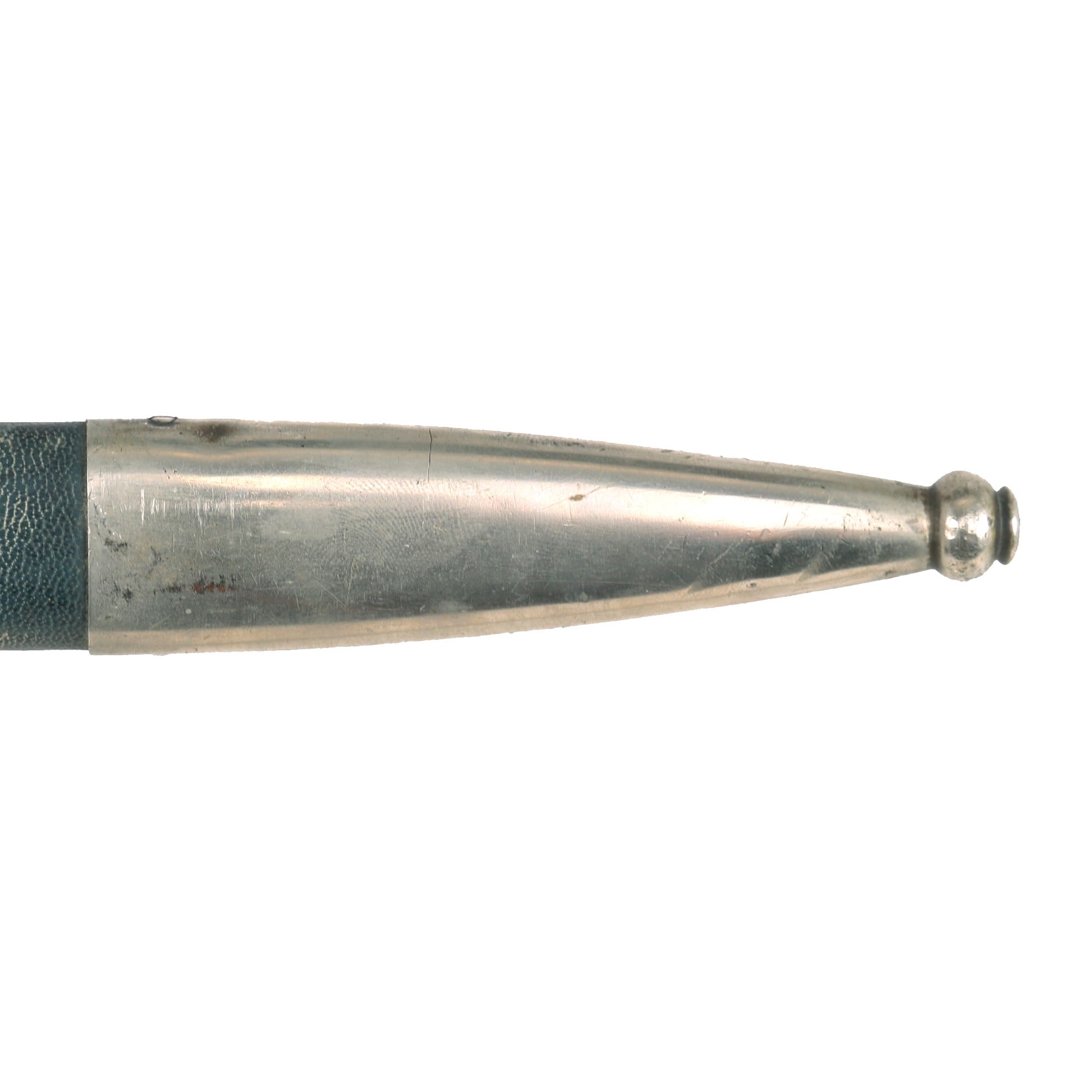 The scabbard shell is nice and straight, with no denting to the metal body that we can see, though it does have a bit of a bend, which does not interfere with sheathing the blade. The original Moroccan blue leather here is also in good shape, showing some small areas of finish loss and pressure denting, but no major tears or other damage, just overall wear and some whitish deposits on the exterior. The original seam is still securely glued down, and we honestly cannot tell where it is. The scabbard mounts are a fine matching nickel alloy with worn plating. The mounts are in good condition, showing a lovely nickel patina with a few areas original silvering remaining. The sword hanger is present, but definitely shows old dried dirt in the grain of the leather. It also shows cracking in the leather around the scabbard loops on both sides, with one side torn through.