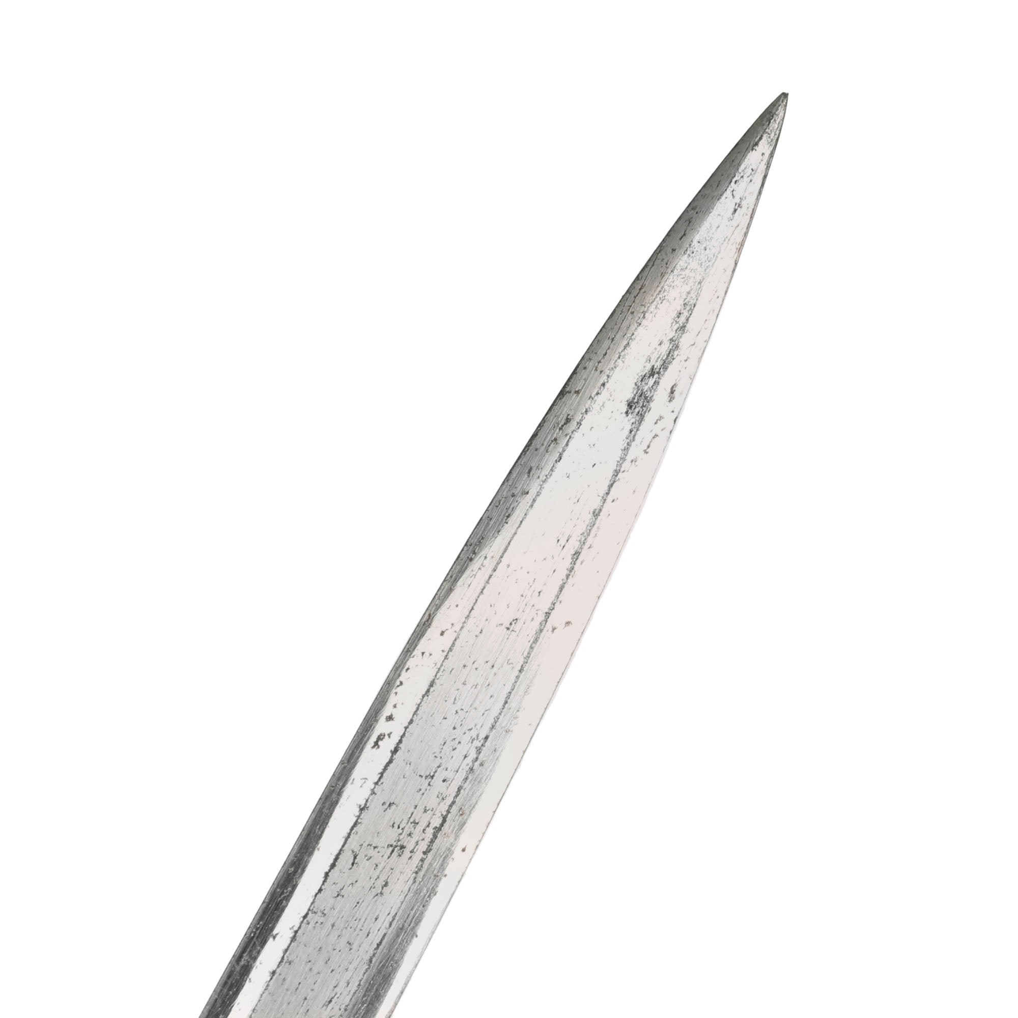 The blade of this example measures 30 1/8 inches, and is in very good lightly used condition. The nickel plating is still retained very well on the blade, showing some wear from the runners and cleaning. There is scattered minor plating flaking and oxidation on much of the blade surface, and it definitely looks to have been in service for some time. The edge is unsharpened, which is correct, though it does show some bends and small dings. The point of the blade is still intact and unbent. The leather blade buffer at the top of the cross guard is still present, with almost all of the original blue finish.