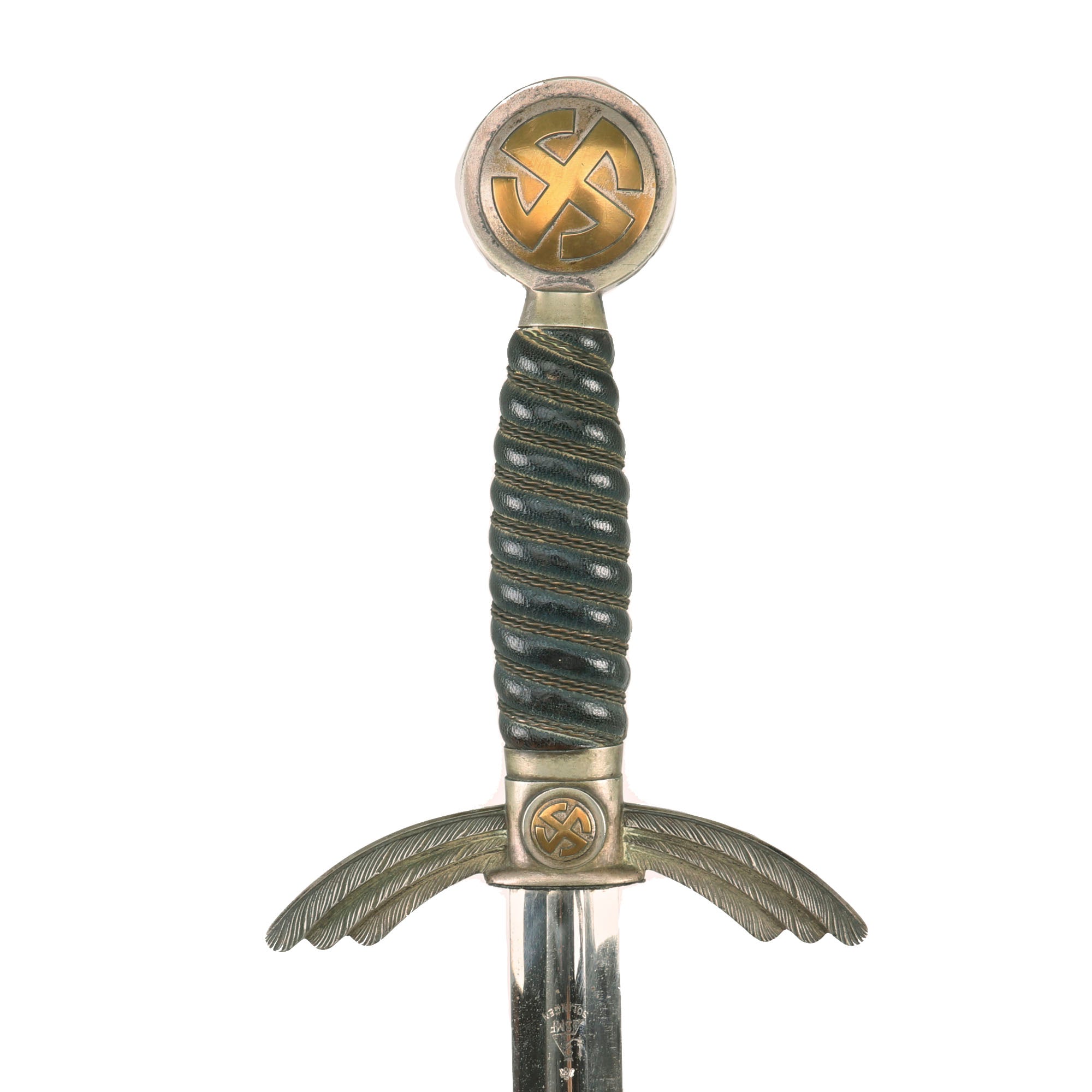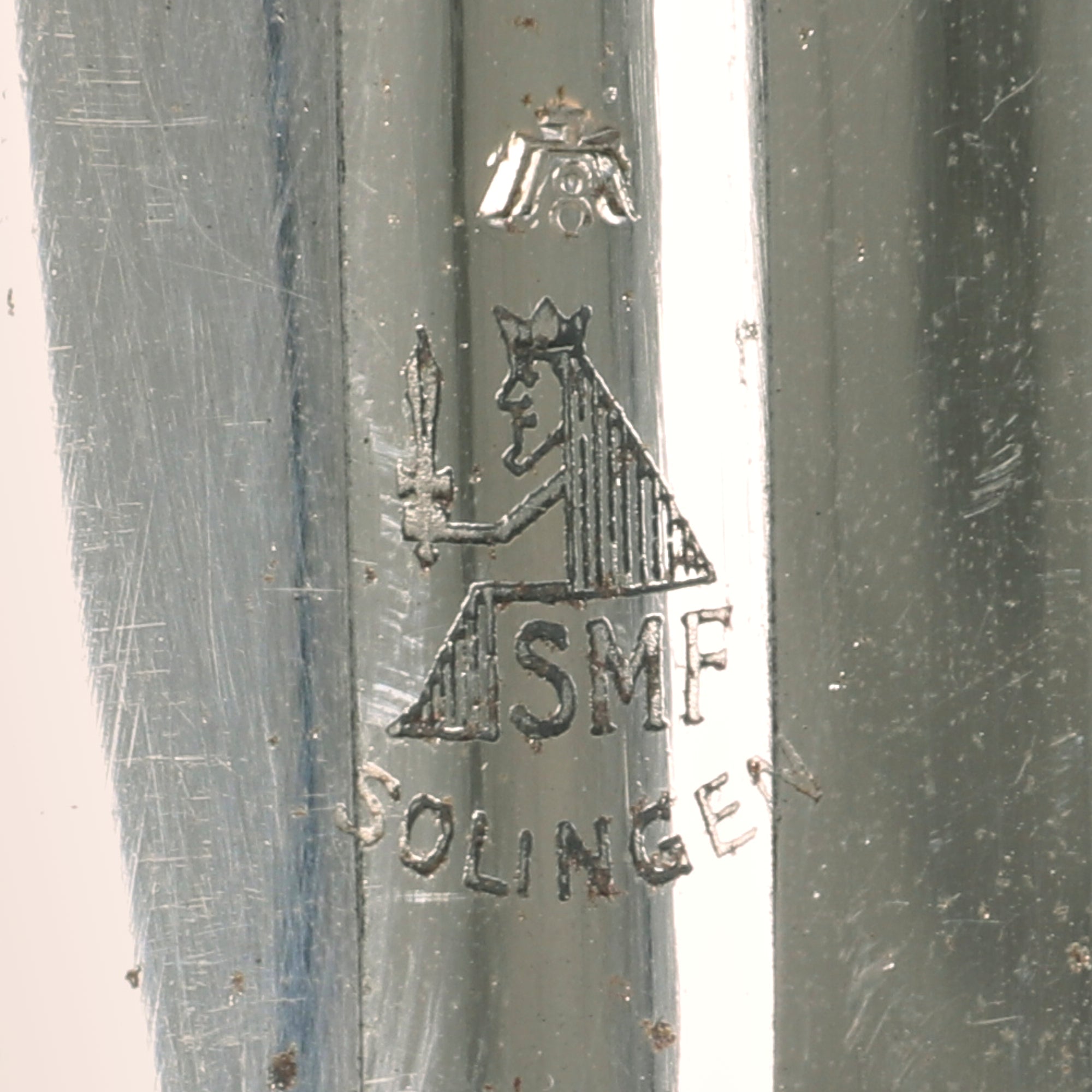 The reverse ricasso of this sword is marked with the SMF trademark logo, which features the etched king holding an upward pointing sword, and is known as the "Seated King". The king is sitting on the firm initials SMF and is positioned above an arch shaped town location SOLINGEN. Solinger Metalwaren-Fabrik Stöcker & Co. GmbH, also known as SMF, were one of the major suppliers of edged weapons to the Luftwaffe during WWII. As the name implies, they were located in Solingen, the legendary "City of Blades" in Western Germany. For more information, please see J. Anthony Carter's fine work GERMAN SWORD AND KNIFE MAKERS. Above the maker mark is a Luftwaffe Weimar-style "Stick Eagle" over inspection number 5, very commonly seen on Luftwaffe edged weapons.