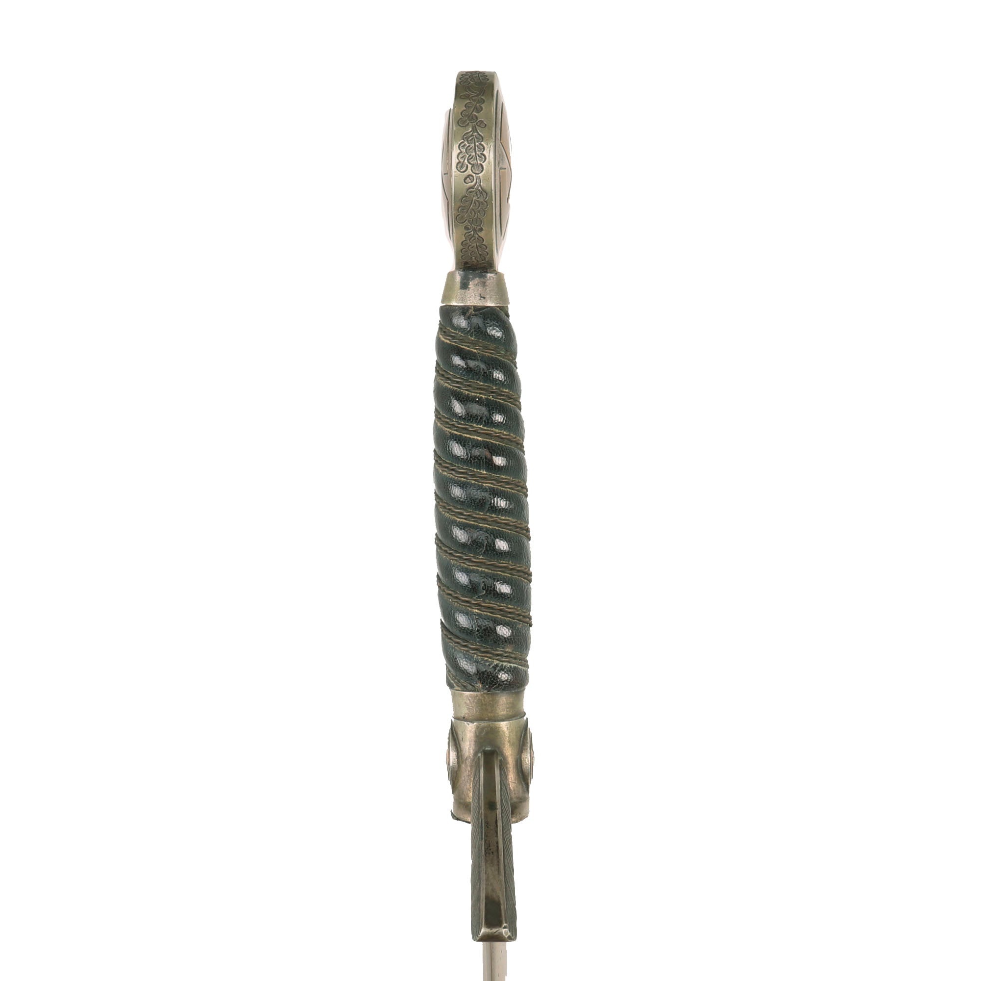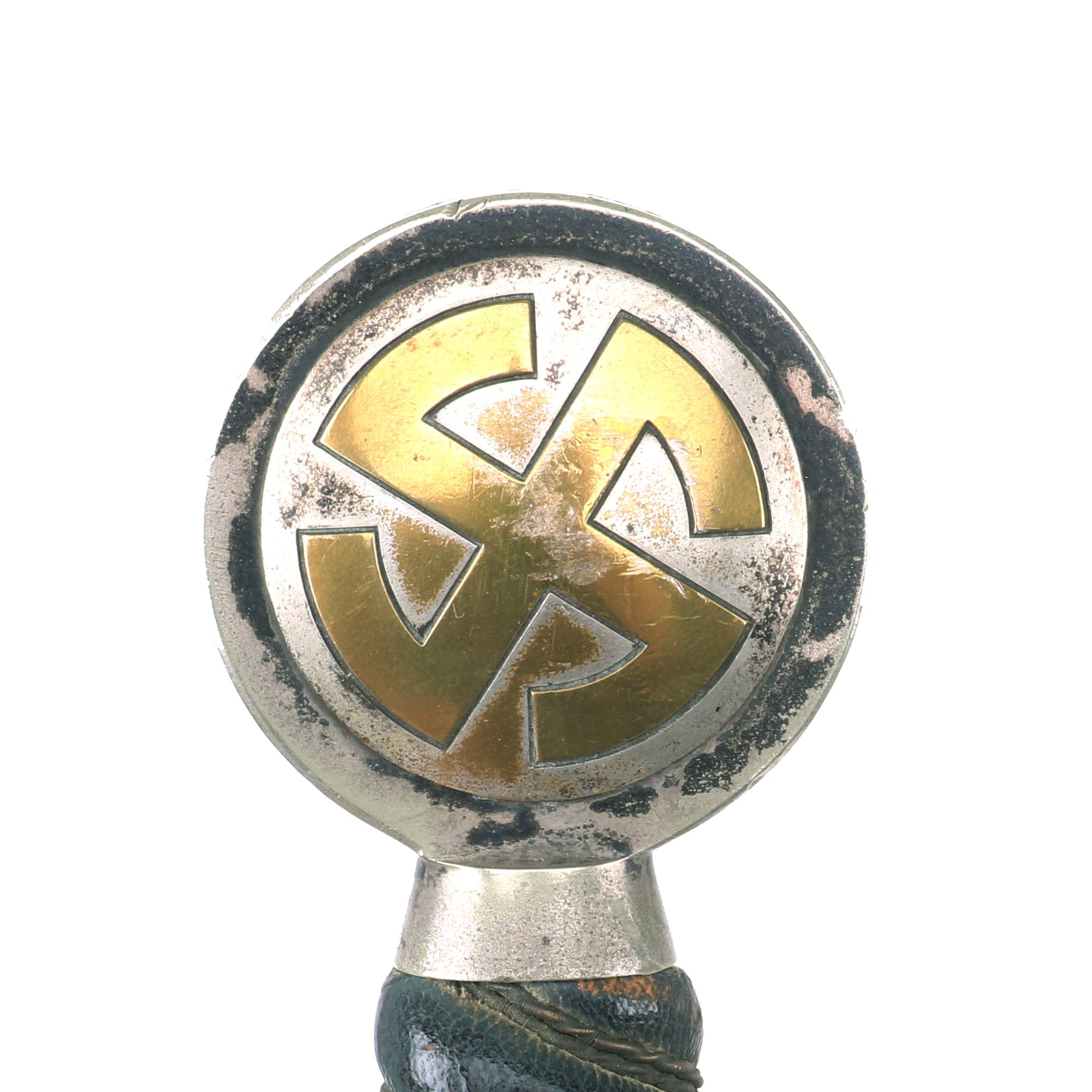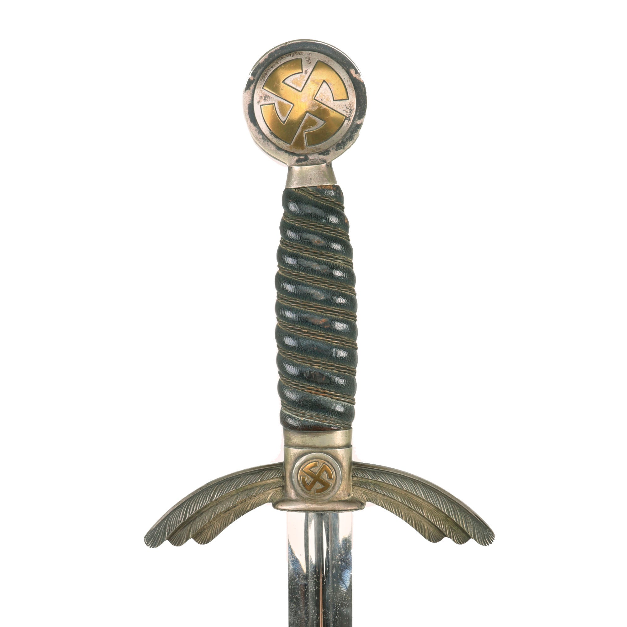 This early Luftwaffe Sword has very nice plated nickel alloy mounts, with brass caps for the "Sunwheel" Swas (hook cross) designs on the pommel. They do show some wear, with the plating between the "arms" of the swas on the pommel having worn away a bit on both sides. The nickel alloy rims around the pommel show just a bit of wear and denting, and still also retain some of the original oxide coating. They have very nice stamping to the oak leaves and acorns which run around the circumference. The lower cross guard sun wheels still have complete plating between the legs. The crossguards are nice and crisp and they both have good detail to the feathering of the downward pointing quillons, which still have a lot of the plating, showing a lovely patina.