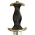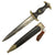 The SS Dagger was equipped with nickel crossguards with an ebony wood grip. The black grip contained a National eagle with swas insignia recessed in the center area and an SS sigrunne button inset at the top. On early examples the scabbard shell surface was factory blackened using a metal bluing process. The scabbard had nickel mounts. The SS blade was a polished type containing the SS motto, Meine Ehre Heißt Treue (My Honor is Loyalty). Early examples were mostly hand-fit. Production of later examples was more standardized, using cheaper, nickel-plated fittings with black painted scabbard shells. They could be held with a standard belt hanger, or a much rarer vertical hanger.