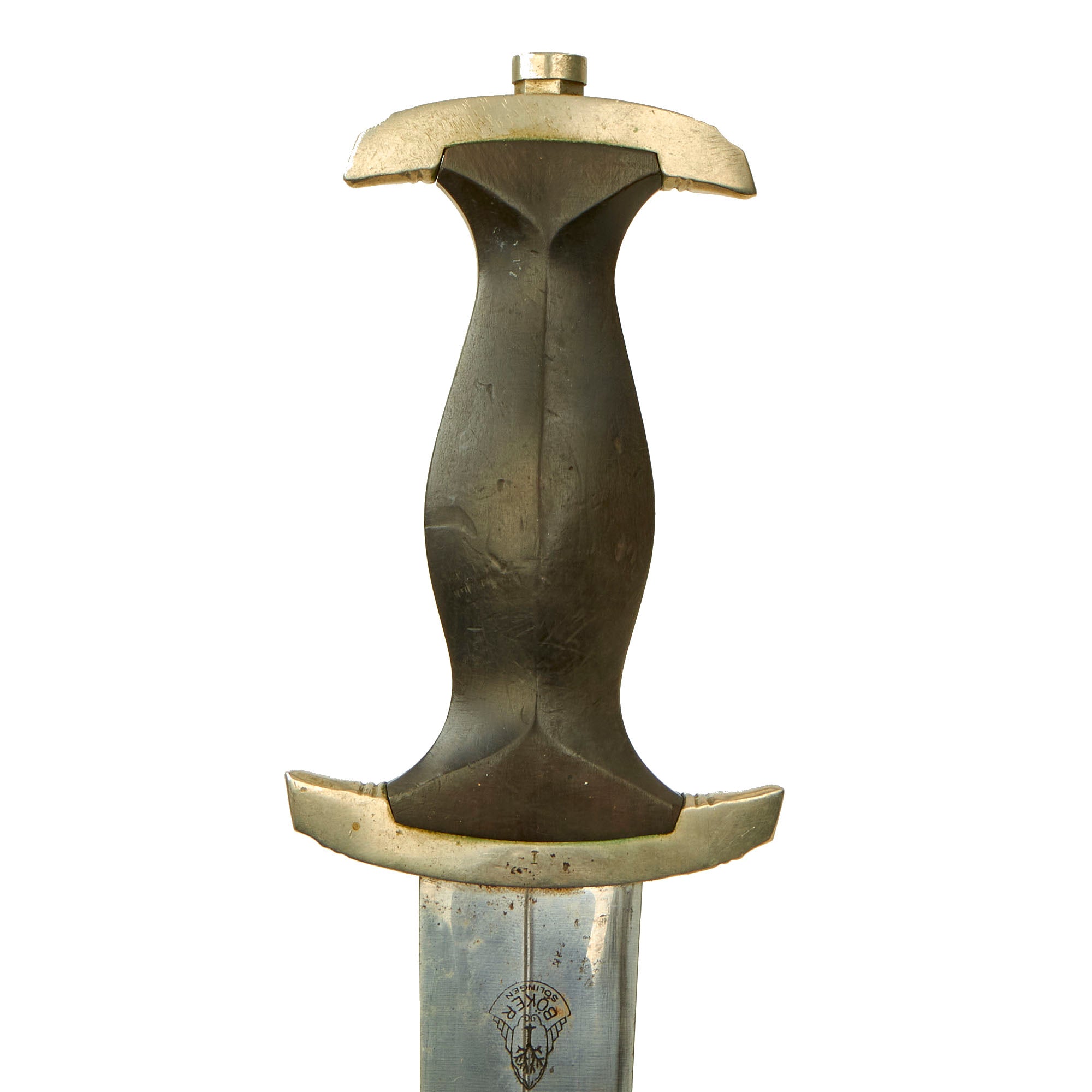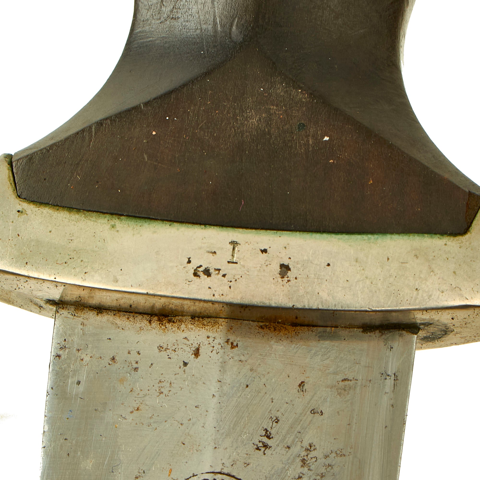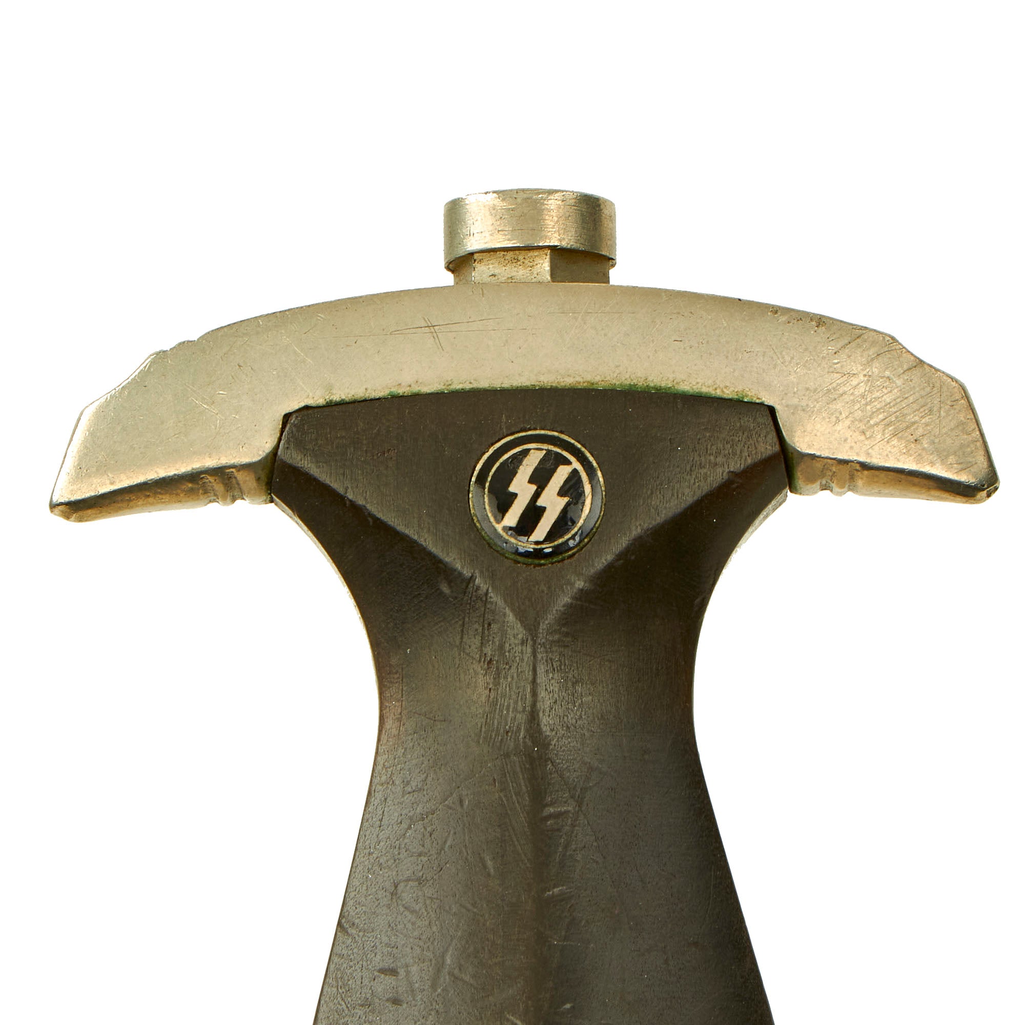 The guards of this dagger and tang nut are in good condition throughout, and are of the earliest solid nickel silver construction. They have smooth surfaces, good crisp edges and precise accent grooves. They show just a bit of oxidation, which gives them a "warm" look, opposed to the cold "blue" look of chrome plating. The cross guard is marked with a Roman numeral I on the side, for the first SS district. There is no lifting of the finish, showing these are indeed solid nickel silver. Per a customer request, we checked the inside of the guards, and the pommel guard is marked with the raised letters F and B, while the cross guard is marked with a large X and the number 18.