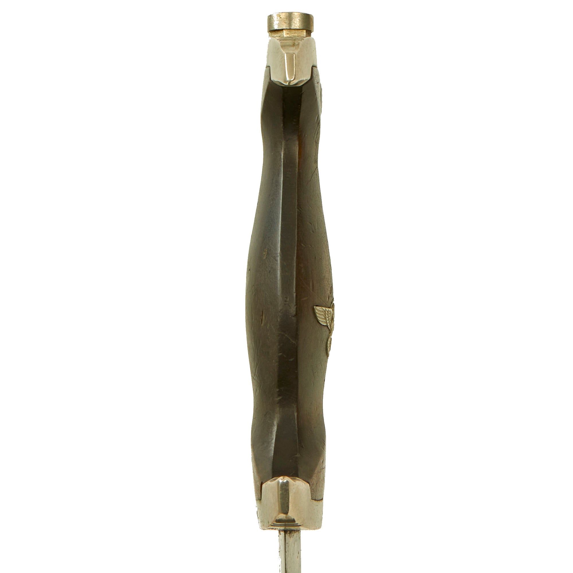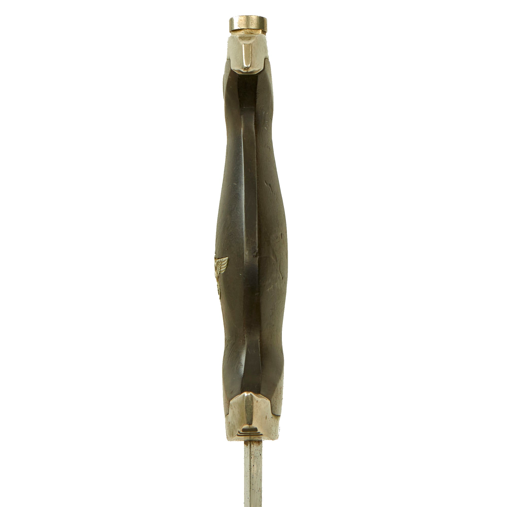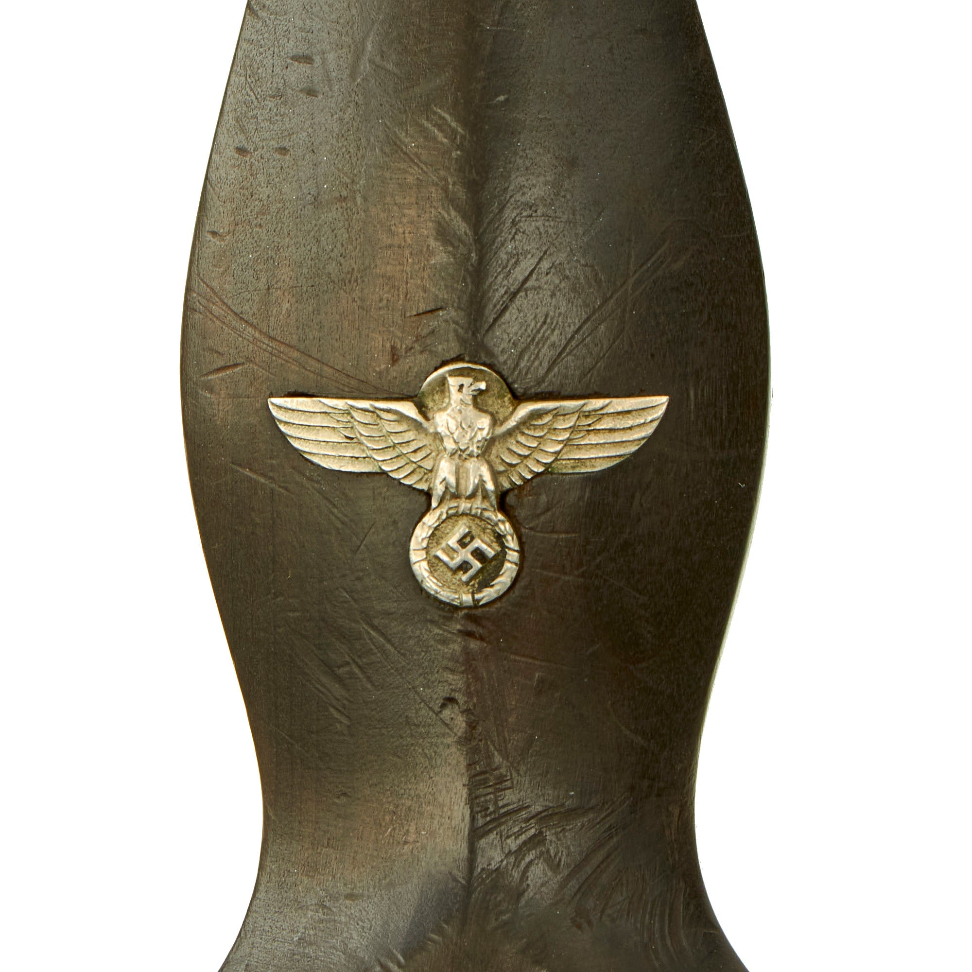 The ebony grip is a great example, the best we have seen in some time! The ebony wood used to make the grip is unfortunately brittle, and the treatment used to give it a uniform look exacerbates this. However on this example we cannot discern any cracks, and there is just the tiniest chip missing on the rear near the very edge next to the cross guard. The color is very good, and wood grain can be seen, which combined with the overall condition really makes this a fantastic grip. The symbol button is positioned at about 7:00 o'clock, as it should be. The silvered SS symbol and double circles around them have a nice matching patina with the nickel still intact, with a little verdigris and complete enamel. The nickel grip eagle is the "high-necked" type with the beak pointing slightly up. It remains in crisp condition, showing little wear to the bird's head, breast and wing feathering and to the talons, wreath or swas.