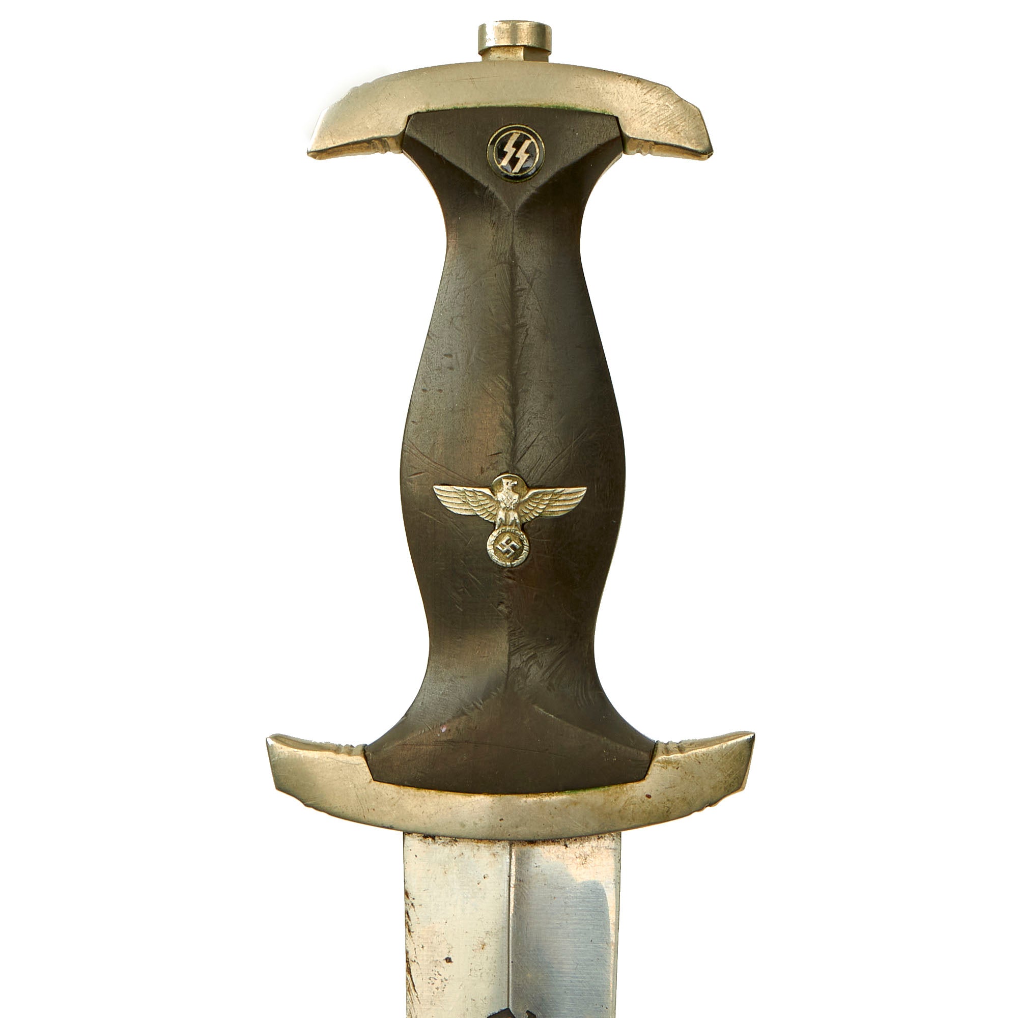 The SS Dagger was equipped with nickel cross guards with an ebony wood grip. The black grip contained a National eagle with swas insignia recessed in the center area and an ᛋᛋ doppelte Siegrune (Double Sig/Victory Rune) button inset at the top. On early examples the scabbard shell surface was factory blackened using a metal bluing process. The scabbard had nickel mounts. The SS blade was a polished type containing the SS motto, Meine Ehre Heisst Treue (My Honor is Loyalty). Early examples bore one of three district stampings on the lower reverse crossguard of I, II, or III. Early examples were mostly hand-fit. Production of later examples was more standardized, using cheaper, nickel-plated fittings with black painted scabbard shells. They could be held with a standard belt hanger, or a much rarer vertical hanger.