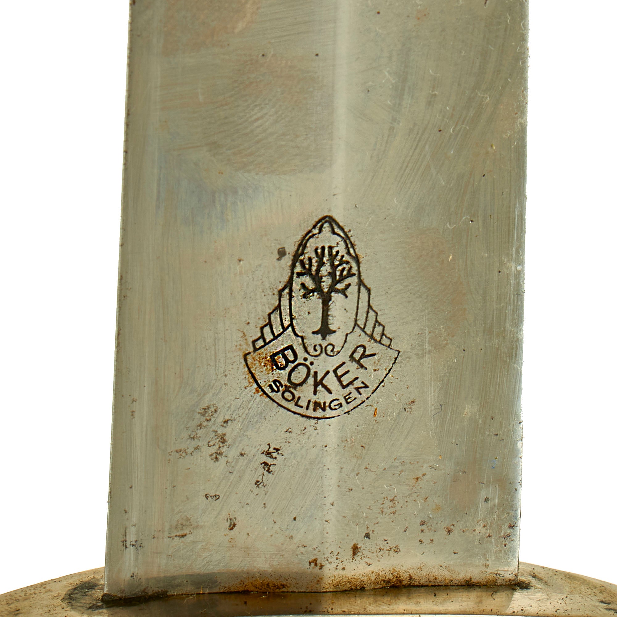 This is a great example of the early style of dagger, complete with a scabbard and rare vertical hanger! The blade is marked on the reverse with the Heinrich Böker & Co., Baumwerk famous "framed" Baum (Tree) trademark logo, with BÖKER / SOLINGEN at the bottom. The company is a famous and desirable manufacturer, founded in 1869 in Solingen, the legendary "City of Blades" in western Germany. They were a known producer of SS daggers during the Pre-WWII period and after, and we have had several examples from Böker before. The company exists today, and has a long and storied history of top quality blade production. Knives made by this maker are highly desirable, and extremely rare on the market. For more information please see GERMAN KNIFE AND SWORD MAKERS by J. Anthony Carter.