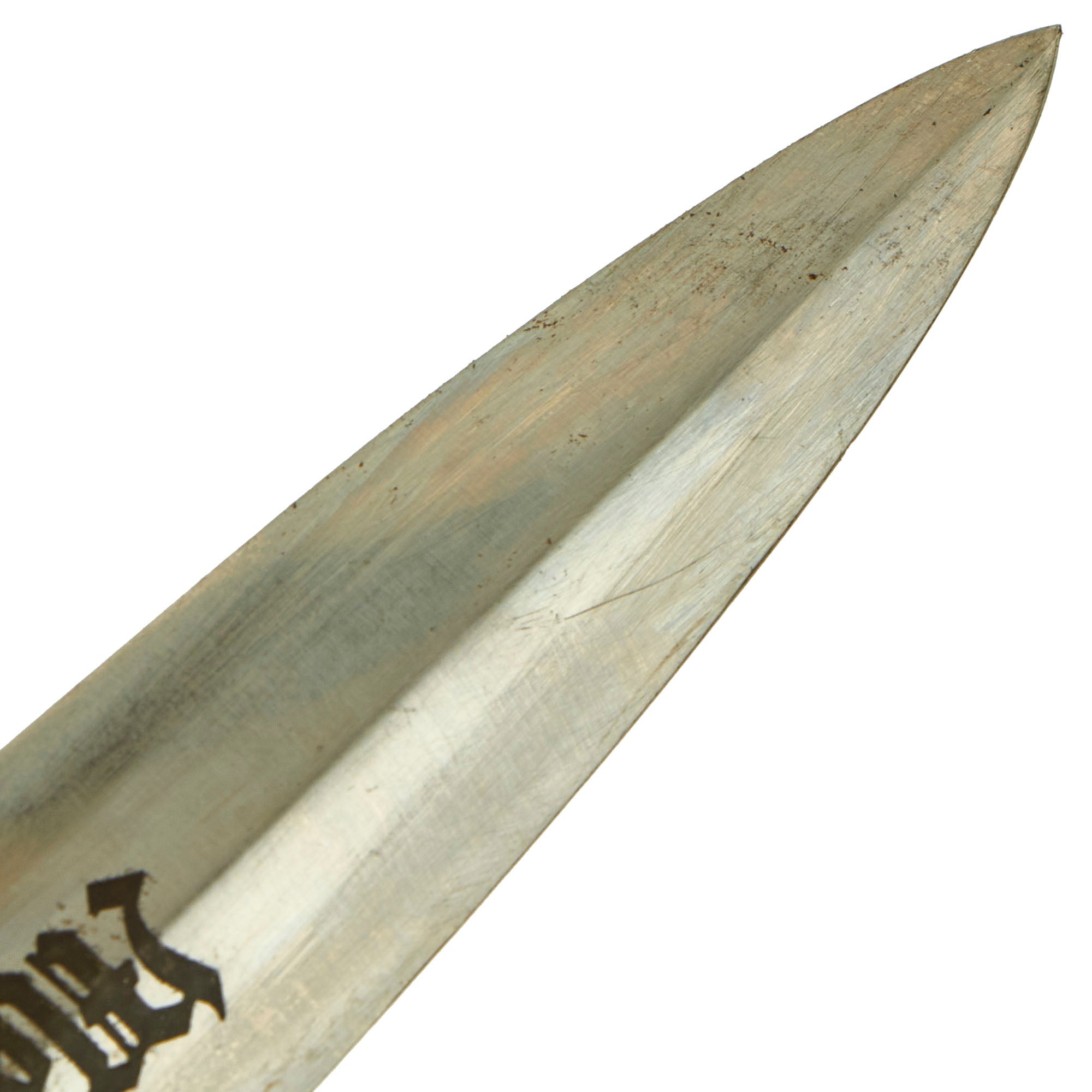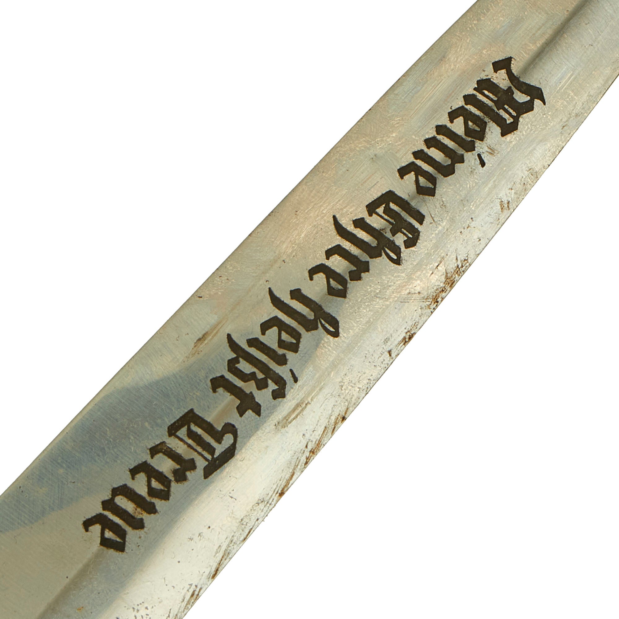 The blade on this example is in very good to excellent condition, and is a real gem! It still shows the original factory grind cross grain throughout the entire blade, except where it has been worn smooth by the scabbard runners. This texture is iconic, and is the definitive identifying characteristic for a real WWII German Blade. The blade is almost fully still bright, with just a bit of staining near one edge, and some overall scuffing and wear. The SS motto, Meine Ehre heißt Treue (Loyalty is my Honor) is crisp with little wear, still showing almost all of the original factory darkening. There is just the tiniest bend on the very tip of the blade point. The blade shoulders perfectly meet the lower cross guard contour, and is solid in the grip. Truly a wonderful SS dagger blade!