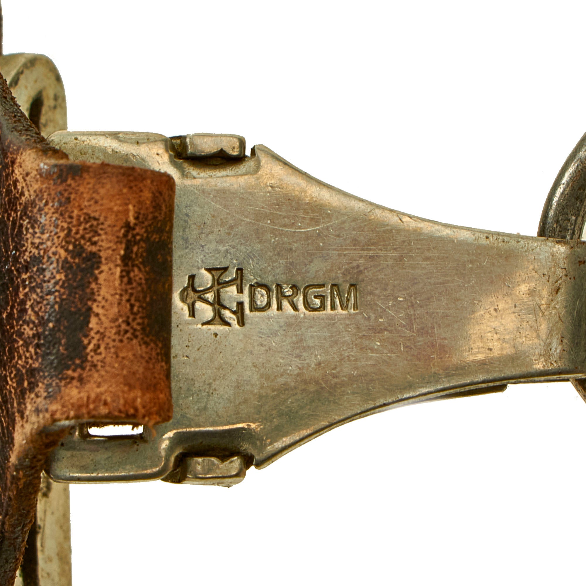 The scabbard is held securely in the extremely rare leather vertical hanger, topped with a nickel hanger clip, which is attached to a belt hanger with a plated steel loop. The leather is in very good condition, still supple without any tears or or major issues. It only shows wear and flaking to the finish, expected on an 80 year old leather item. These are extremely rare in any condition, but especially when they are fully intact. The nickel spring clip itself is marked with a "barred A" followed by D.R.G.M. (Deutsches Reiches Gebrauchs Musterschutz) - meaning it is a protected patented design under the Reich Government. This design was registered to the owner of the "Barred A" trademark, F. W. Assmann & Söhne of Lüdenscheid, a large maker of belts, buttons, and other accoutrements.