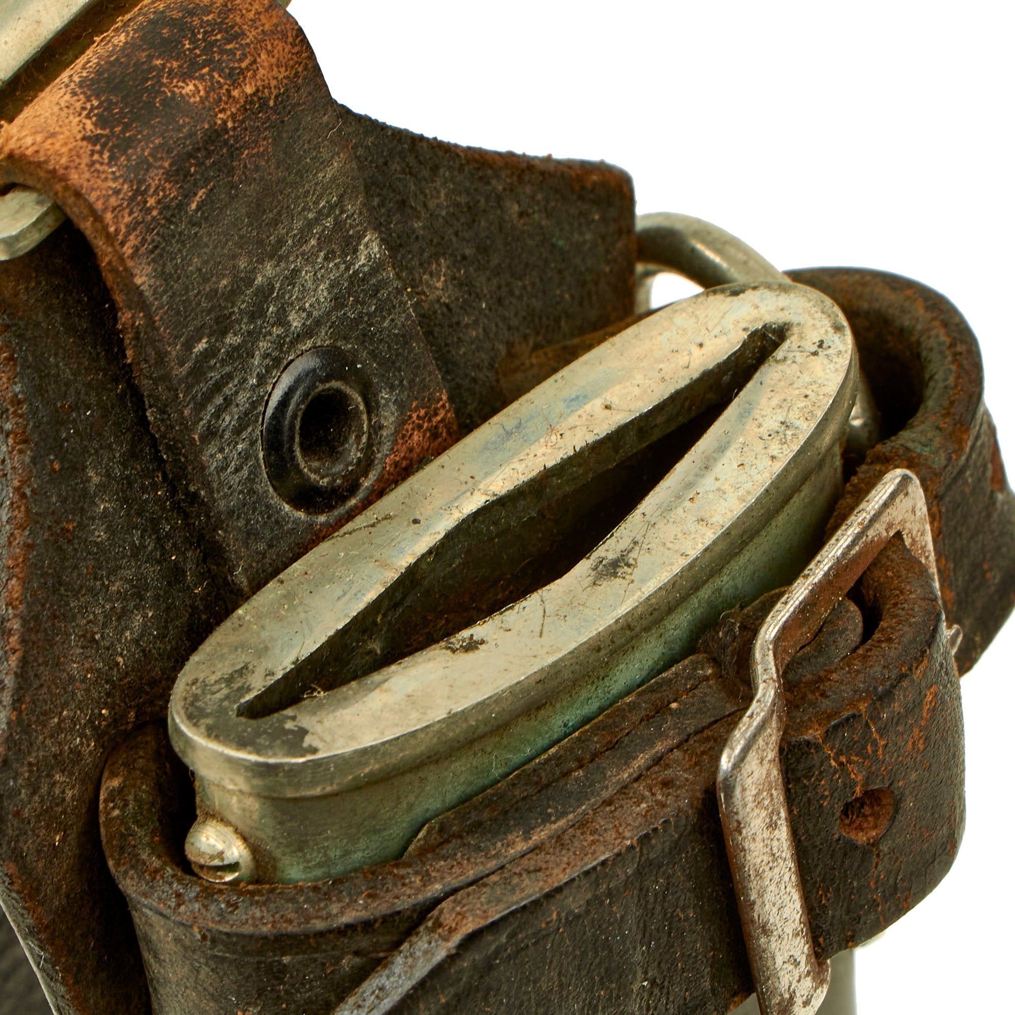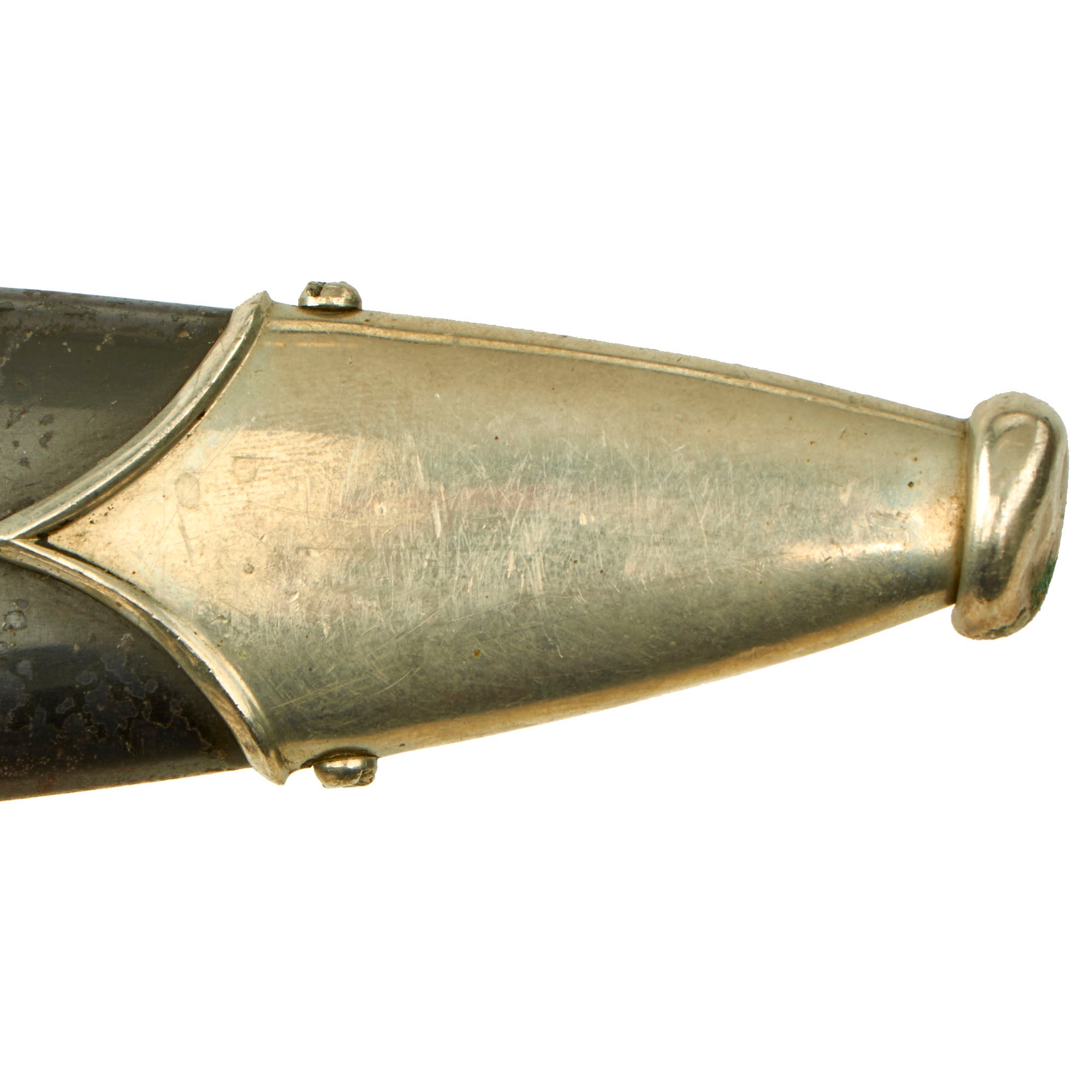 The scabbard shell is a very good example example, with a straight steel shell showing very little in the way of denting. The shell originally had a black "anodized" blued finish, which was then lacquered to protect it. This example has had about 50% of the lacquer wear / flake away, however the anodized finish is still very well retained overall, which we rarely see. There is some wear, with just a few areas of oxidation, but this is really a great looking scabbard. The matching solid nickel silver scabbard mounts are in good condition, with a lightly oxidized patina. The lower ball is dented in, common with the softer nickel alloy, and it looks like it was dropped, which pushed up the bottom fitting a bit. All four nickel dome-headed screws are present and show no turning.