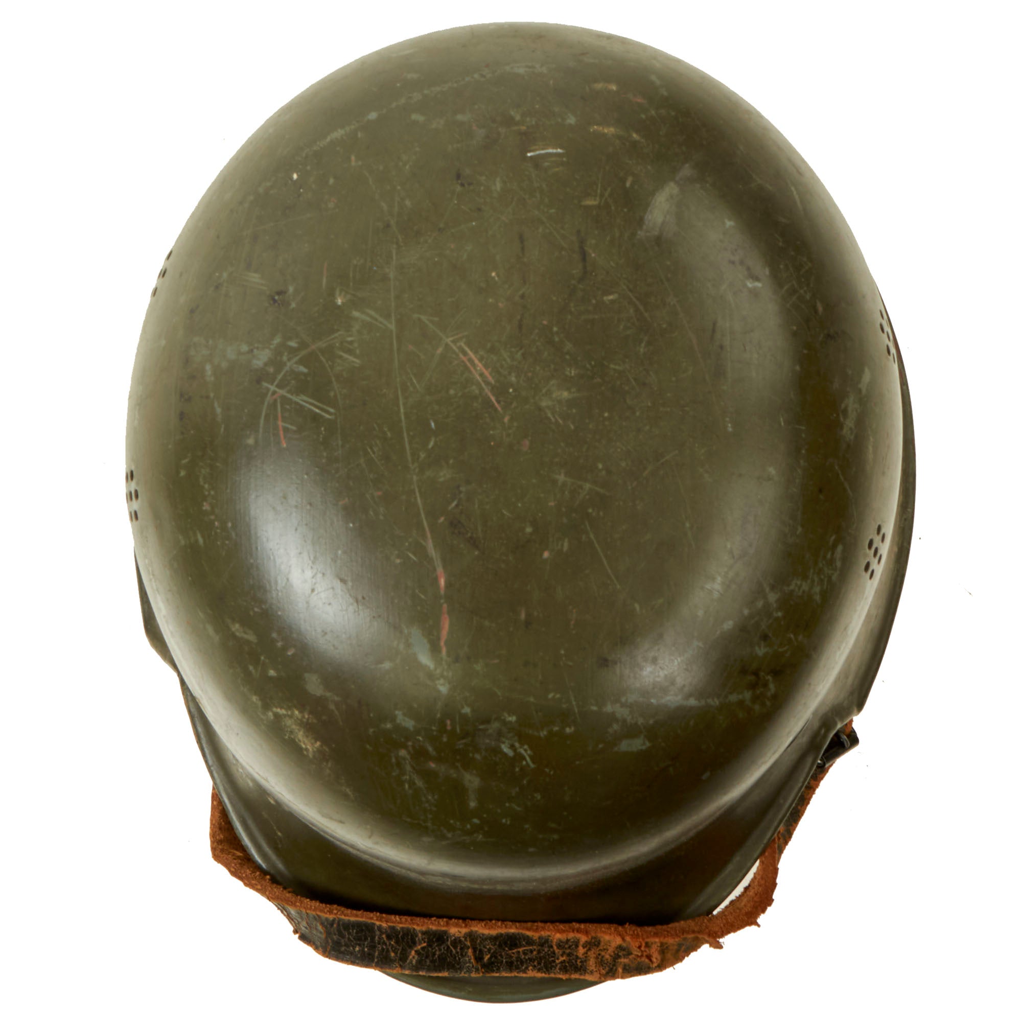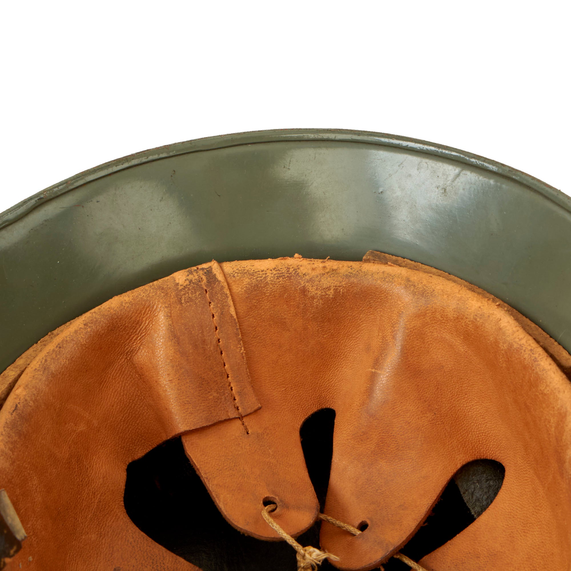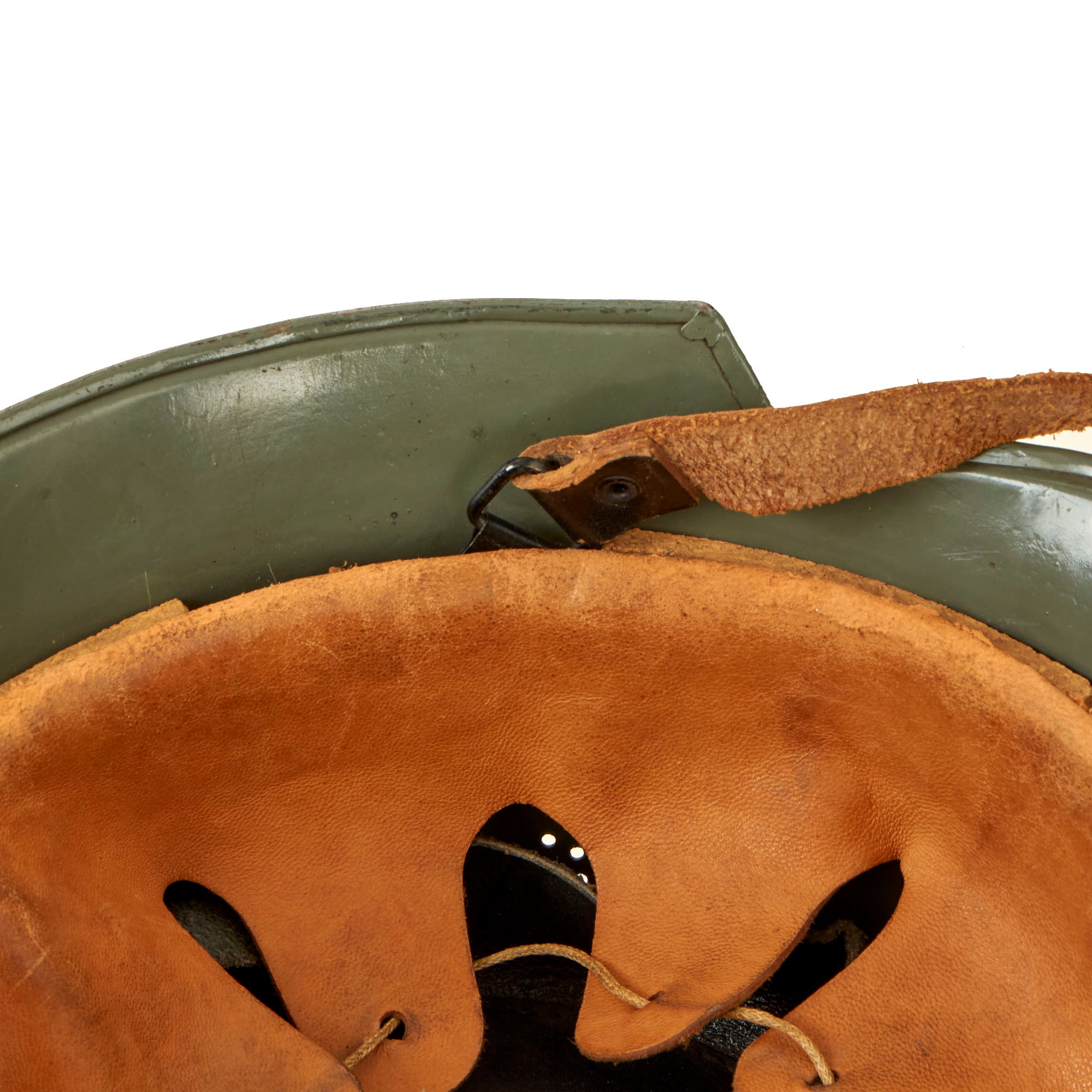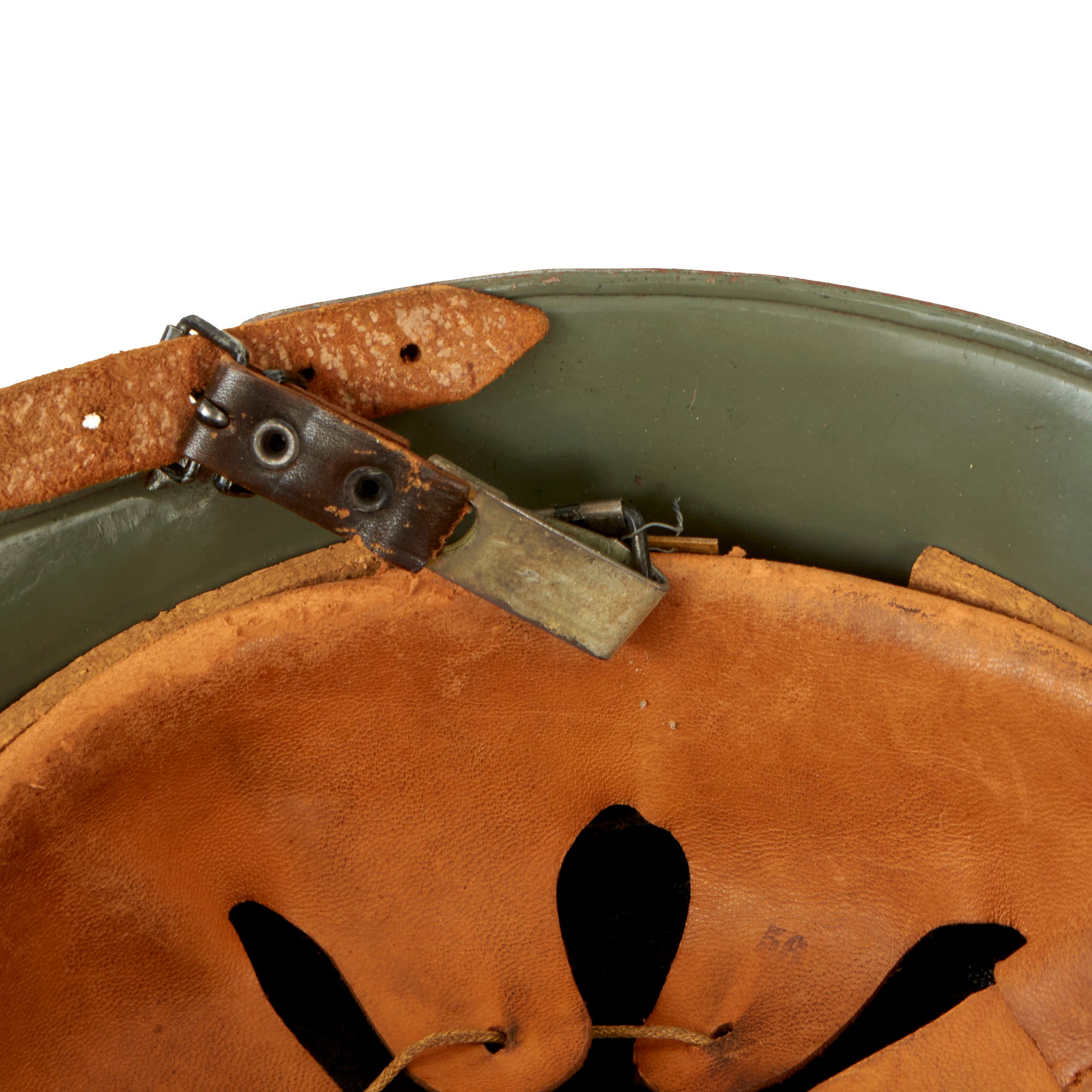 The four hollow liner rivets are still present, retaining the green paint well, and all four still have the cork spacer washers around the interior. The original leather liner is still present, and is an m-31 style with a fiber band and eight intact fingers, with the top tie string still present. It shows only light wear, with some dry rot around the edge, and all 5 of the leather attachment points for a leather neck guard are present, though they have been folded down against the liner. The chinstrap is complete and intact, but definitely shows wear from service, now being in delicate condition.