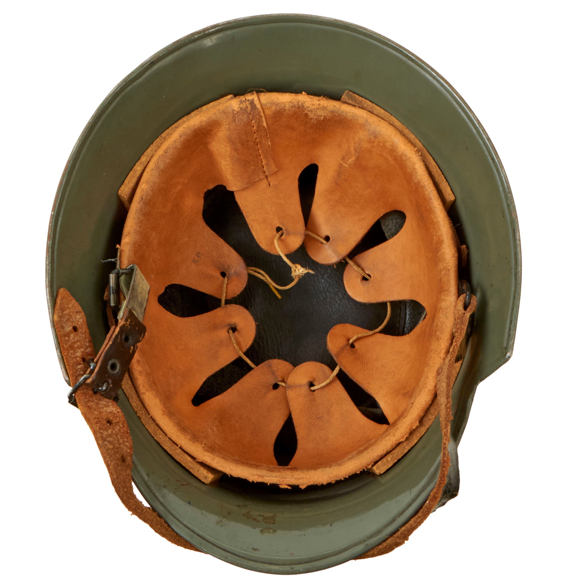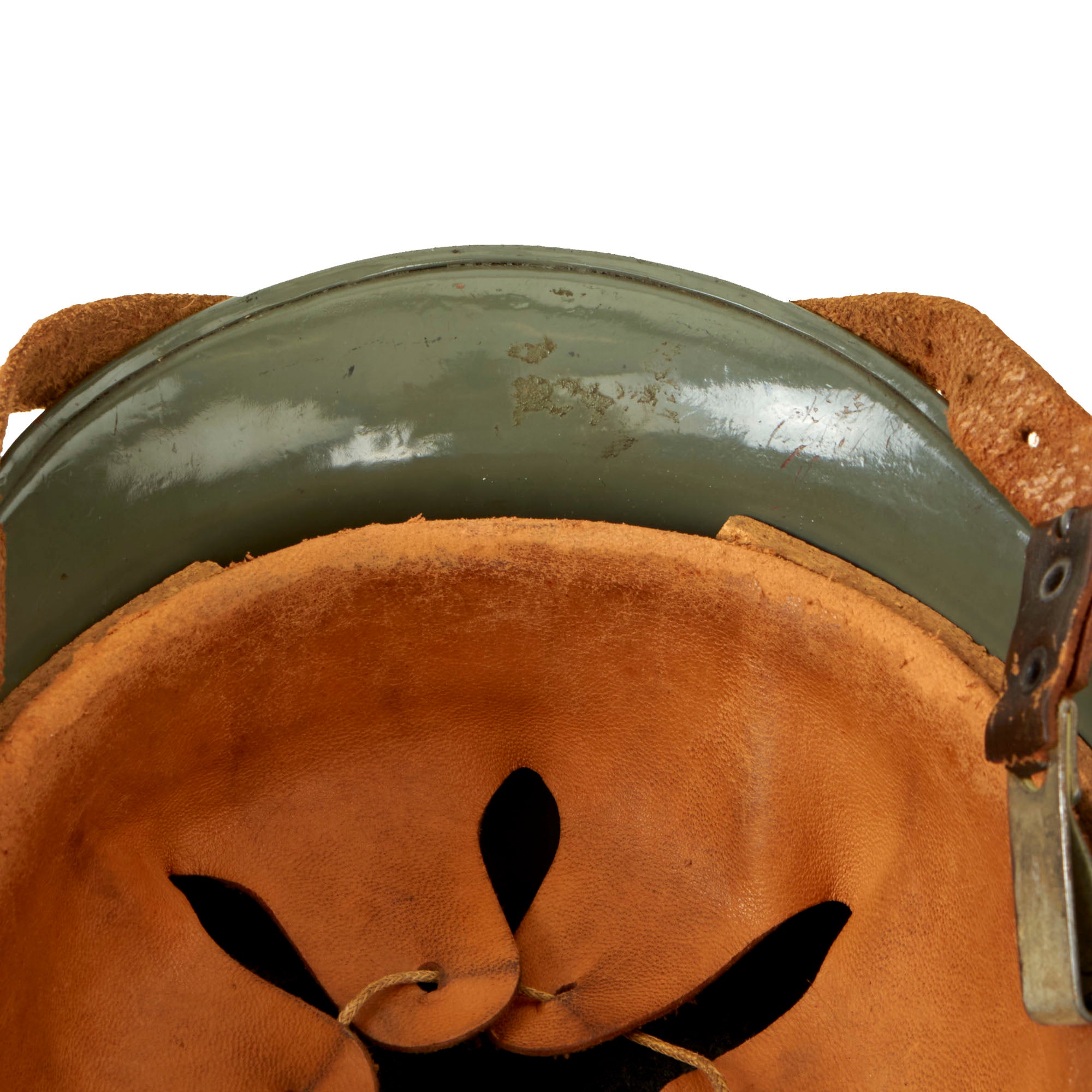 Original Item: Only One Available. This is a very nice genuine steel construction M34 Civic "Square Dip" Third Reich helmet, outfitted for German WWII Luftschutz Civil Air Defense use. Unlike the usual blue paint we see on these, this example is painted green, and this was applied over a gloss gray paint. We believe that this was originally used by another organization, such as the DRK German Red Cross, who used gloss gray, and then was pressed into service sometime in the later 1930s or 40s to use during air raids. The Luftschutz officially only were issued these helmets from 1935 until 1935, when a specific design was made, so while it was possible that it was originally issued then, we believe it was later, which is definitely not uncommon at all.