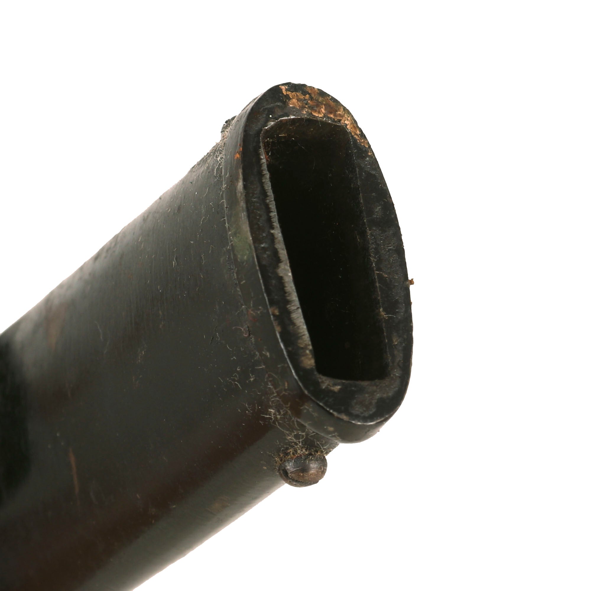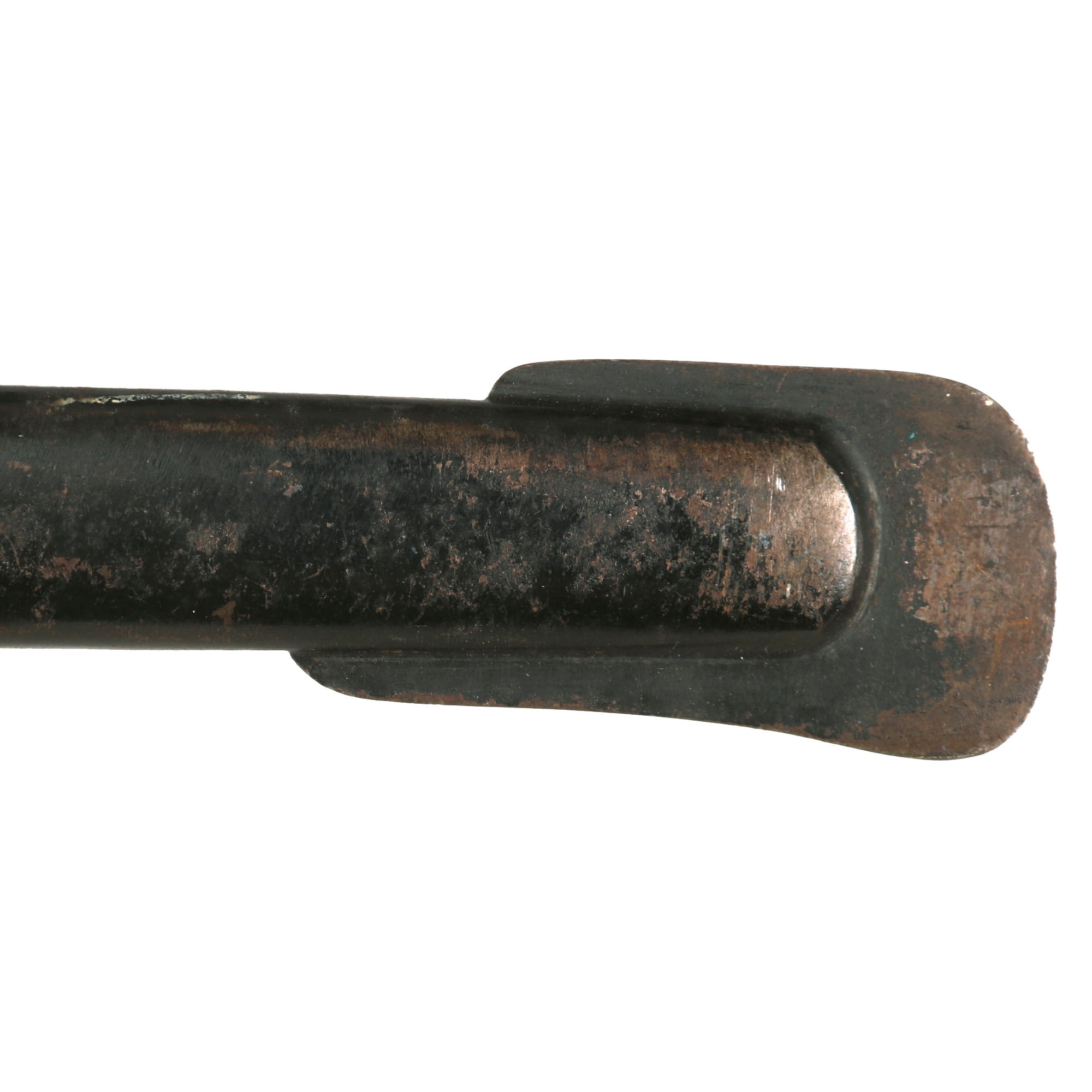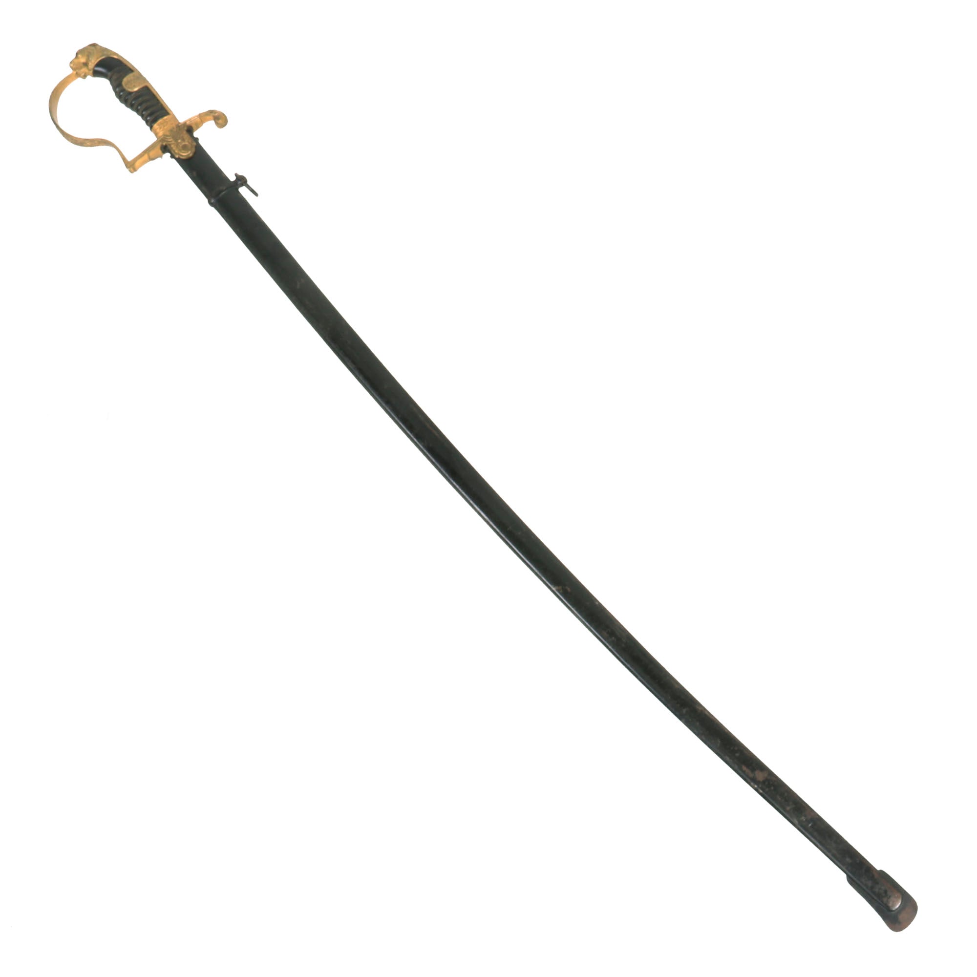 The scabbard of this example still has good original factory black lacquer, which is retained at about 75%, showing some degradation and oxidation overall. There is the expected checking and crazing in the finish, and the steel body also shows a bit of a "dog leg" bend near the center, which does not interfere with sheathing the blade. The sword retains the original hanger ring as well as the rectangular loop for "hitching up" the sword.